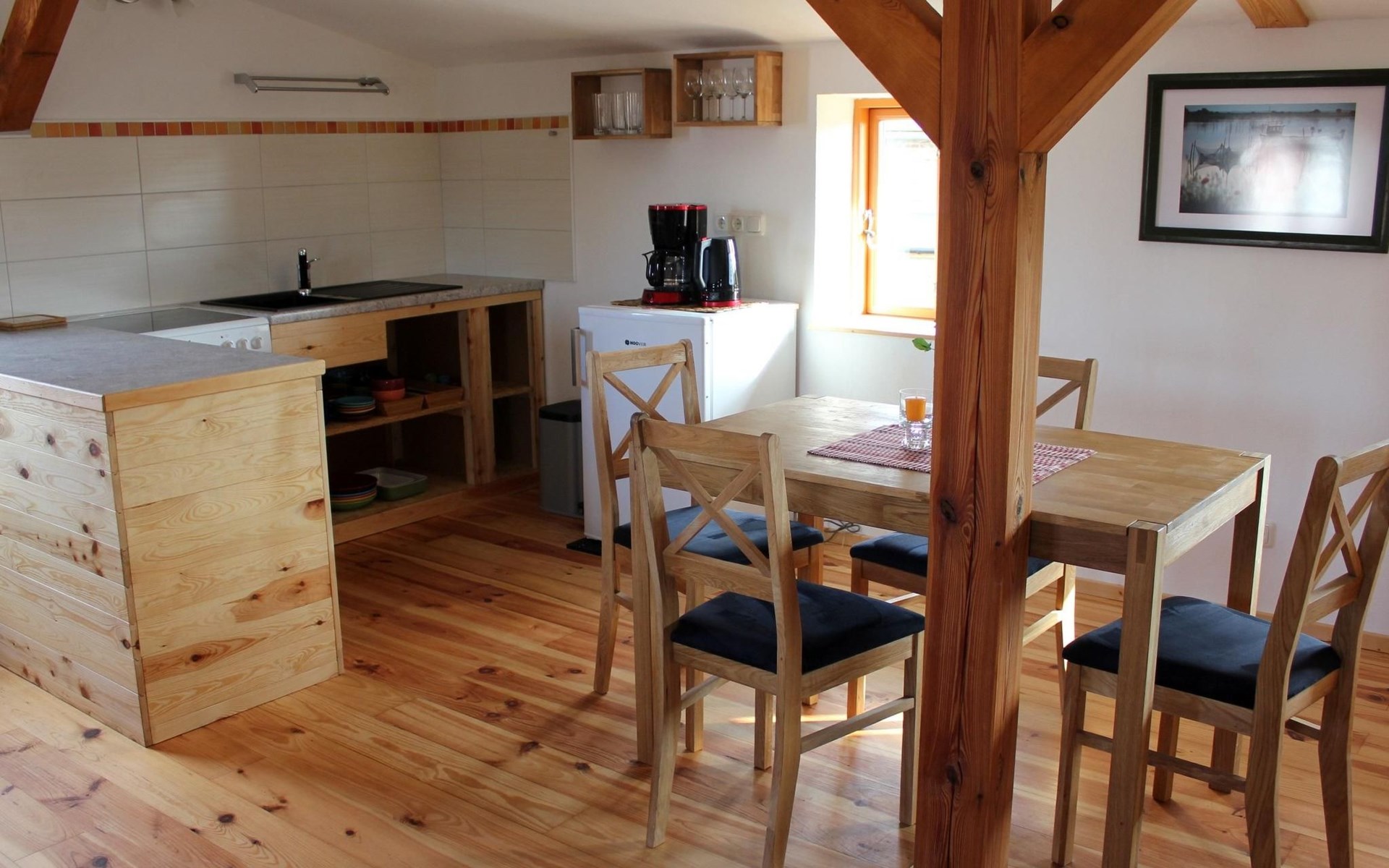 Die offene Küchenzeile ist bestens ausgestattet mit Herd, Backofen, Kühlschrank (inkl. Gefrierfach), Kaffeemaschine, Toaster, Wasserkocher und allem, was man zum Kochen braucht.