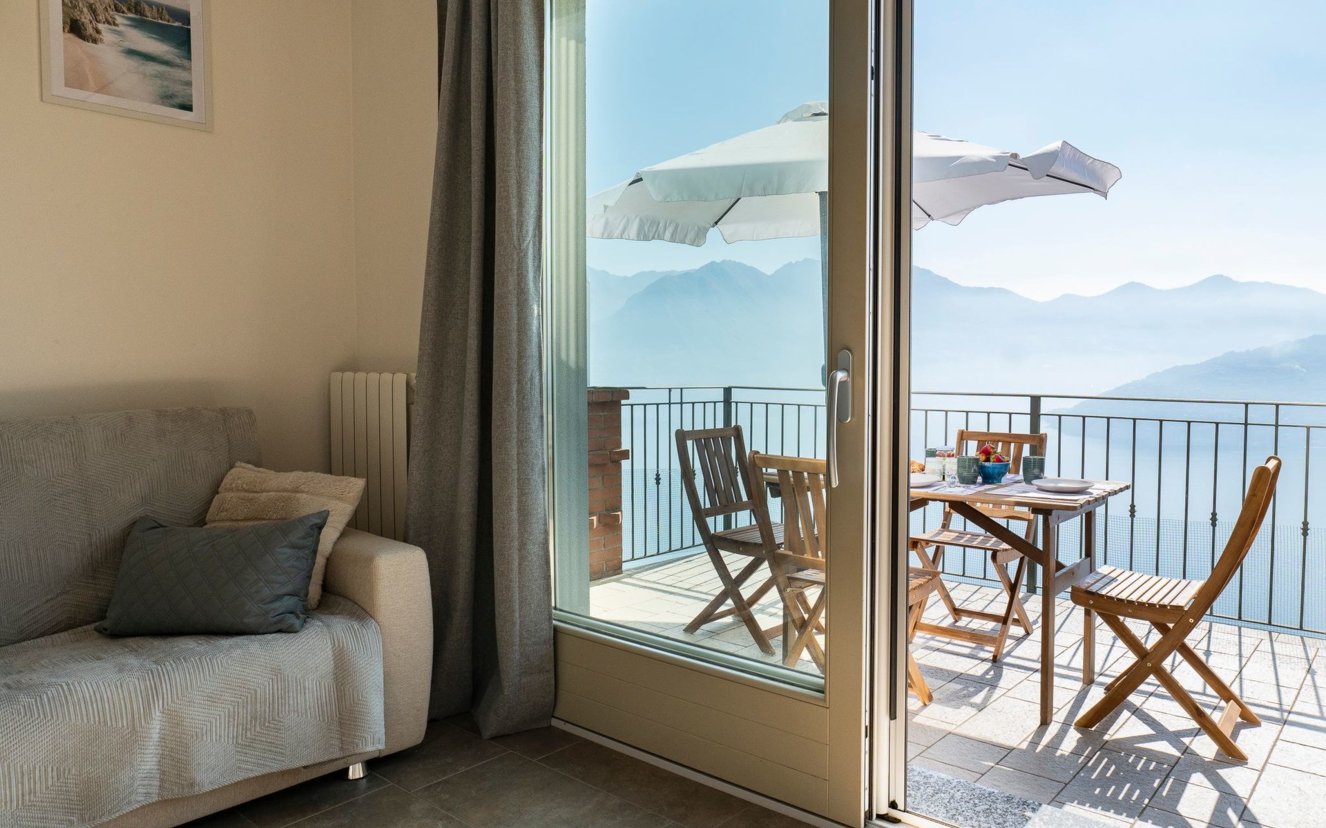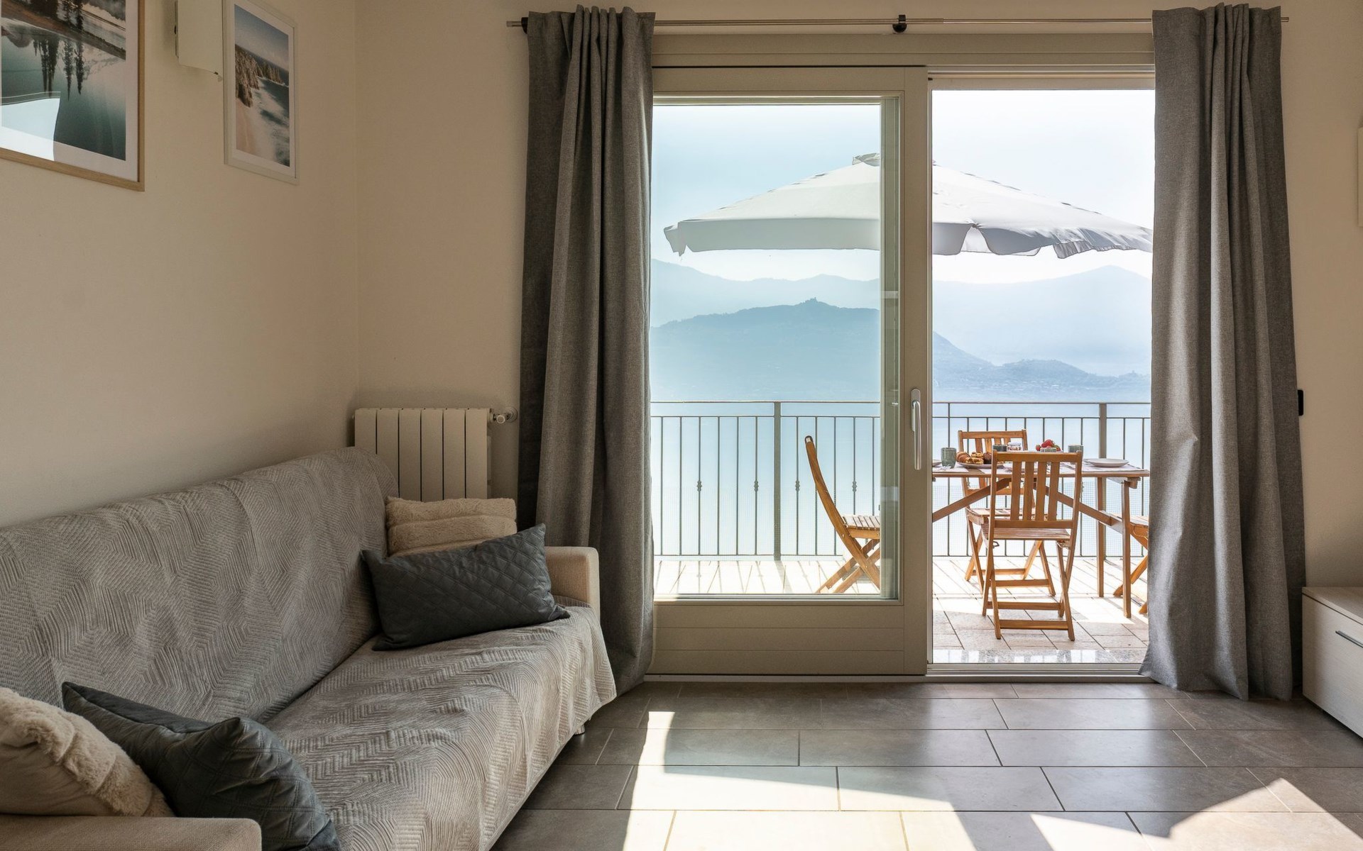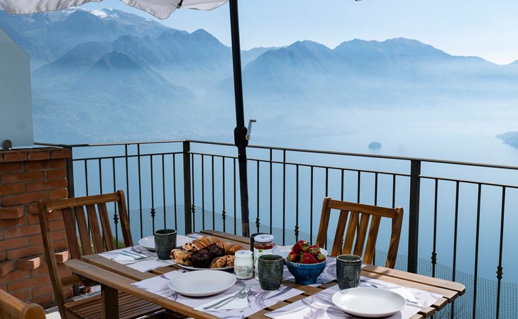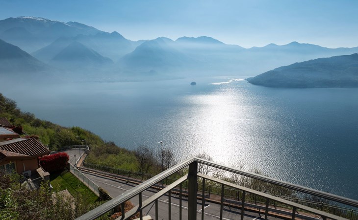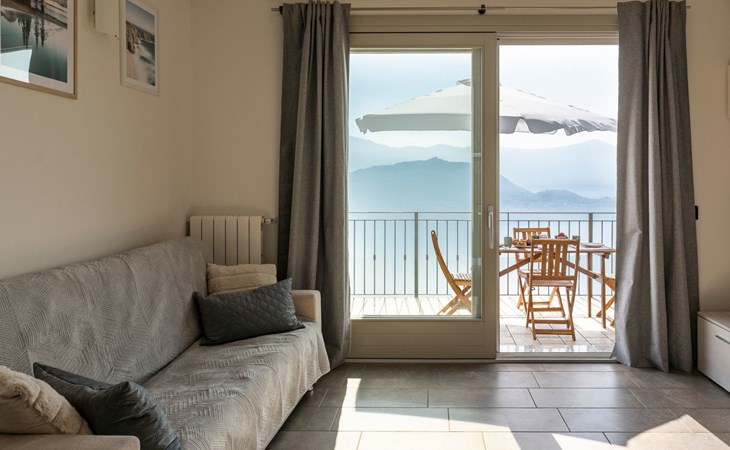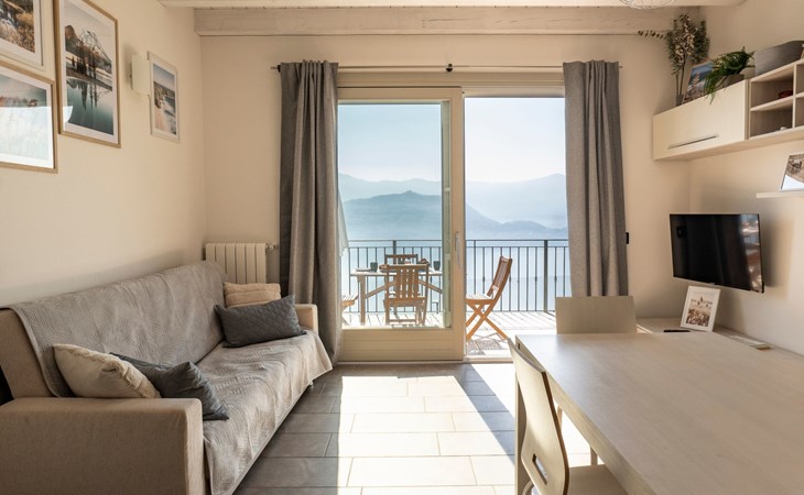 Das Vorhandensein von natürlichem Licht ist ein weiteres wichtiges Element. Die Wohnung ist nach Südosten ausgerichtet und erhält von morgens an Licht durch die großen Glasfenster: die Fenster in den Schlafzimmern, die große Fenstertür im Wohnzimmer, die auf die Terrasse führt. Diese ist, wie Sie auf den Bildern sehen können, ein Sprungbrett ins Blaue: ein echter zusätzlicher Raum bei schönem Wetter, der es Ihnen ermöglicht, im Freien zu speisen - dank der vorhandenen Möbel - oder sich zu entspannen, während Sie die unglaubliche Aussicht auf den See und die umliegenden Berge genießen.