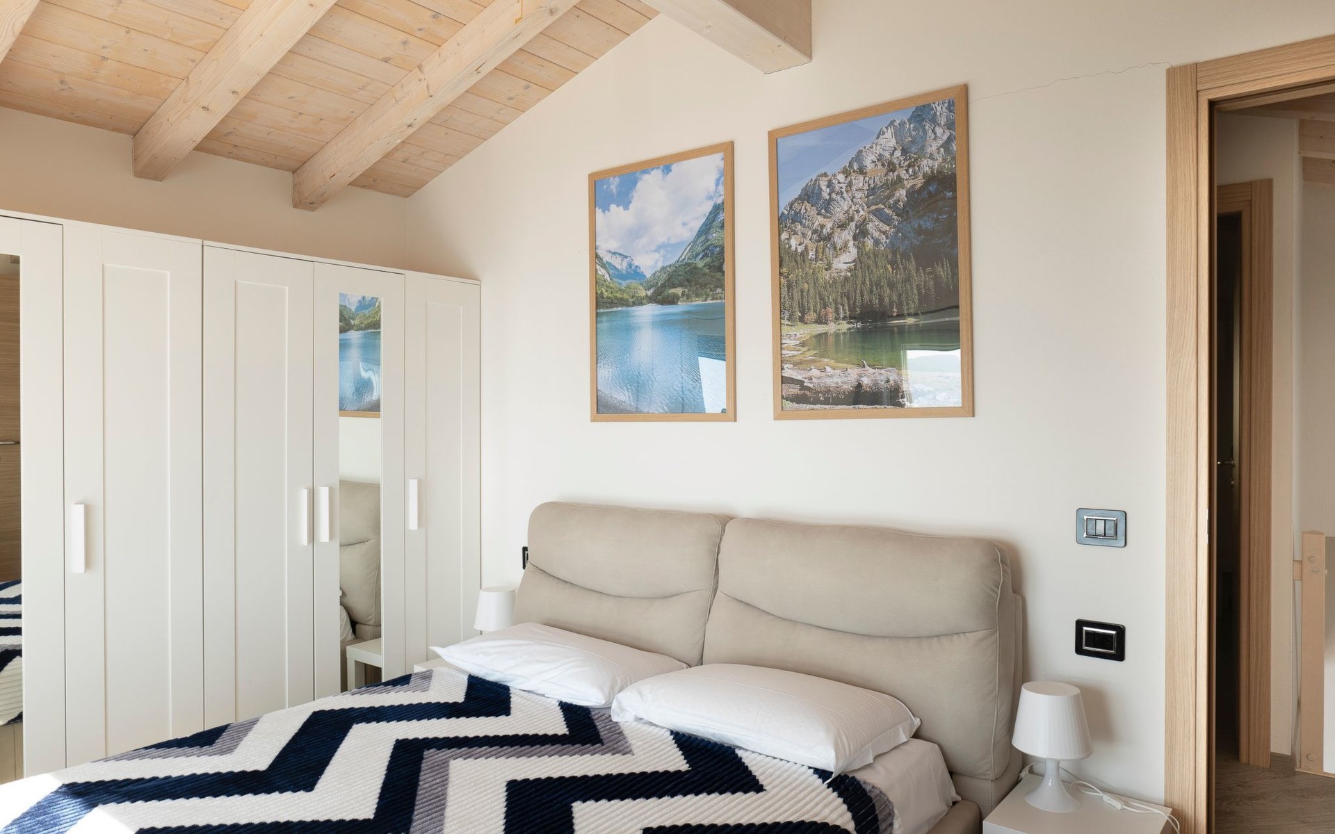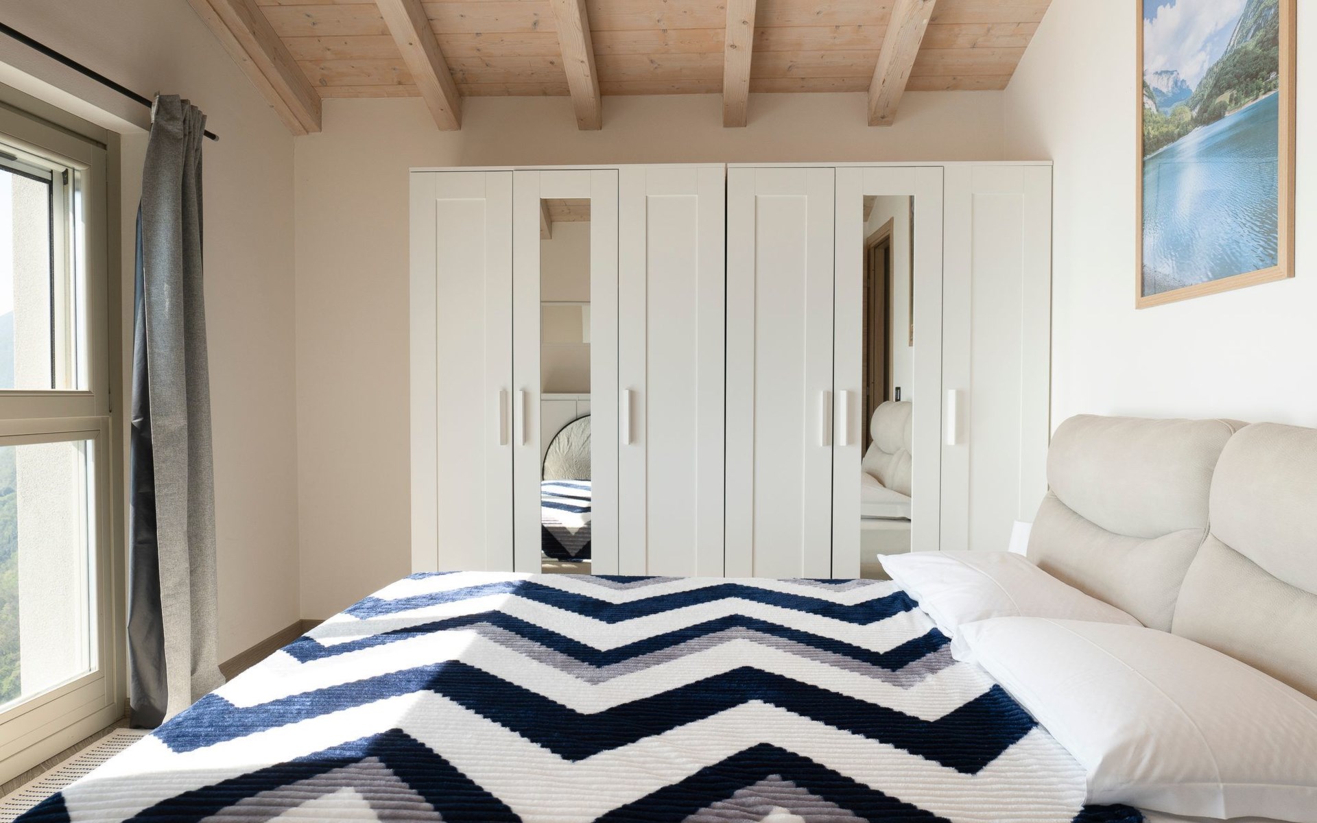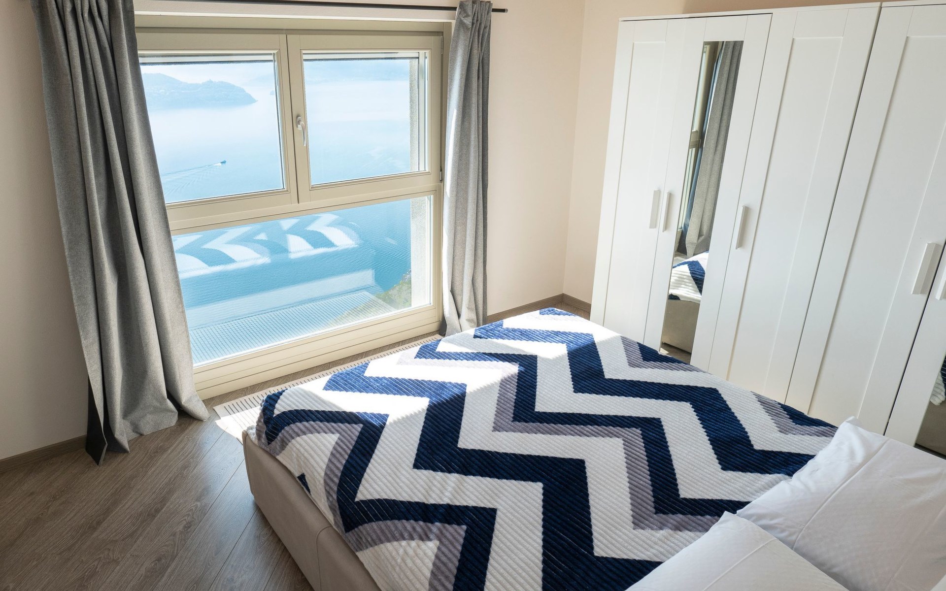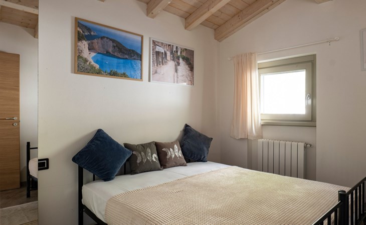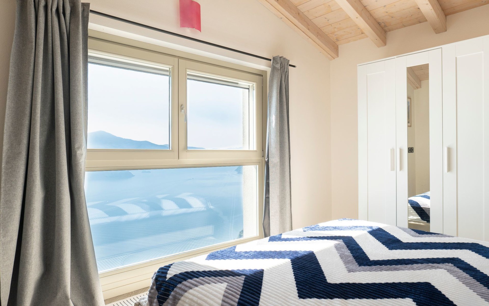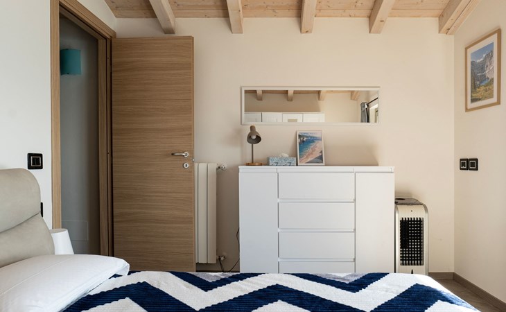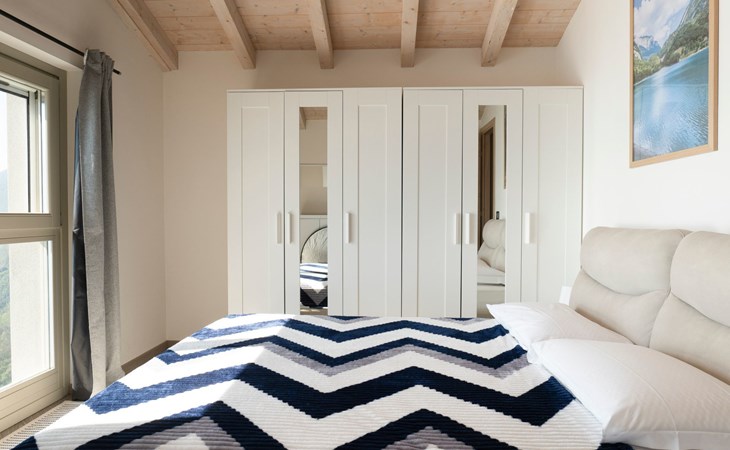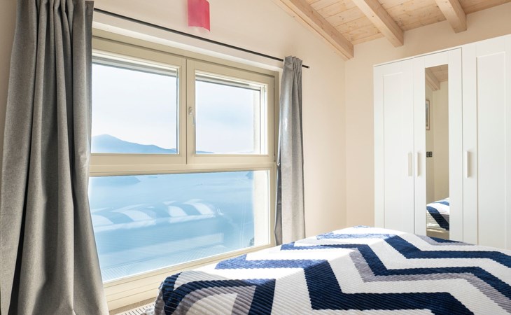Im Obergeschoss, das auch den Vorteil hat, dass der Wohnbereich vom Schlafbereich getrennt werden kann, befinden sich die beiden Schlafzimmer. Beide sind mit Kleiderschränken, Spiegeln und Doppelbetten ausgestattet. Vor allem eines der beiden hat eine außergewöhnliche Fensterfront vor dem Bett, die bis zum Boden reicht: Von hier aus fällt es leichter, vom Fliegen über den See zu träumen.