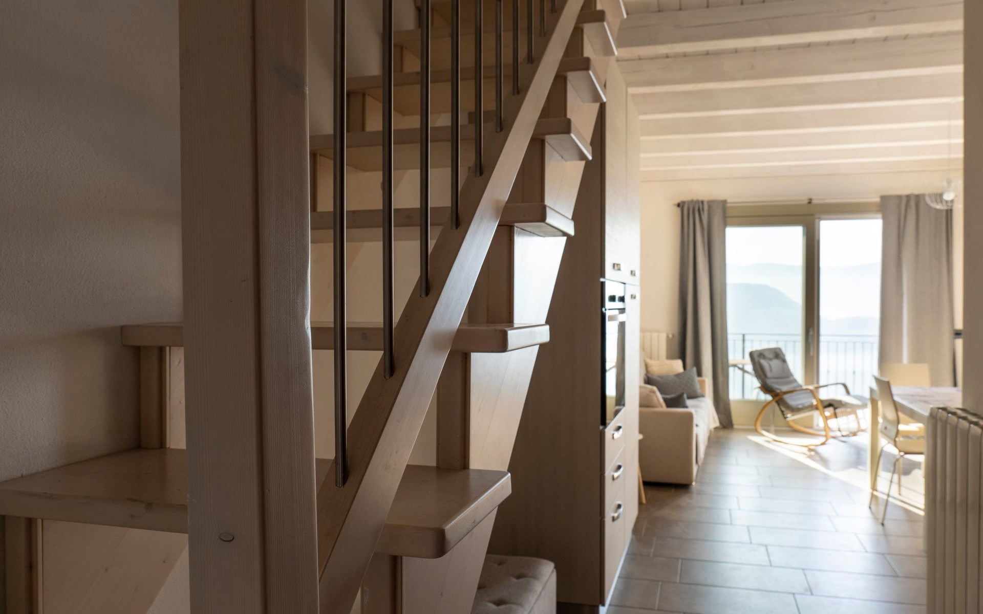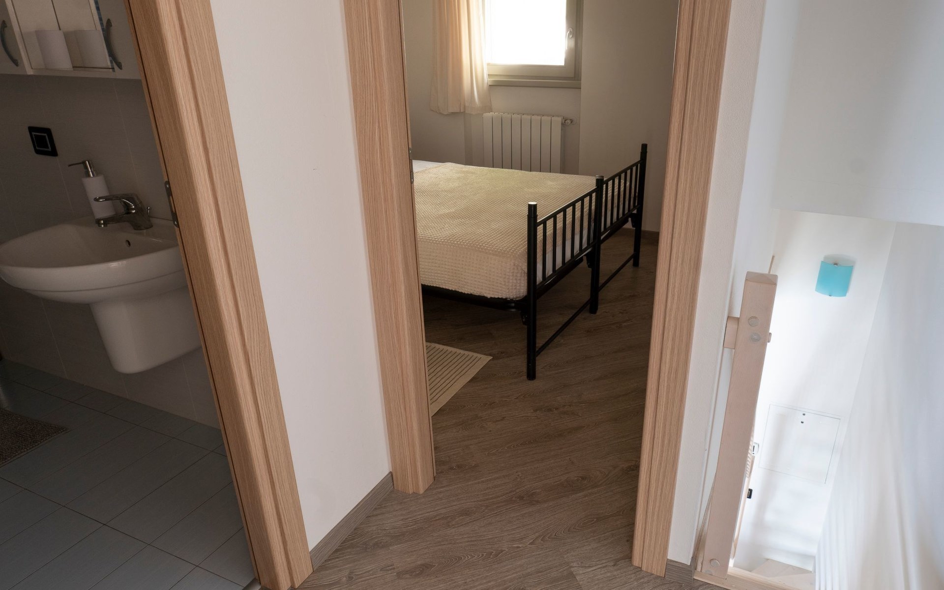 Auch die helle Holztreppe, die zu den Zimmern führt, geht in diese Richtung.