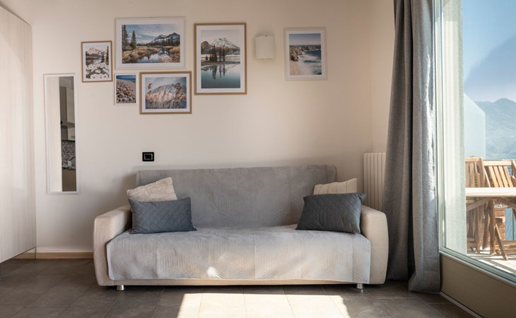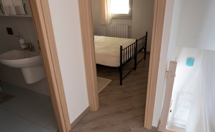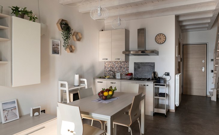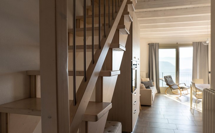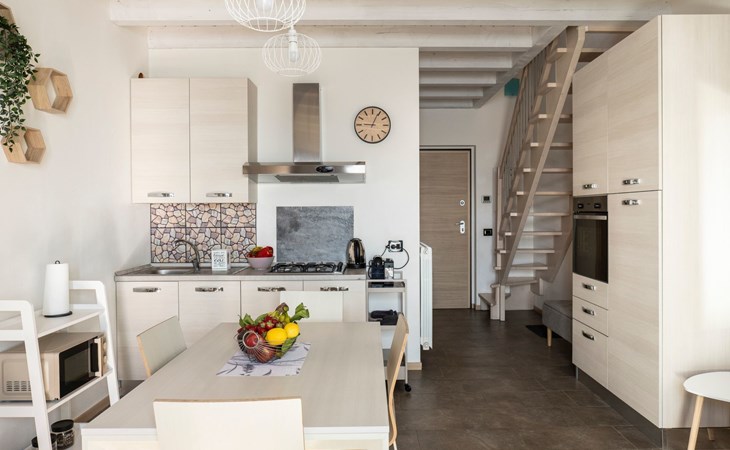 Bei der Vorstellung der Dreizimmerwohnung Cherubino 2 fällt es schwer, die Stärken hervorzuheben: Diese Ferienwohnung mit Blick auf den Iseosee hat wirklich alles, was eine Familie oder zwei/drei befreundete Paare für einen Urlaub brauchen. Zunächst einmal das Platzangebot: 65 m2, gut verteilt auf zwei Etagen, mit dem Wohnzimmer mit offener Küche und dem ersten Bad im Erdgeschoss und den beiden Schlafzimmern und dem zweiten Bad im Obergeschoss.