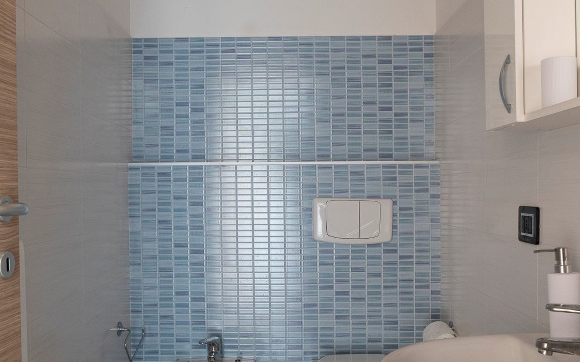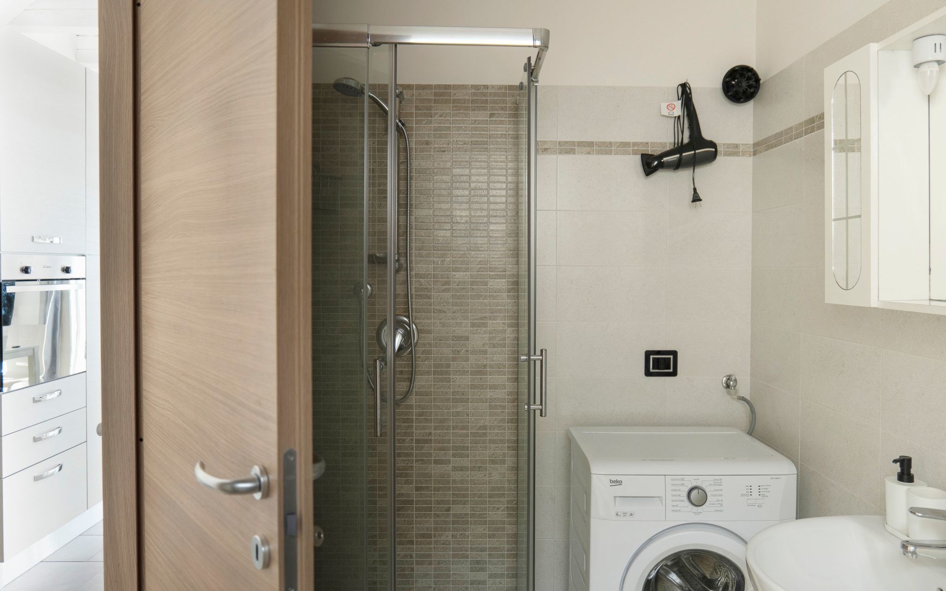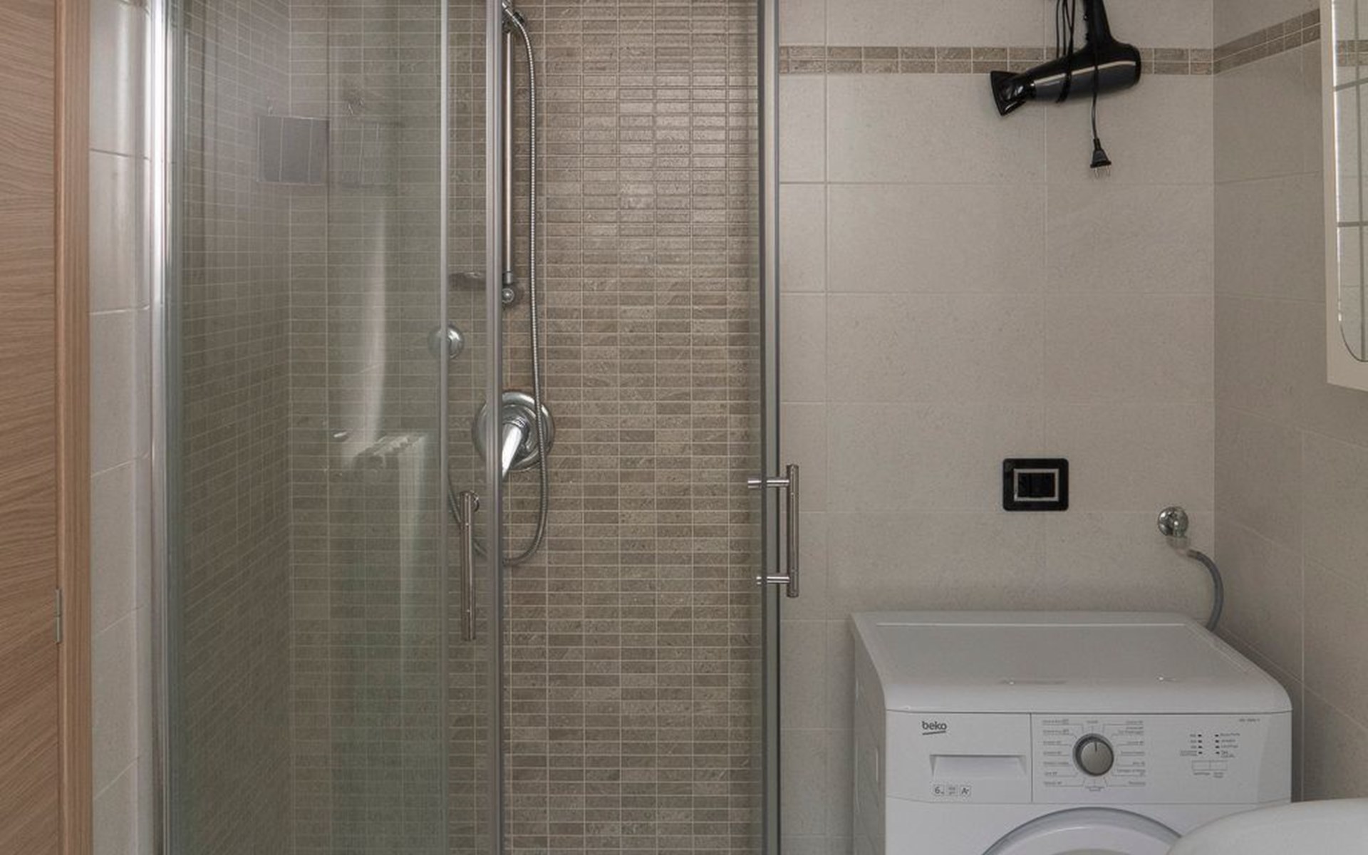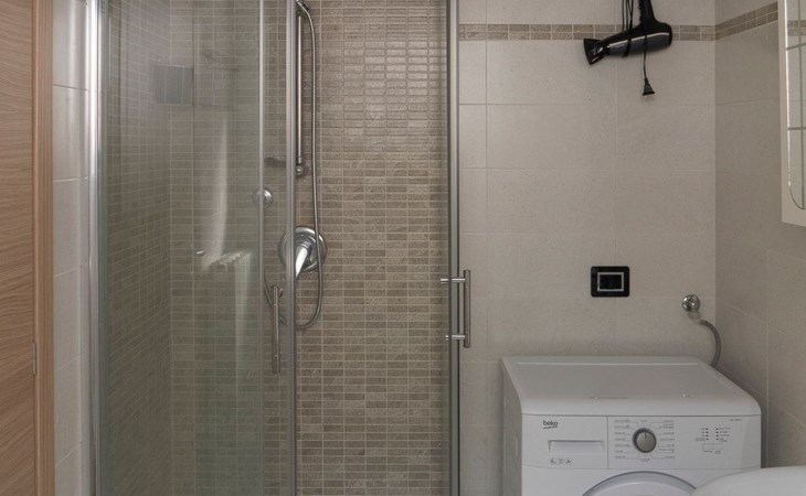 Ebenfalls im Erdgeschoss, mit Zugang über die Holztreppe, befindet sich das erste Badezimmer mit Waschbecken, Toilette, Bidet und Duschkabine. Hier befindet sich auch die Waschmaschine.