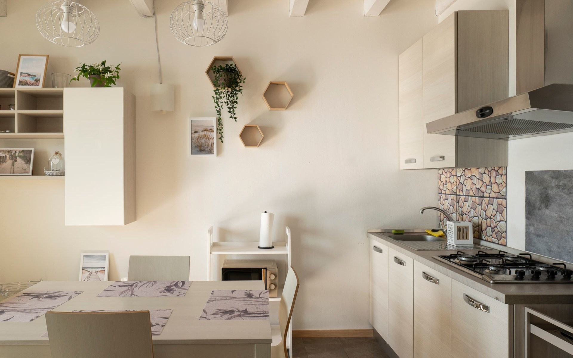 Die Umgebung ist modern, klar und sauber, aber bestimmte Details - wie die Holzdecken mit weiß getünchten Sichtbalken - tragen dazu bei, sie zu erwärmen und dem geradlinigen und funktionalen Stil der Einrichtung einen rustikalen Touch zu verleihen.
