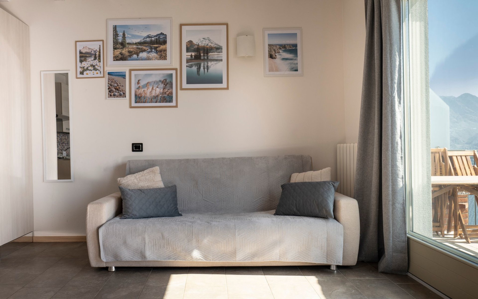 Der Raum, dessen natürliche Verlängerung diese Terrasse ist, ist das Wohnzimmer mit einem großen Dreisitzer-Sofa (umwandelbar in ein Schlafsofa), das vor dem Smart-TV platziert ist. Etwas weiter befindet sich der Esstisch, hinter dem die voll ausgestattete Küche liegt: Spüle und Kochfeld, Dunstabzugshaube, Geschirrspüler und Kühlschrank mit Gefrierfach, Elektroherd, Mikrowelle und verschiedene Kleingeräte (Kaffeemaschine, Toaster, Wasserkocher).