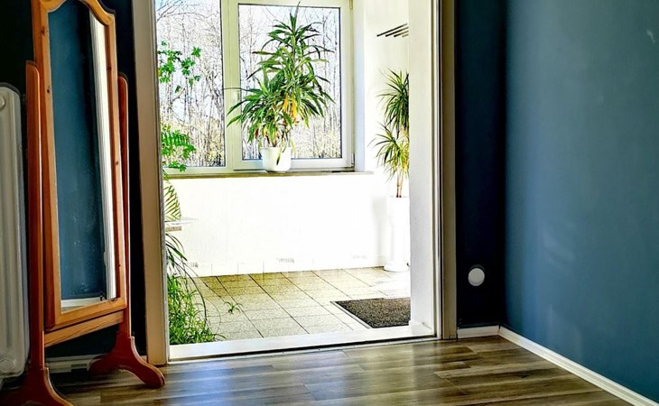 Privater Eingang & eigene Terrasse mit Blick ins Grüne