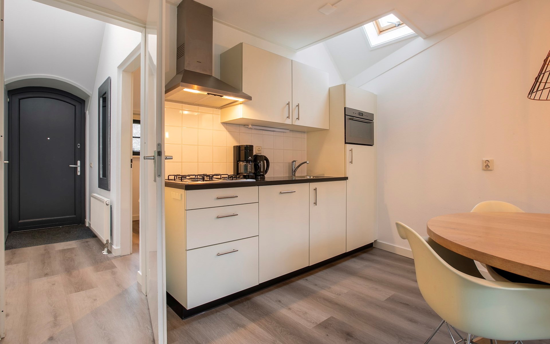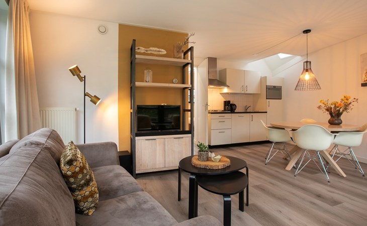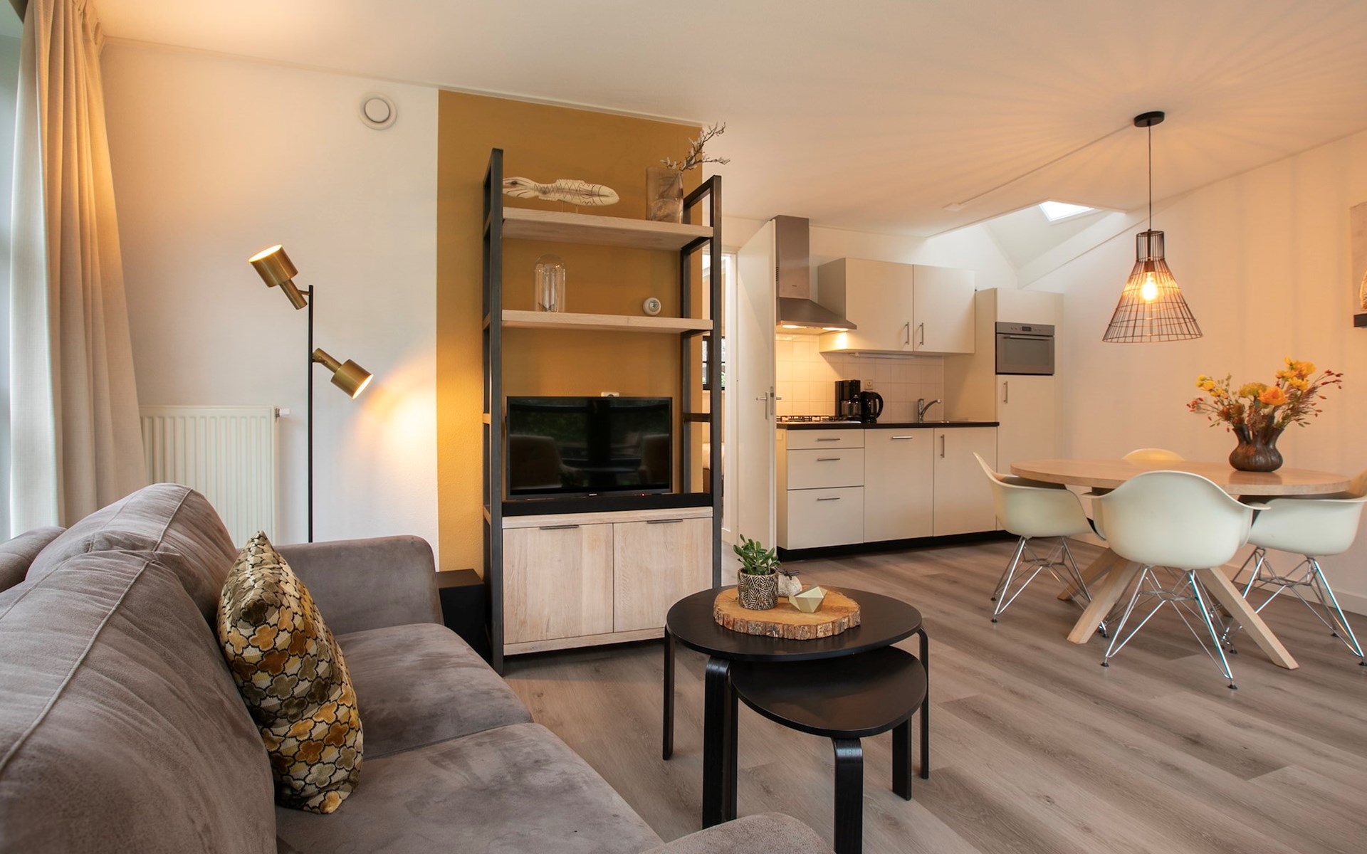 Das behagliche Wohnzimmer verfügt über eine bequeme Sitzecke mit einem Fernseher. Die offene Küche bietet alles, was Sie brauchen, einschließlich Kühlschrank mit Gefrierfach, Kaffeemaschine, Kombimikrowelle und Geschirrspülmaschine. Neben der offenen Küche finden Sie eine Essecke, in der Sie gemeinsam essen können.