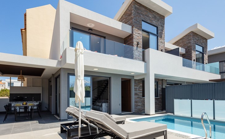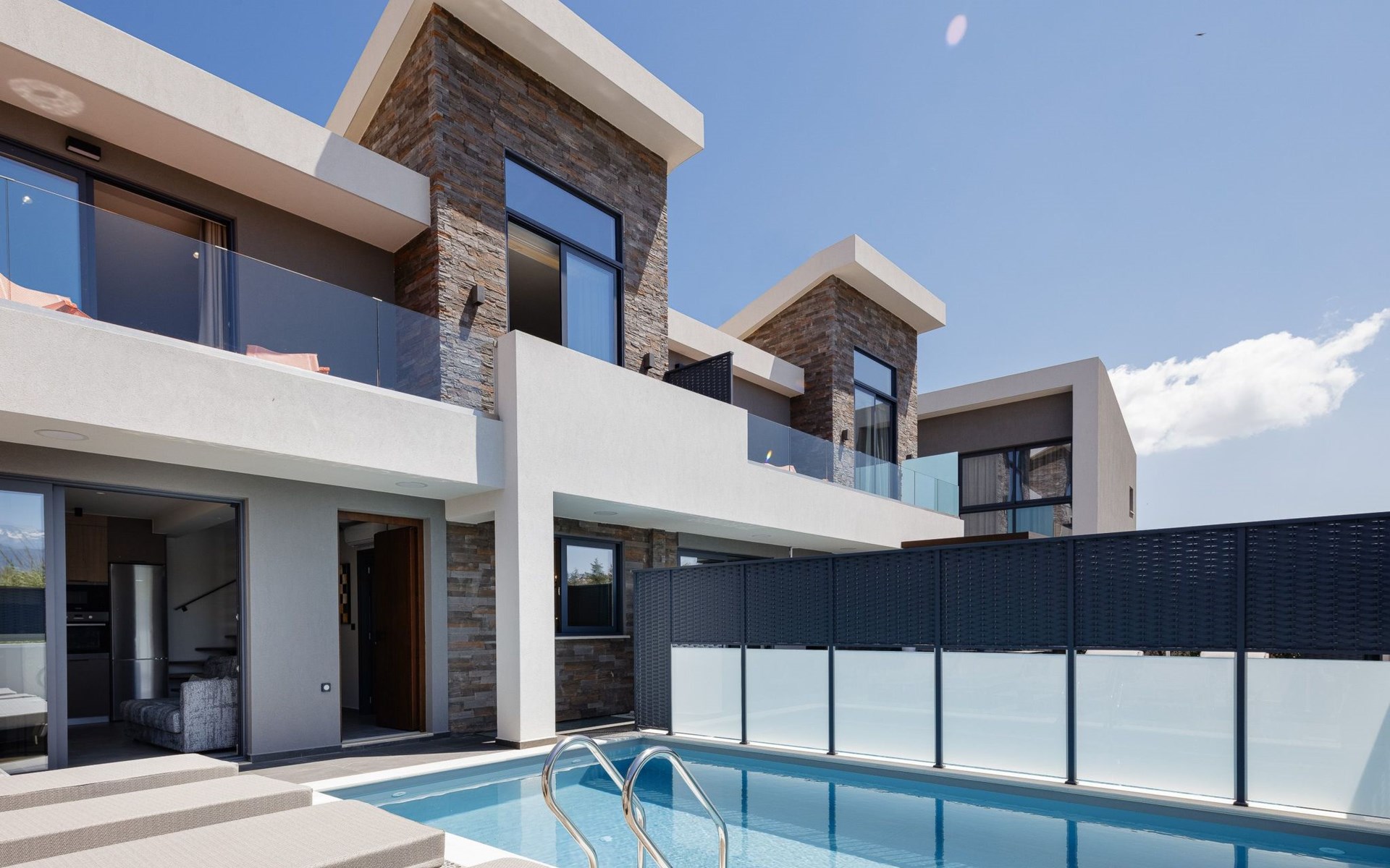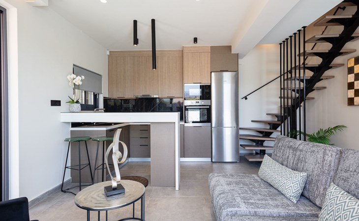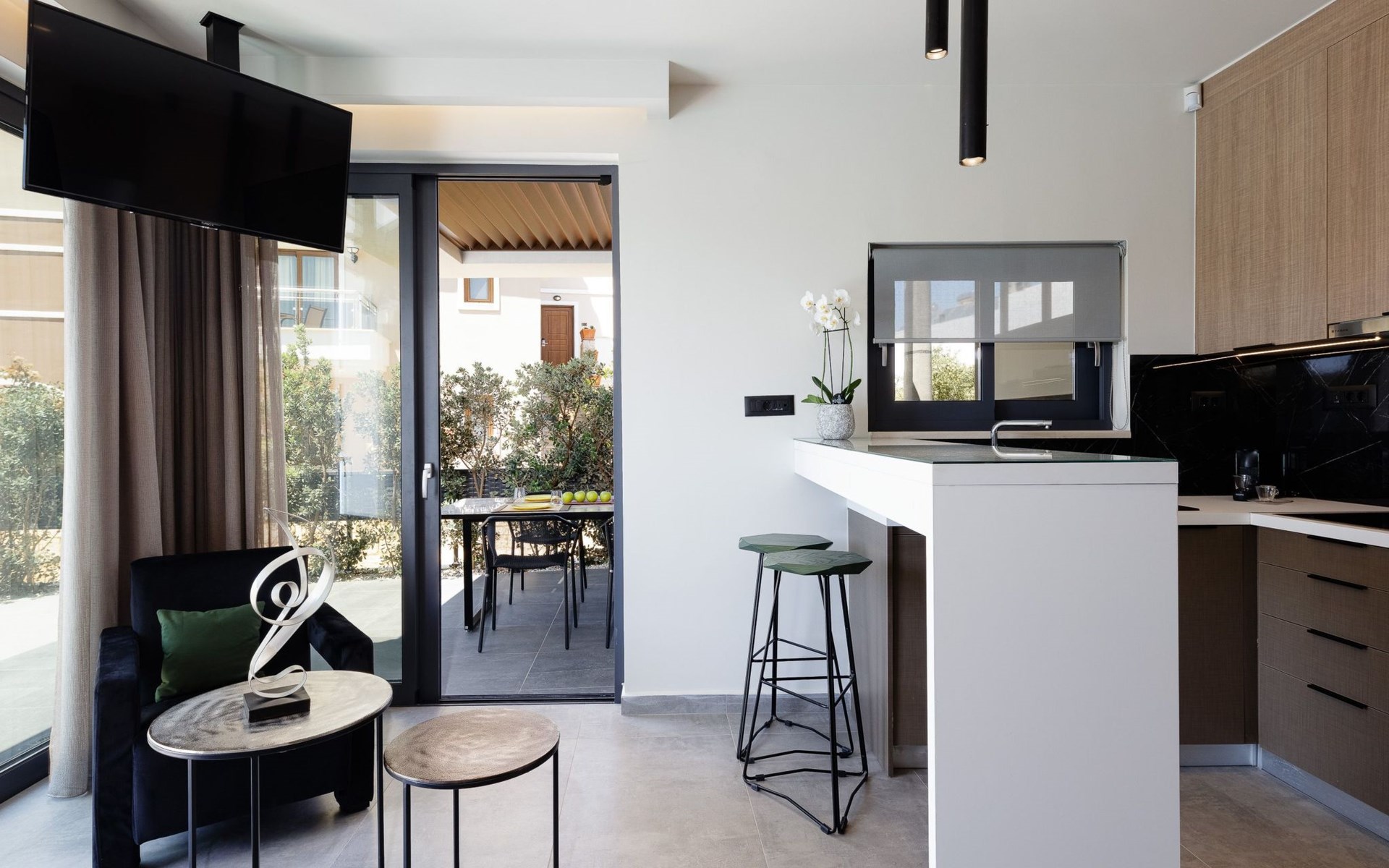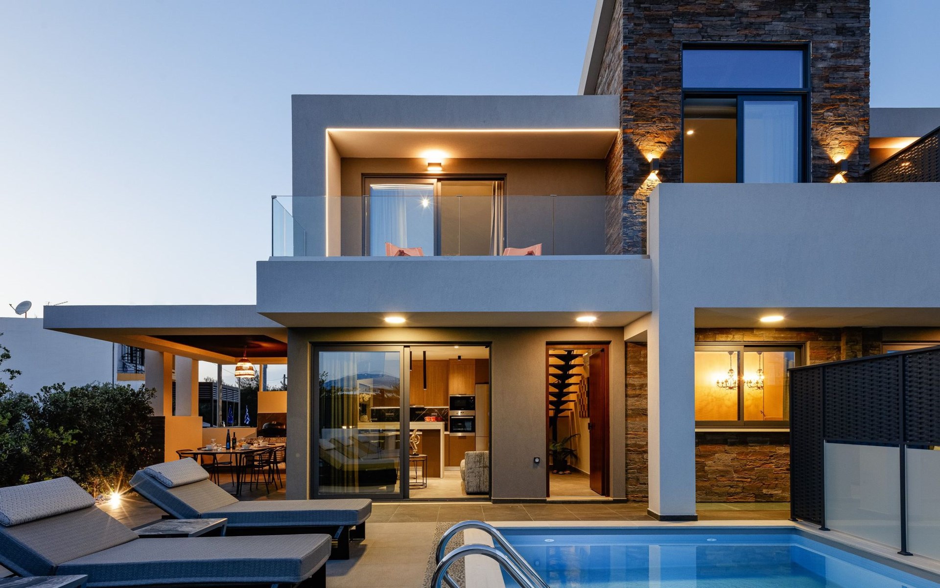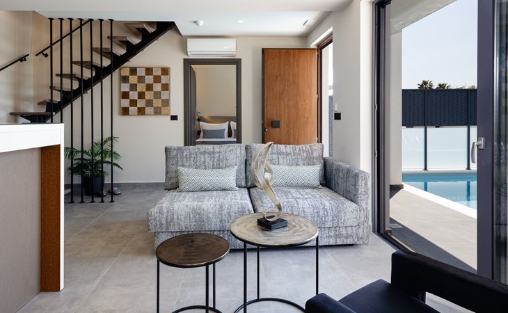 VillAgioi Villa I ist ein 75 m² großes Haus, das sich über zwei Etagen erstreckt und bequem bis zu 5 Gäste beherbergen kann. Das Erdgeschoss empfängt Sie mit einem offen gestalteten Wohnbereich, der minimalistisches Design mit Funktionalität verbindet. Der Wohnbereich ist mit einer gemütlichen Sitzecke, einem Smart-TV und großen Schiebetüren ausgestattet, die einen direkten Zugang zum Außenpoolbereich bieten und so ein nahtloses Indoor-Outdoor-Wohngefühl schaffen. Angrenzend an den Wohnbereich befindet sich eine voll ausgestattete Küche mit Edelstahlgeräten und einer eleganten Frühstücksbar.