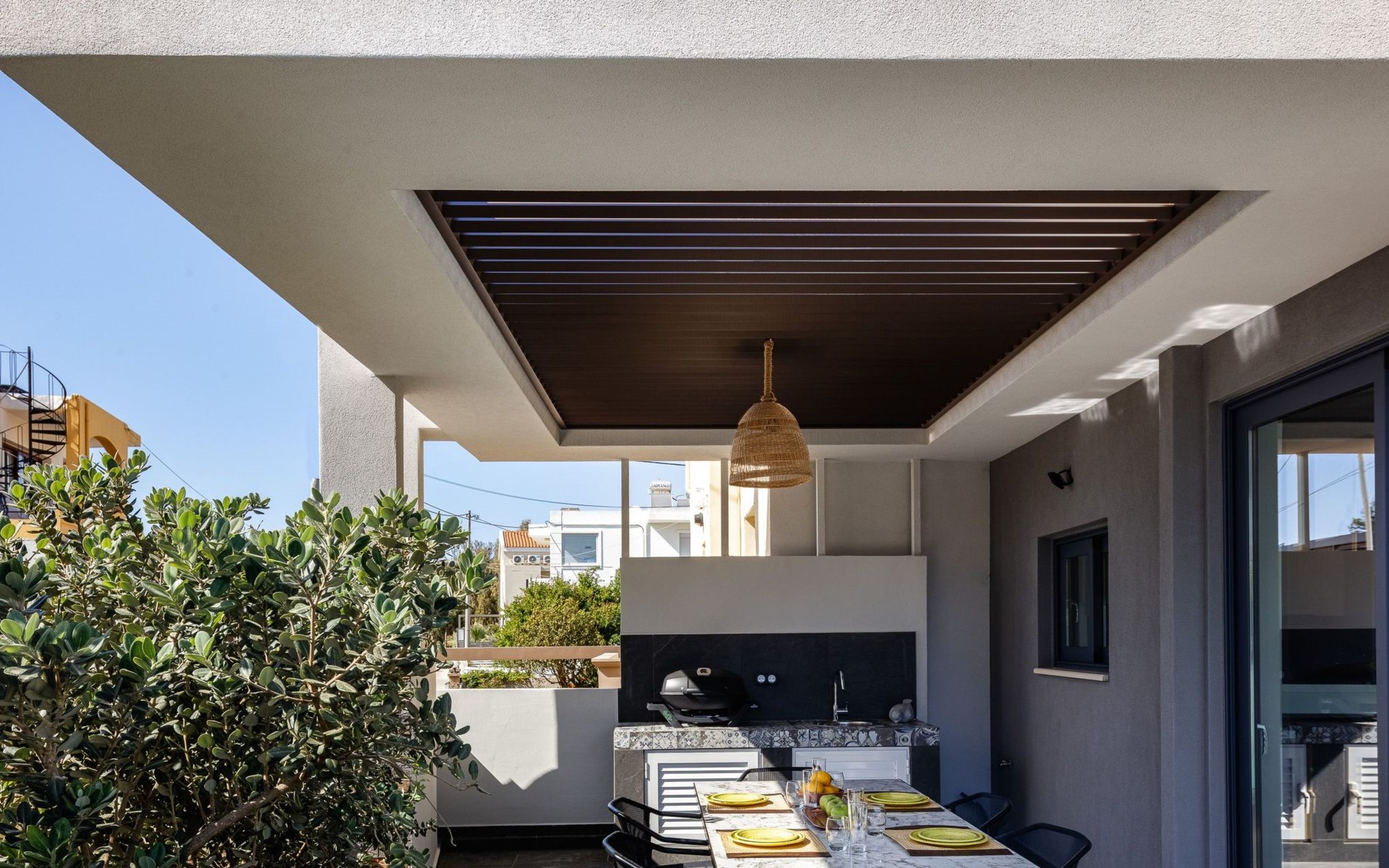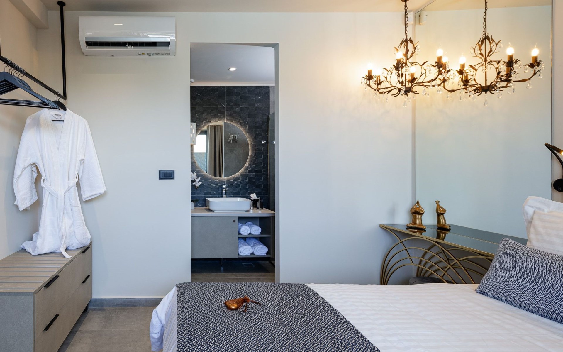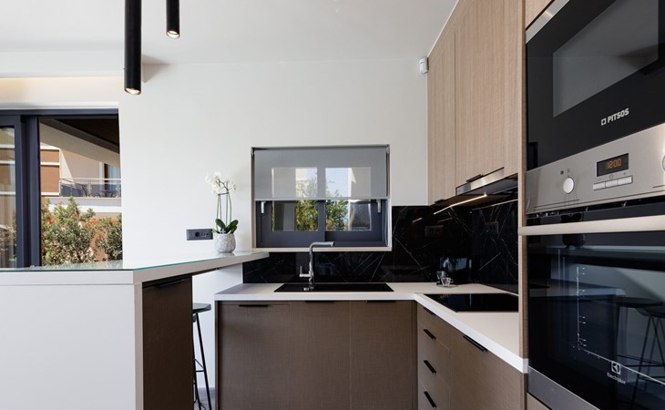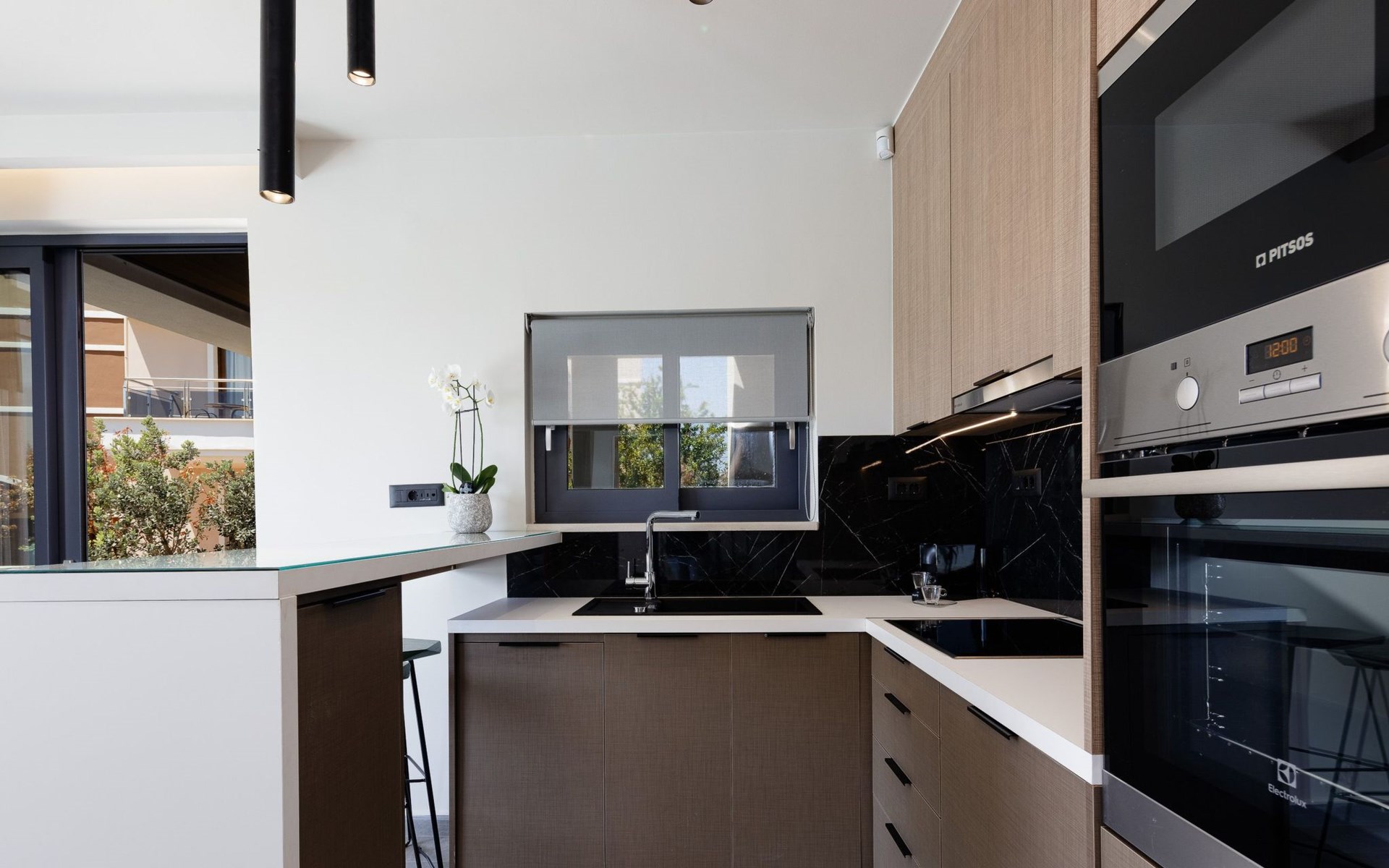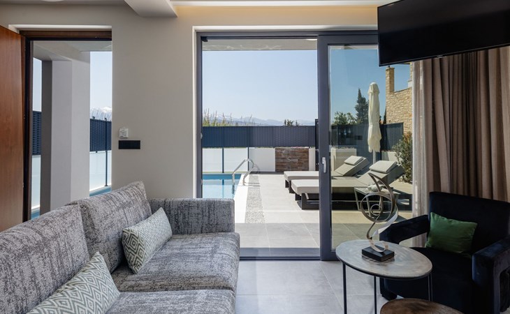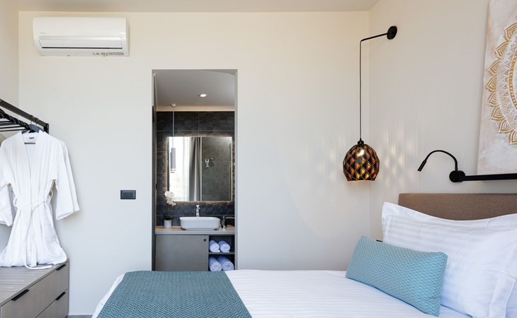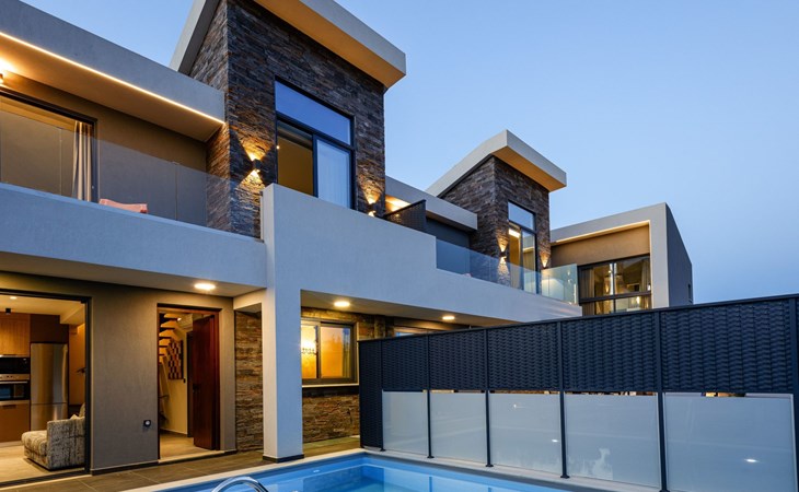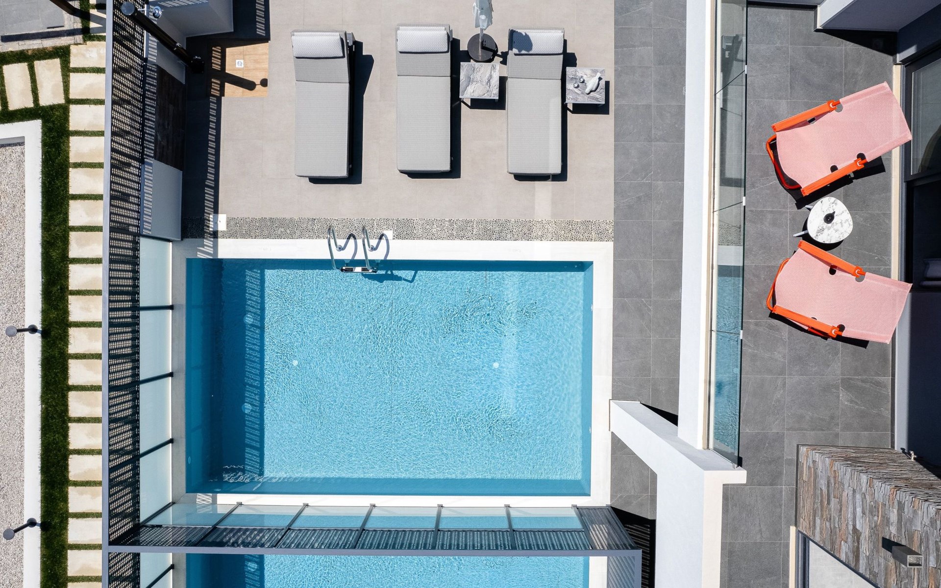 VillAgioi Villa I ist ein 75 m² großes Haus, das sich über zwei Etagen erstreckt und bequem bis zu 5 Gäste beherbergen kann. Das Erdgeschoss empfängt Sie mit einem offen gestalteten Wohnbereich, der minimalistisches Design mit Funktionalität verbindet. Der Wohnbereich ist mit einer gemütlichen Sitzecke, einem Smart-TV und großen Schiebetüren ausgestattet, die einen direkten Zugang zum Außenpoolbereich bieten und so ein nahtloses Indoor-Outdoor-Wohngefühl schaffen. Angrenzend an den Wohnbereich befindet sich eine voll ausgestattete Küche mit Edelstahlgeräten und einer eleganten Frühstücksbar.