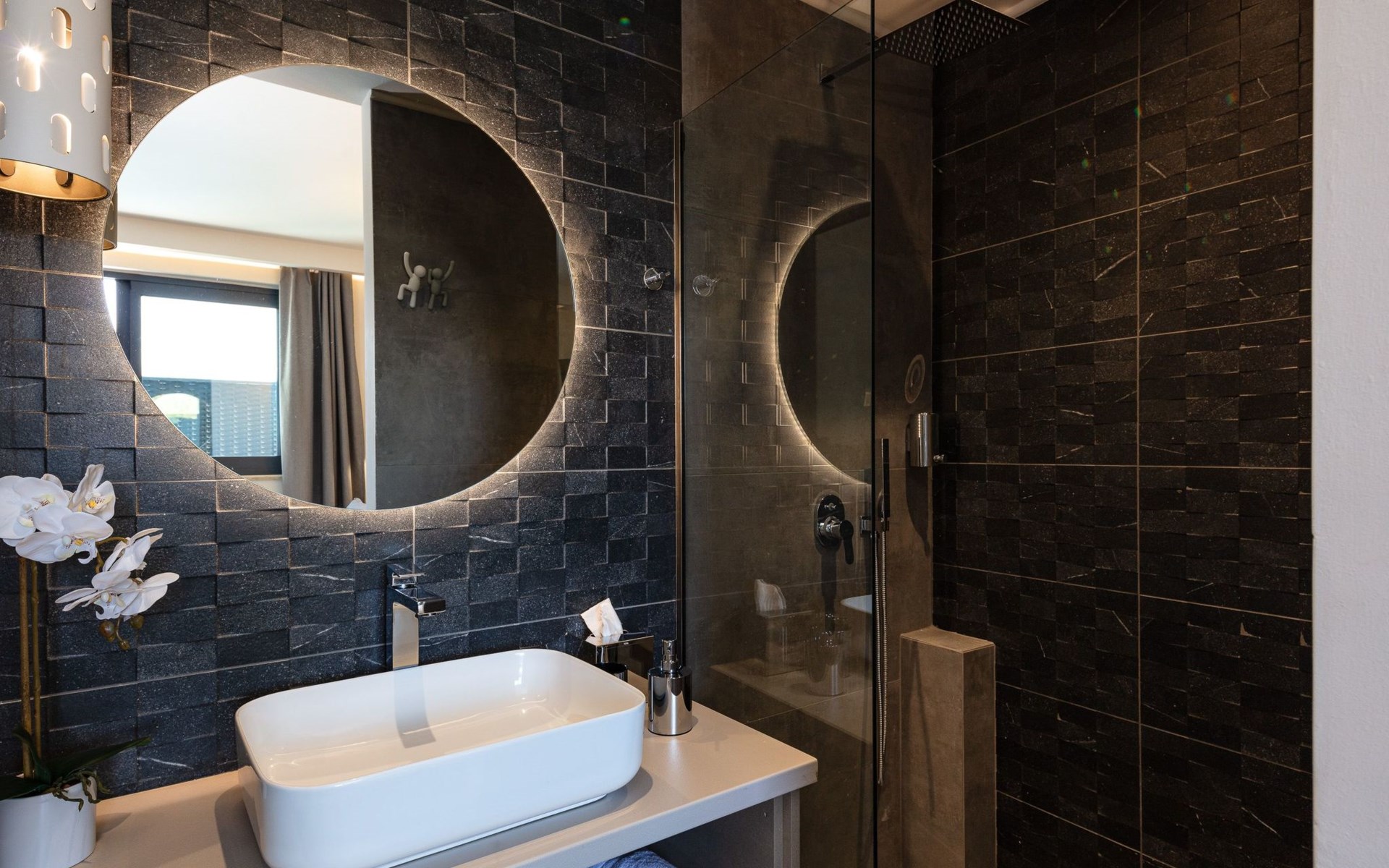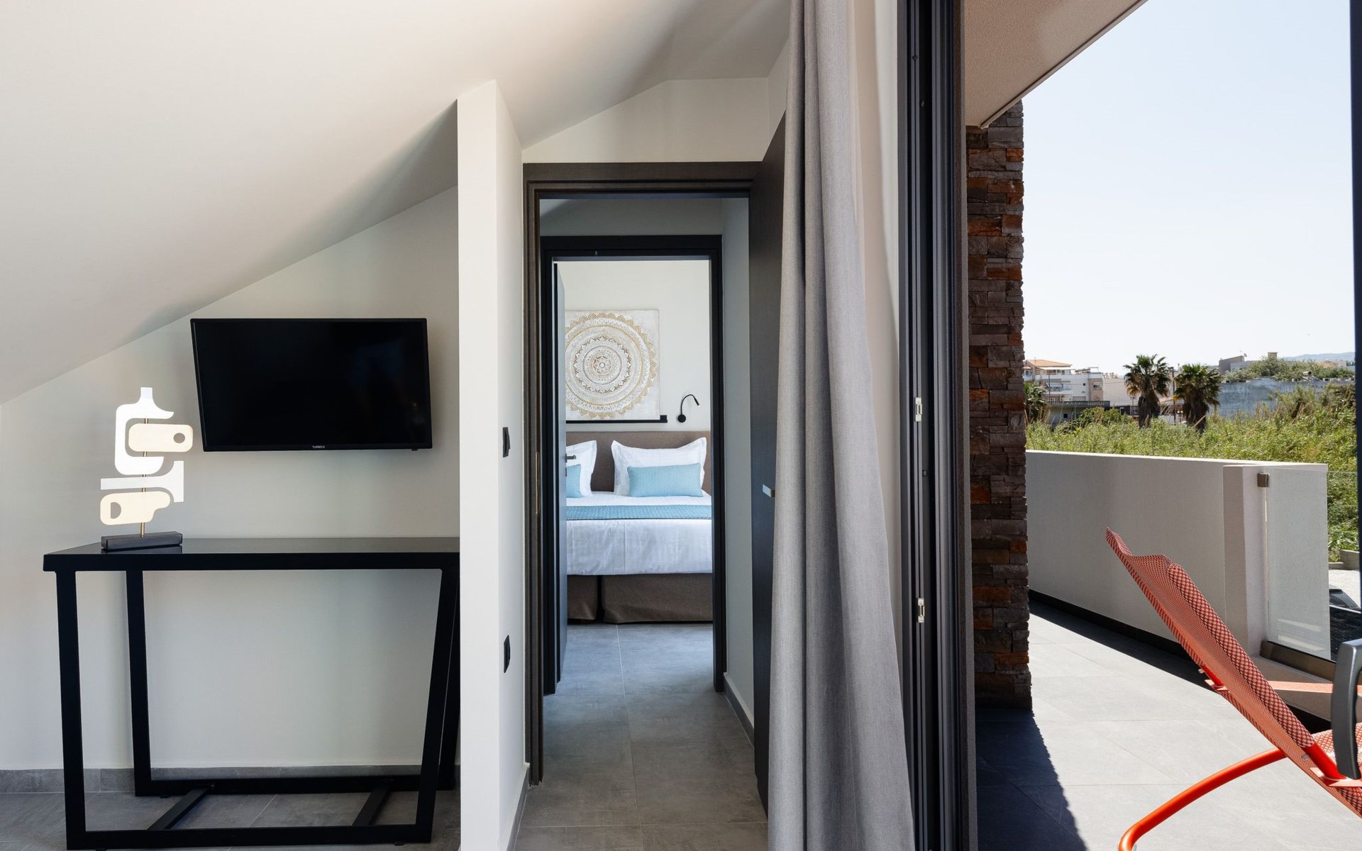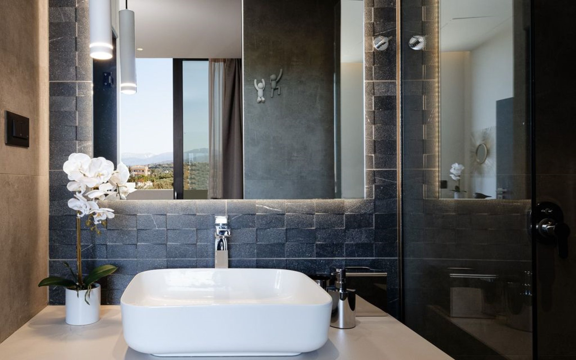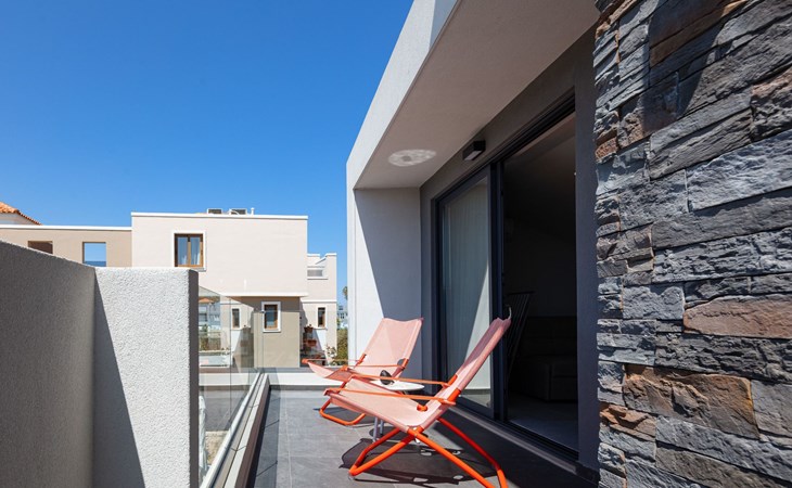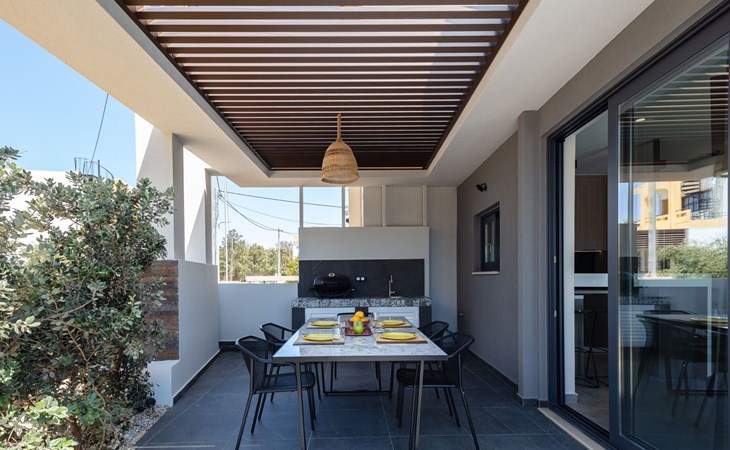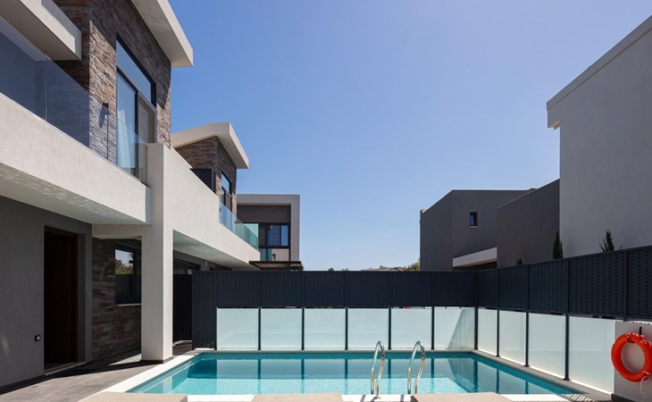 VillAgioi Villa I ist ein 75 m² großes Haus, das sich über zwei Etagen erstreckt und bequem bis zu 5 Gäste beherbergen kann. Das Erdgeschoss empfängt Sie mit einem offen gestalteten Wohnbereich, der minimalistisches Design mit Funktionalität verbindet. Der Wohnbereich ist mit einer gemütlichen Sitzecke, einem Smart-TV und großen Schiebetüren ausgestattet, die einen direkten Zugang zum Außenpoolbereich bieten und so ein nahtloses Indoor-Outdoor-Wohngefühl schaffen. Angrenzend an den Wohnbereich befindet sich eine voll ausgestattete Küche mit Edelstahlgeräten und einer eleganten Frühstücksbar.