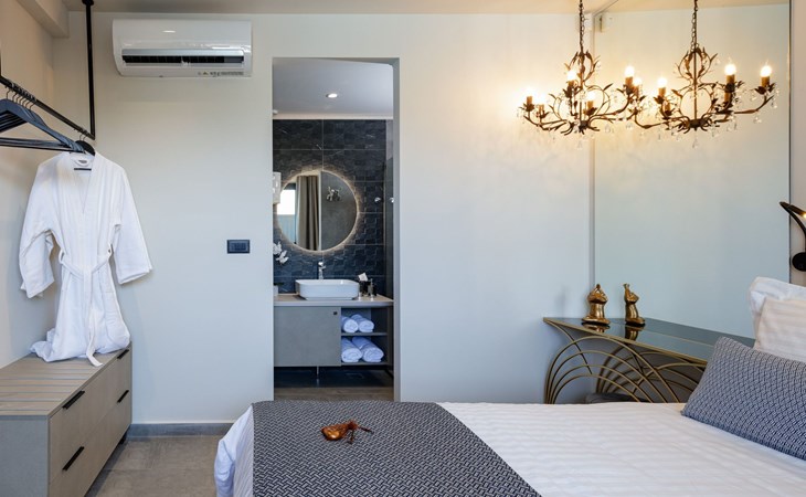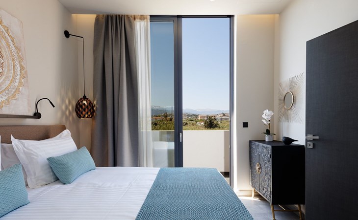 Das zweite Schlafzimmer im Obergeschoss verfügt über ein Kingsize-Bett aus Coco-Mat, das auf Wunsch auch in zwei Einzelbetten umgewandelt werden kann, einen privaten Balkon, einen 32-Zoll-Smart-TV, eine Klimaanlage, einen Kleiderschrank und ein geteiltes Bad mit Dusche.