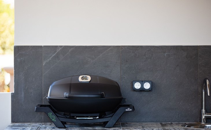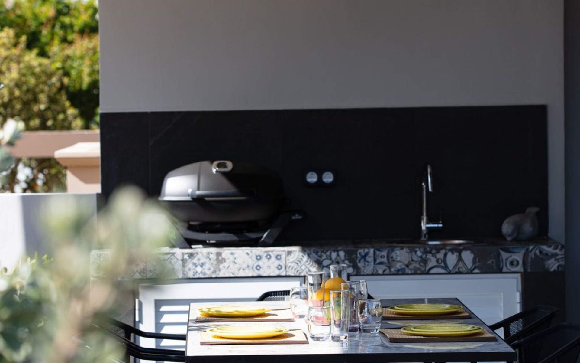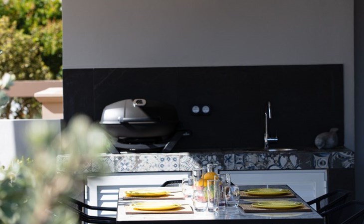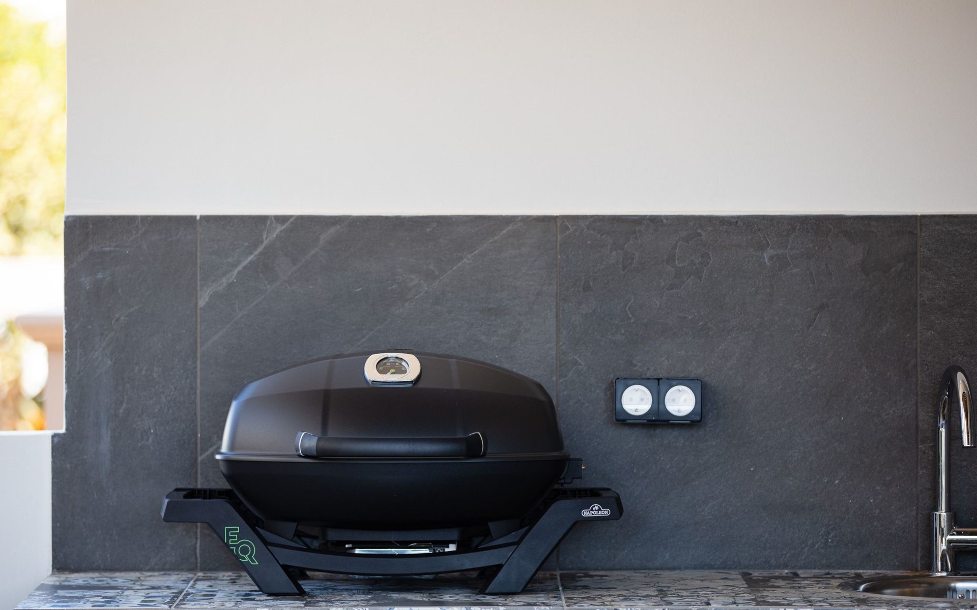 Der Außenbereich der Villa wurde sorgfältig gestaltet, um einen privaten Ort der Entspannung zu bieten. Es gibt einen 25 m² großen privaten Swimmingpool, eine Dusche am Pool und eine elegante Liegewiese mit Liegestühlen und Sonnenschirm. Eine voll ausgestattete Außenküche mit elektrischem Grill und ein geräumiger Esstisch vervollständigen das Ambiente, perfekt für Mahlzeiten im Freien mit Ihren Lieben.