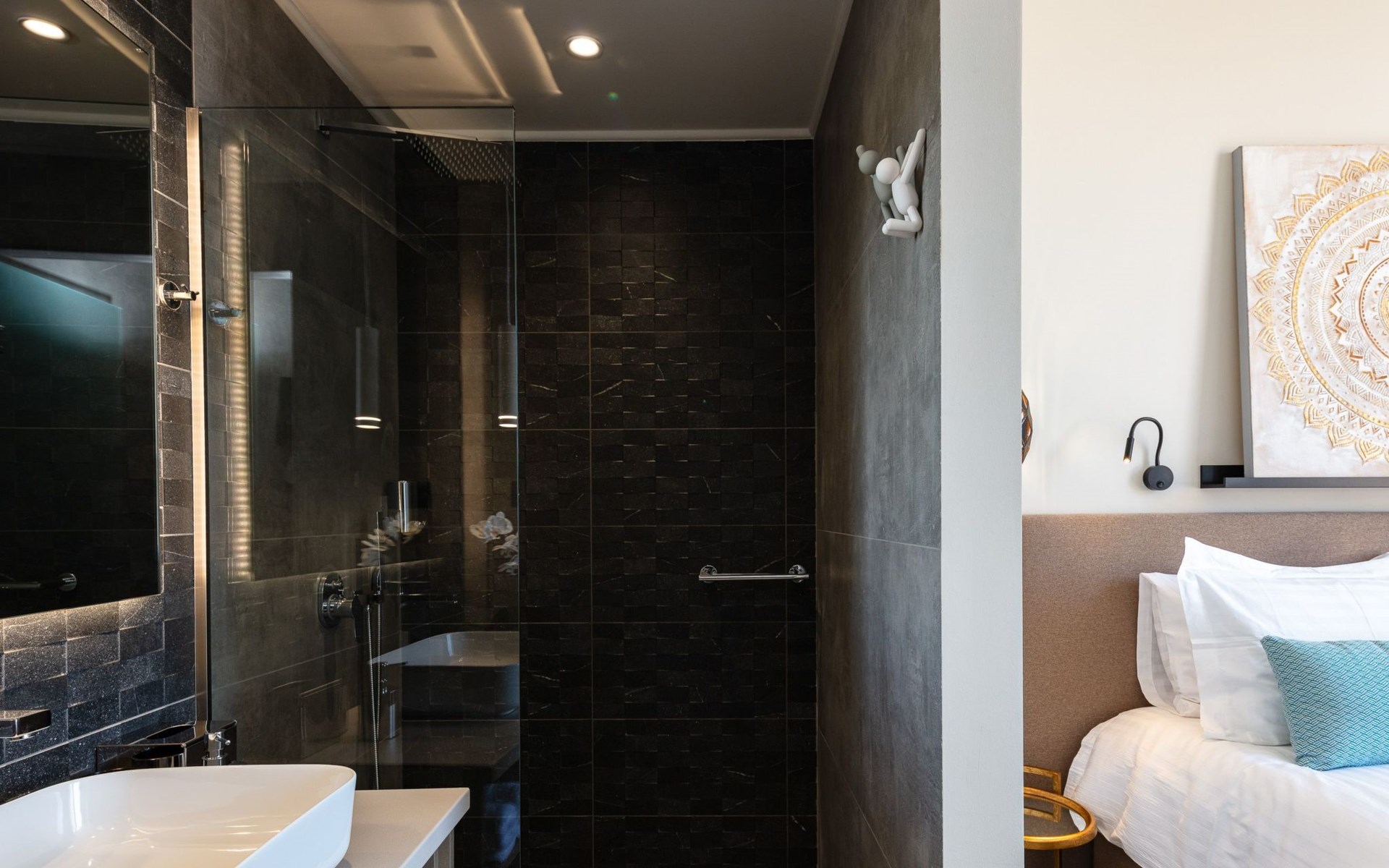 Im Erdgeschoss befindet sich auch das erste Schlafzimmer mit einem Coco-Mat-Kingsize-Bett, das auf Wunsch in zwei Einzelbetten umgewandelt werden kann. Das Zimmer bietet außerdem einen 32-Zoll-Smart-TV, eine Klimaanlage, einen offenen Kleiderschrank und ein eigenes, geteiltes Badezimmer mit einer begehbaren Dusche.