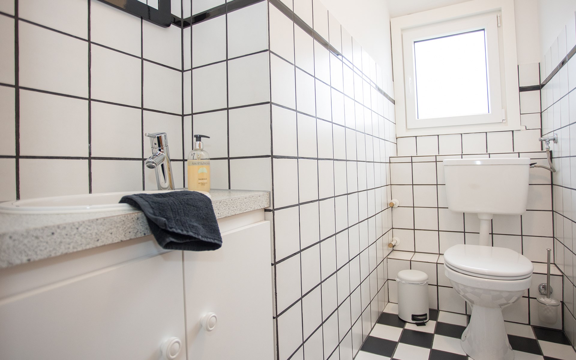Im zweiten Schlafzimmer wartet ein weiteres Doppelbett (180x200cm), ebenfalls mit zwei separaten Matratzen (90x200cm). Dieses Zimmer hat zusätzlich eine gemütliche Sitzecke mit zwei Stühlen und einem eigenen Waschbecken mit Spiegel. Für zusätzlichen Komfort gibt es noch eine separate Gästetoilette mit Waschbecken in der Wohnung.