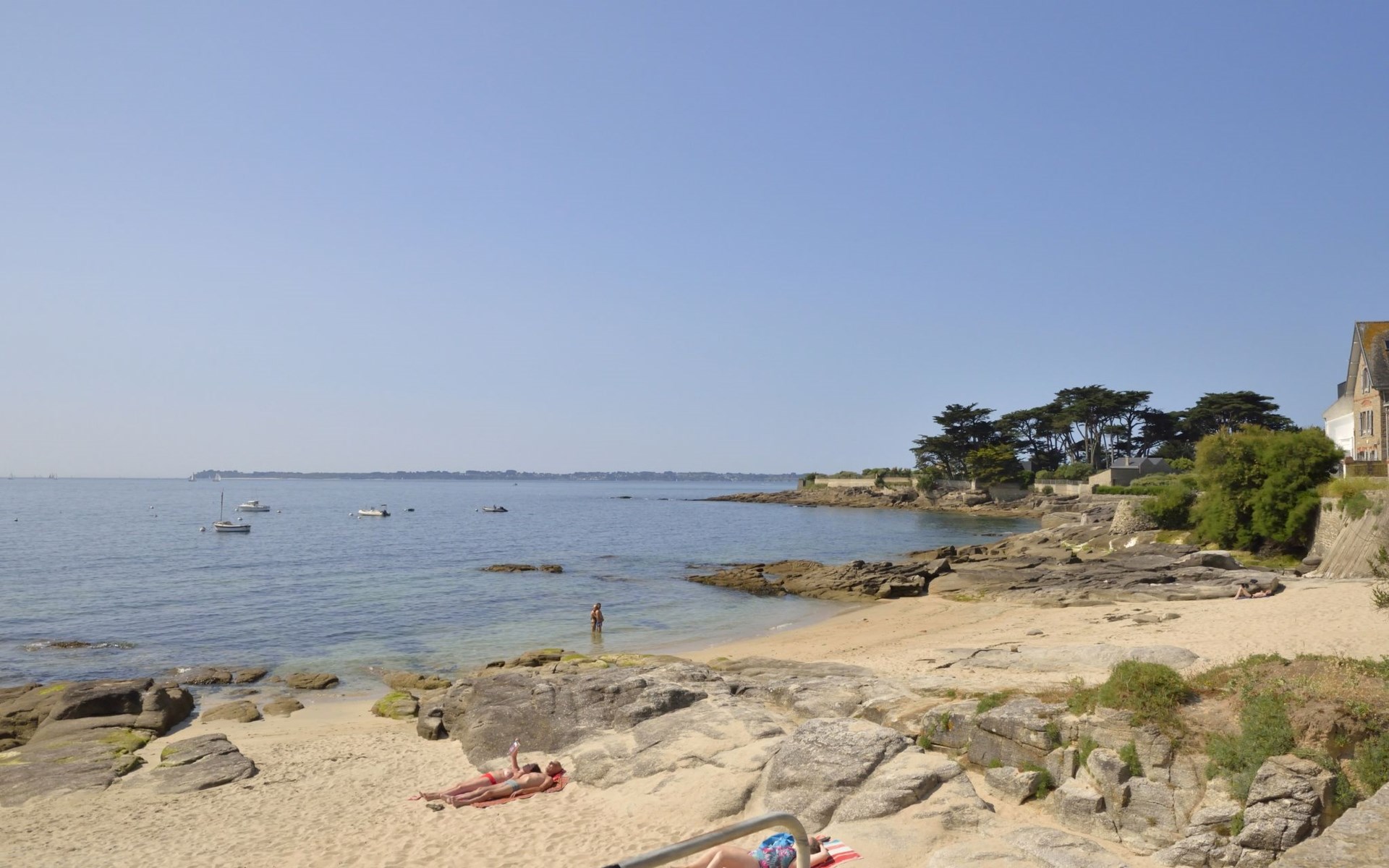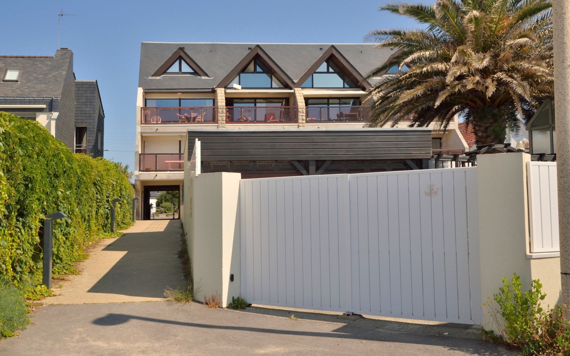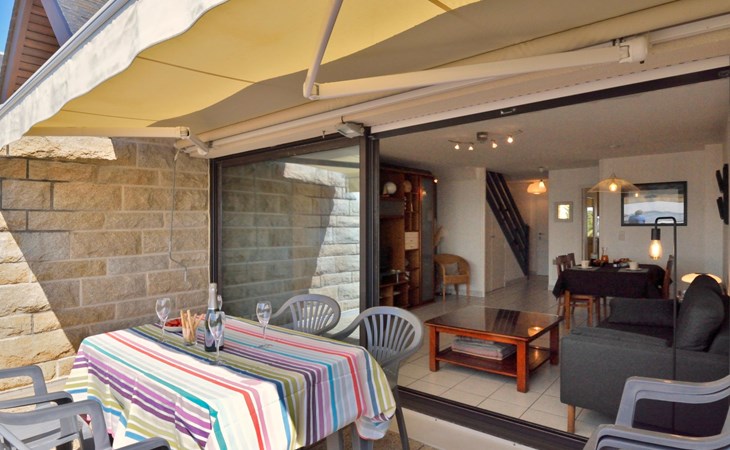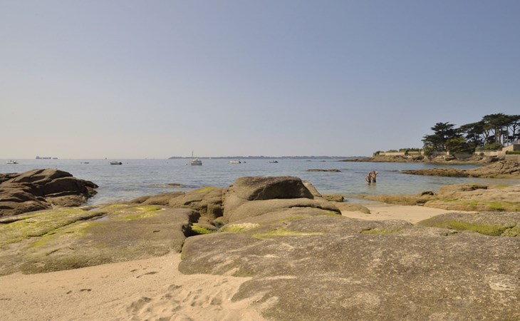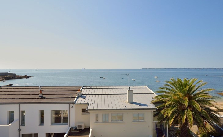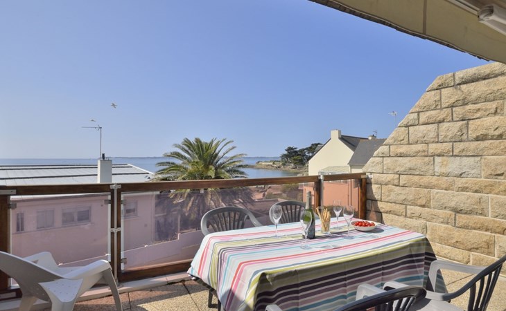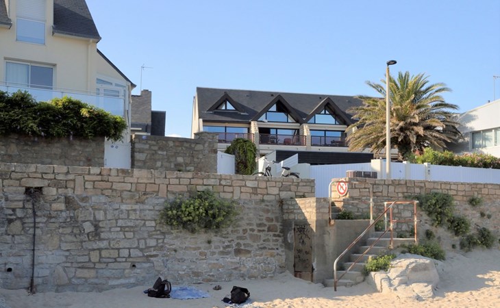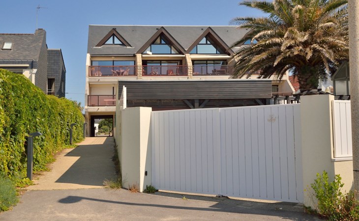Appartementhaus "Belle Vue Mer et Groix", auf 3 Stockwerken. 8 Wohnungen in der Residenz. Im Ortsteil LOMENER, 5 km vom Zentrum von Ploemeur, 12 km vom Zentrum von Lorient, 30 m vom Meer. Im Hause: Einstellraum für Fahrräder. Parkplatz. Supermarkt, Restaurant 100 m, Bushaltestelle 5 km, Sandstrand 30 m. Jacht-Hafen 100 m, Golfplatz (18 Loch) 5 km.
