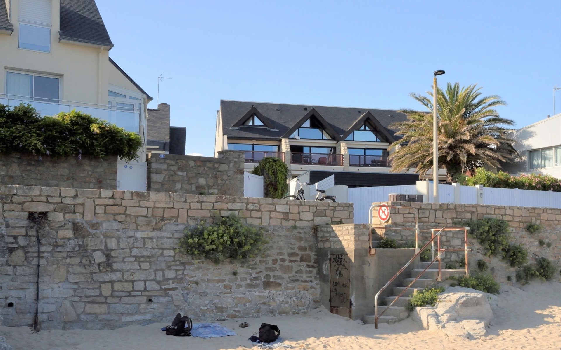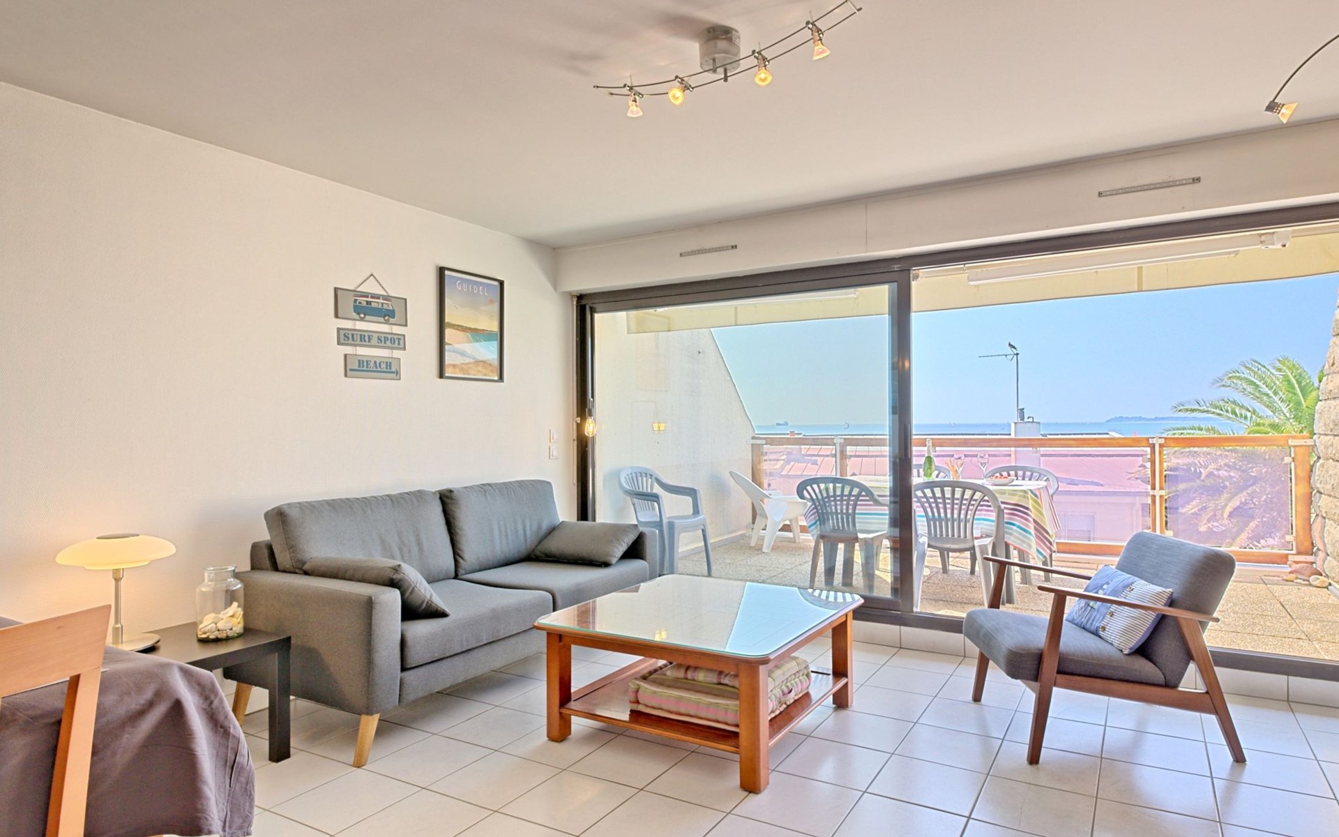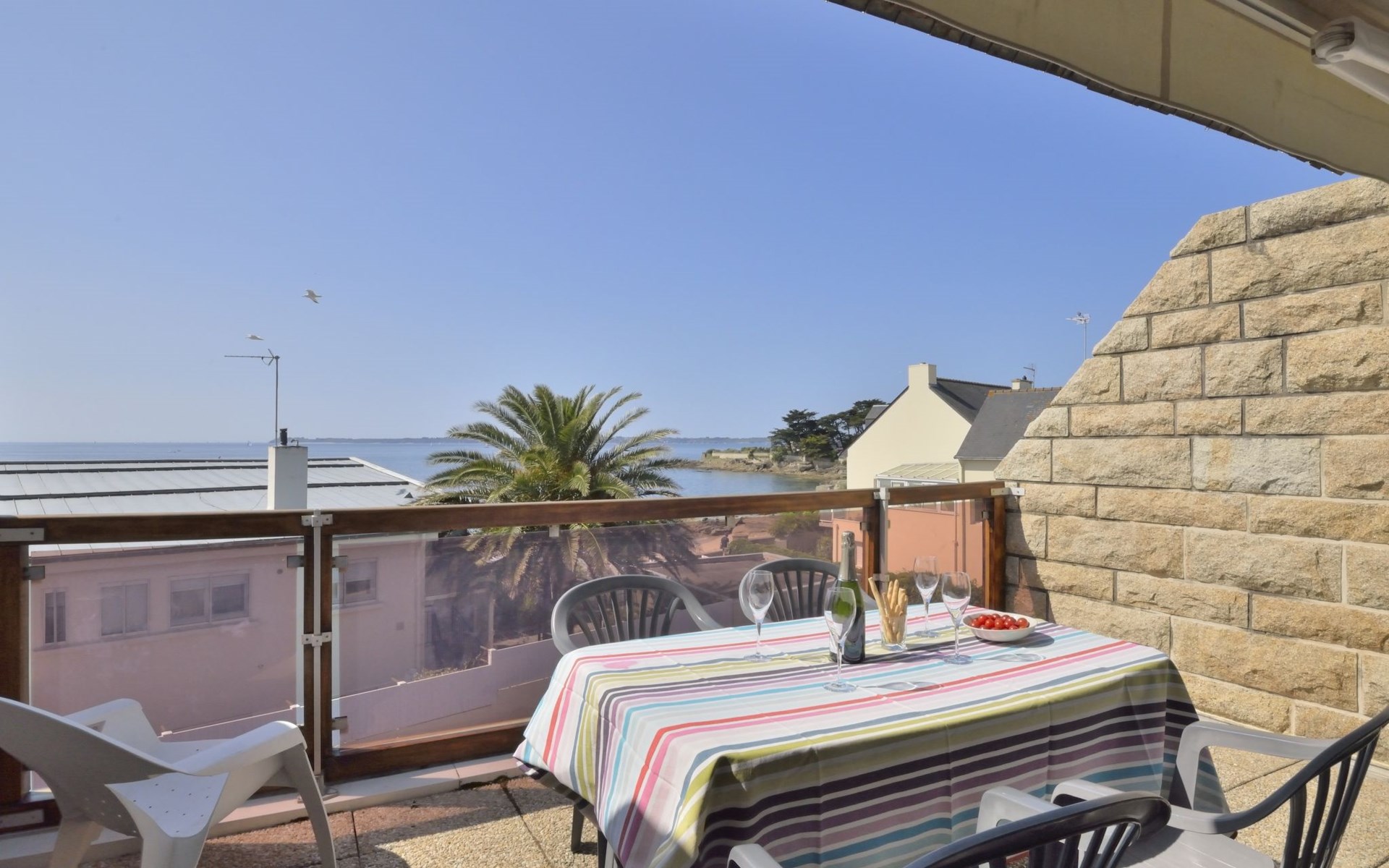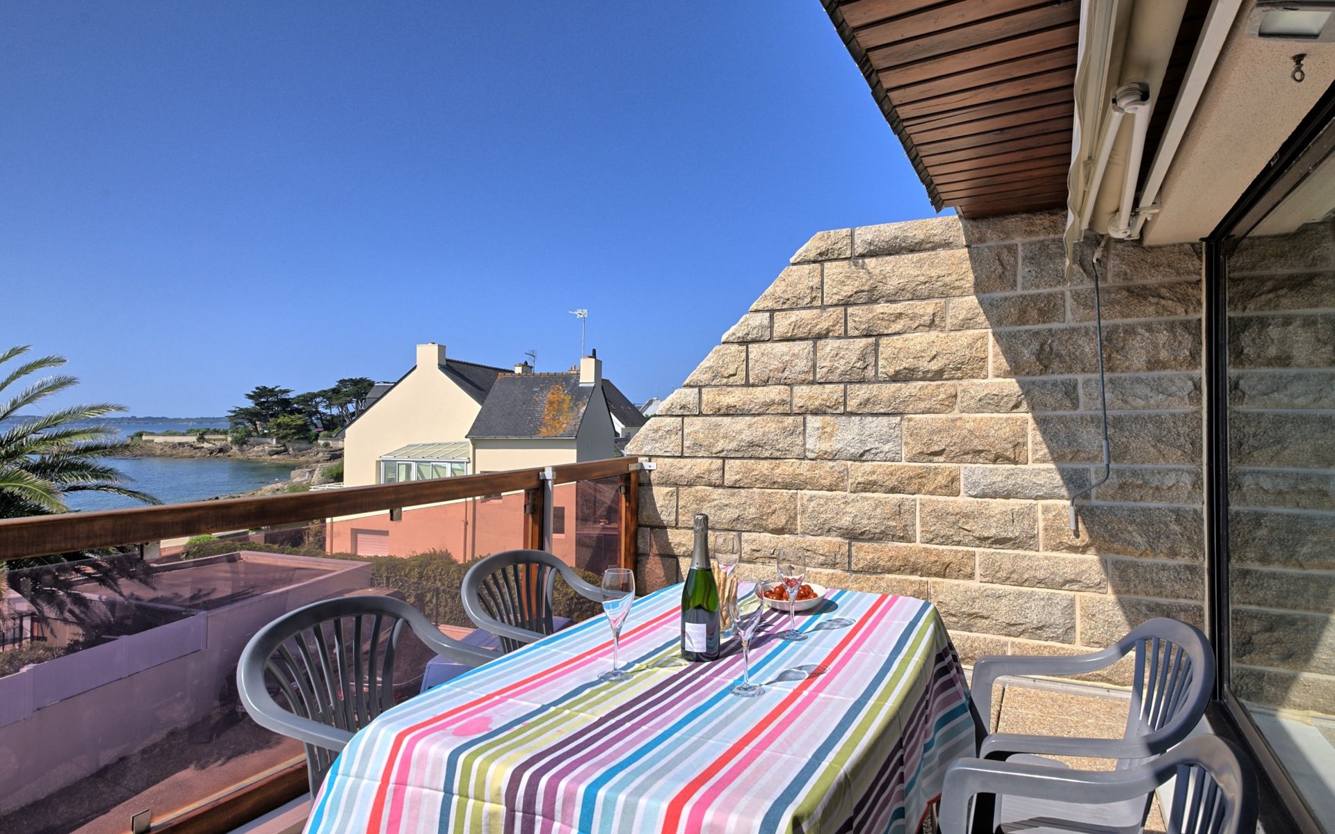 Appartementhaus "Belle Vue Mer et Groix", auf 3 Stockwerken. 8 Wohnungen in der Residenz. Im Ortsteil LOMENER, 5 km vom Zentrum von Ploemeur, 12 km vom Zentrum von Lorient, 30 m vom Meer. Im Hause: Einstellraum für Fahrräder. Parkplatz. Supermarkt, Restaurant 100 m, Bushaltestelle 5 km, Sandstrand 30 m. Jacht-Hafen 100 m, Golfplatz (18 Loch) 5 km.