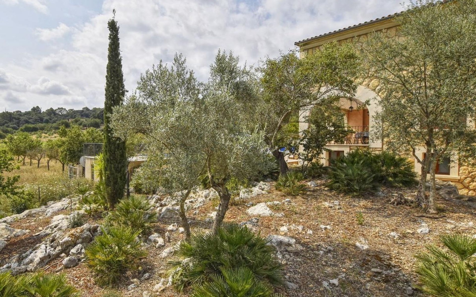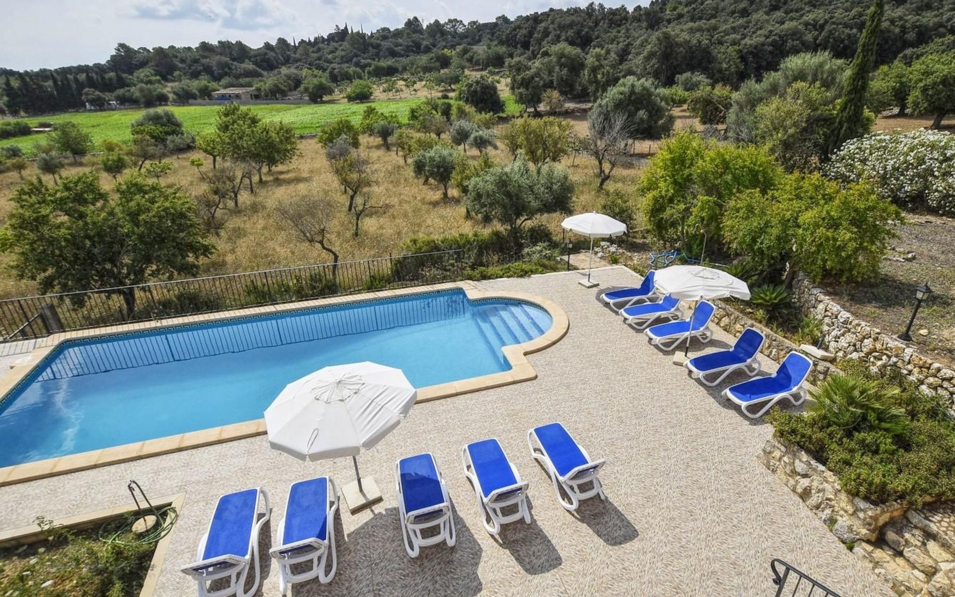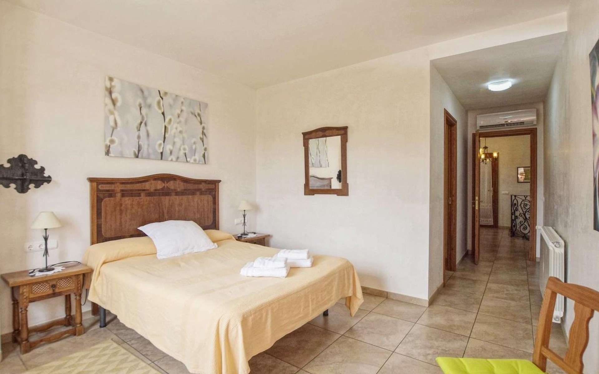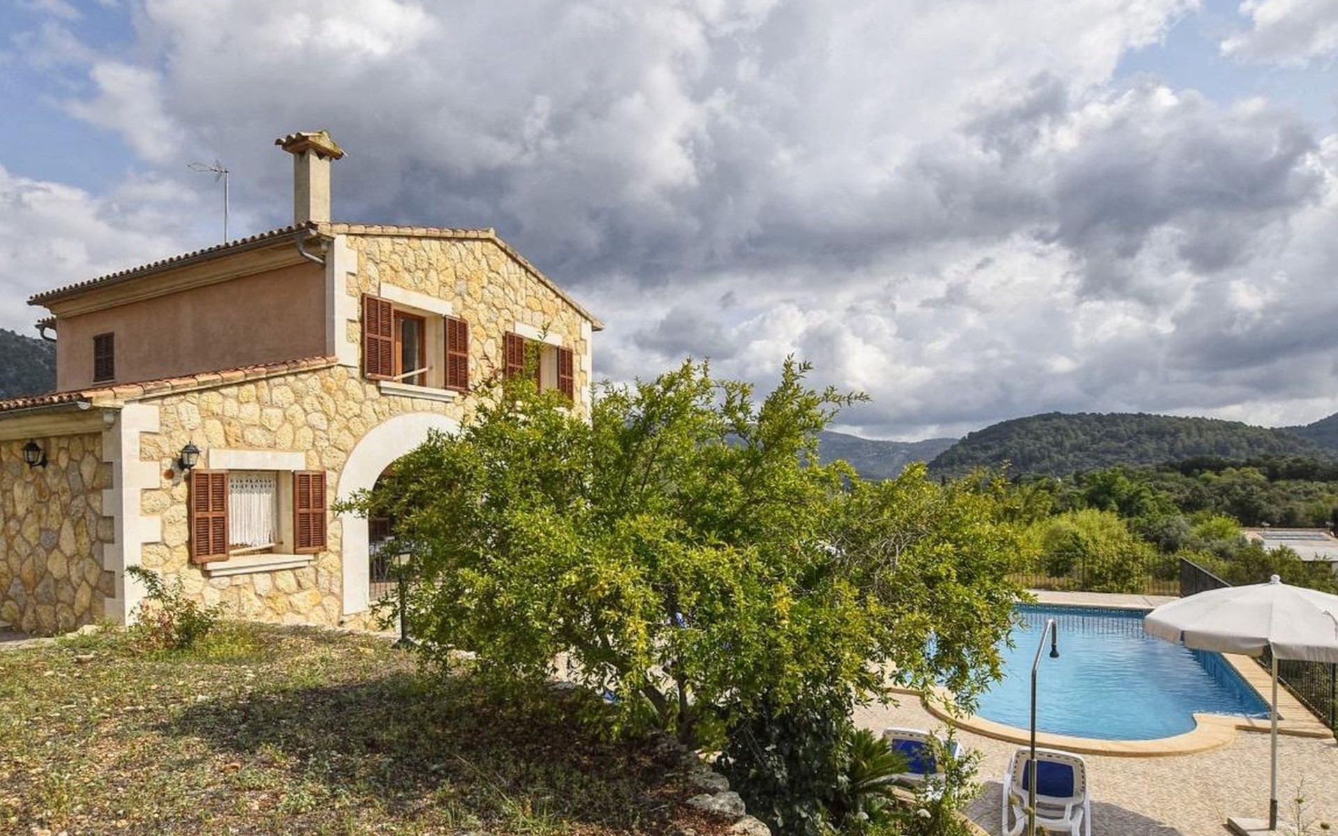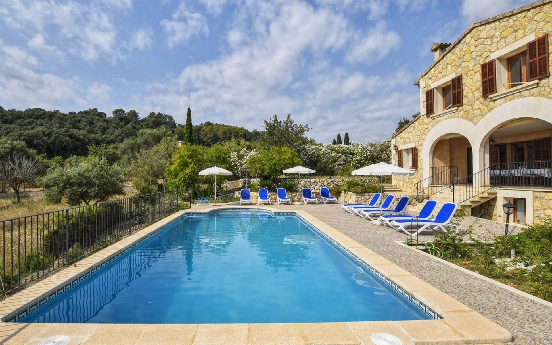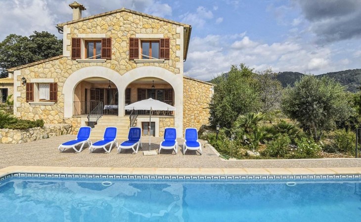 Campanet: Grosses, rustikales, komfortables Haus "Pla de Ses Rotes", Baujahr 2008, umgeben von Bäumen und Feldern. Im Ort Campanet, ruhige Lage, 18 km vom Meer, im Grünen. Zur Alleinbenutzung: Liegewiese 2'000 m2, wunderschöner Garten zum Entspannen, Schwimmbad eckig (10 x 5 m, saisonale Verfügbarkeit: 01.Mar. - 30.Okt.). Aussendusche, Sitzplatz, Pergola, Gartenmöbel, Grill. Im Hause: Internetzugang, Wireless LAN, Klimaanlage, Waschmaschine. Parkplatz auf dem Grundstück. Einkaufsgeschäft 1.3 km, Lebensmittelgeschäft 1.3 km, Supermarkt 1.3 km, Restaurant 1.3 km, Bushaltestelle 450 m, Sandstrand 18 km. Bitte beachten: Fahrzeug empfohlen. Geeignet für Familien, geeignet für Senioren Babyausstattung auf Anfrage (inkl.). Objekt geeignet für 11 Erwachsene. Der Besitzer akzeptiert keine Jugendgruppen. Be- und Entladen am Ferienhaus möglich. Flugplatz 45 km vom Haus.