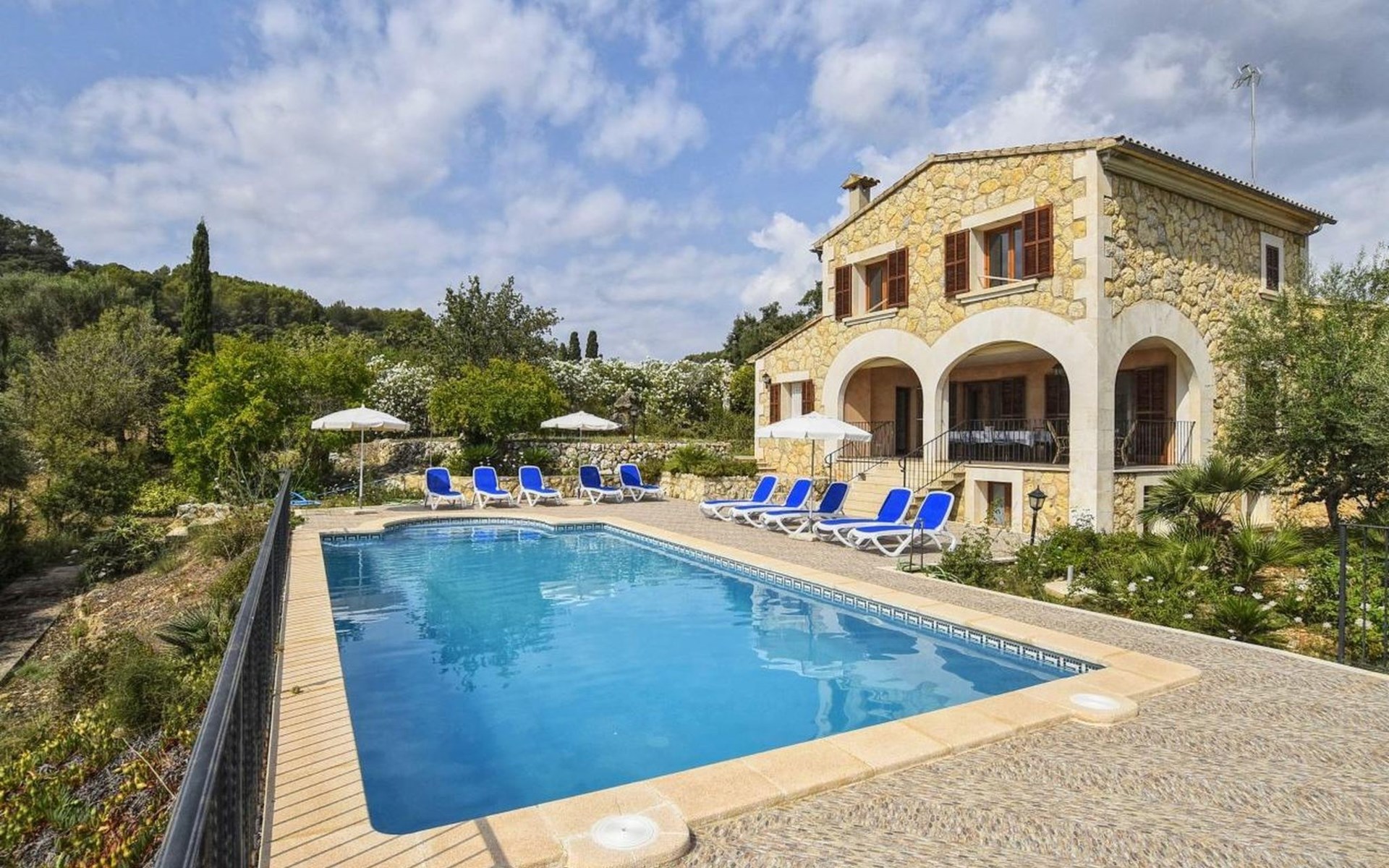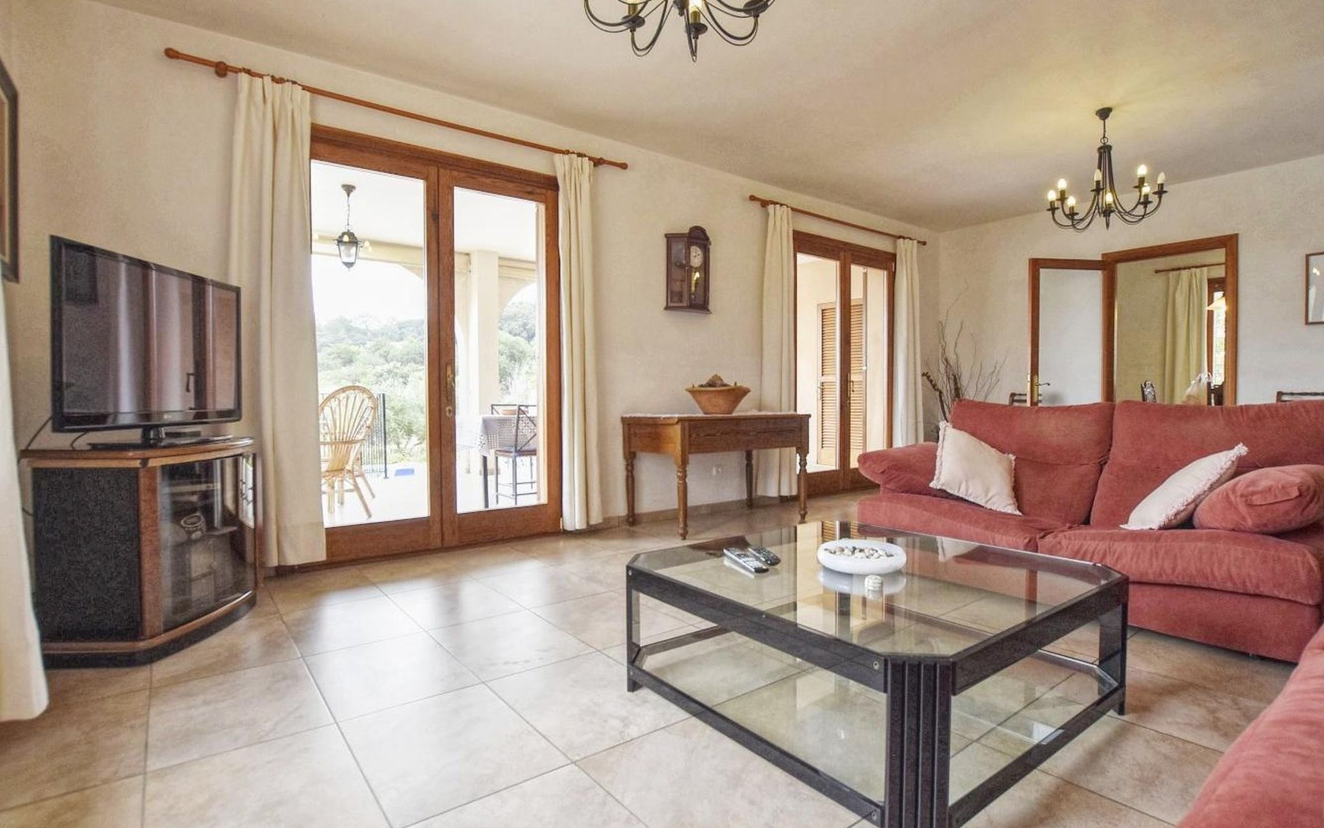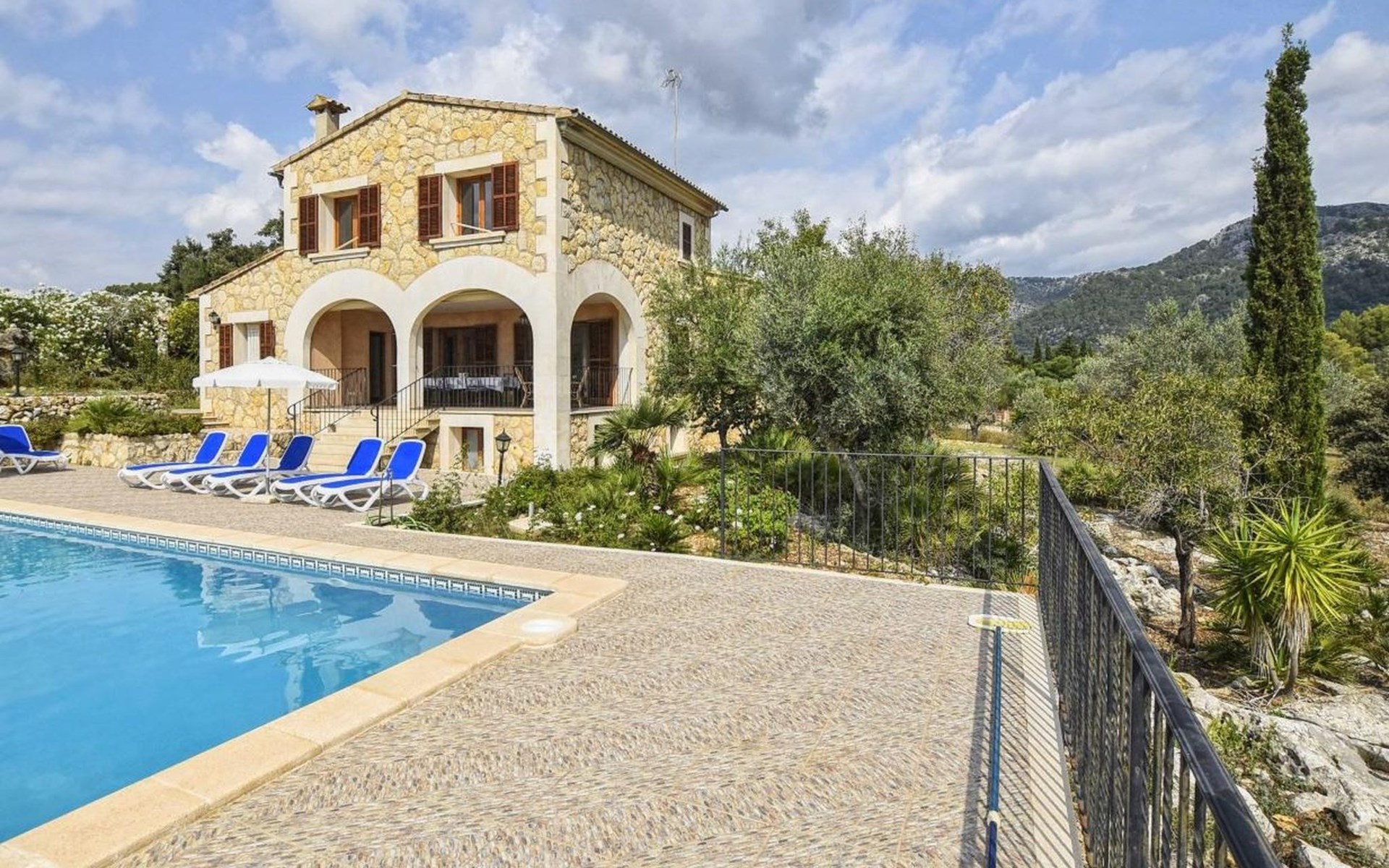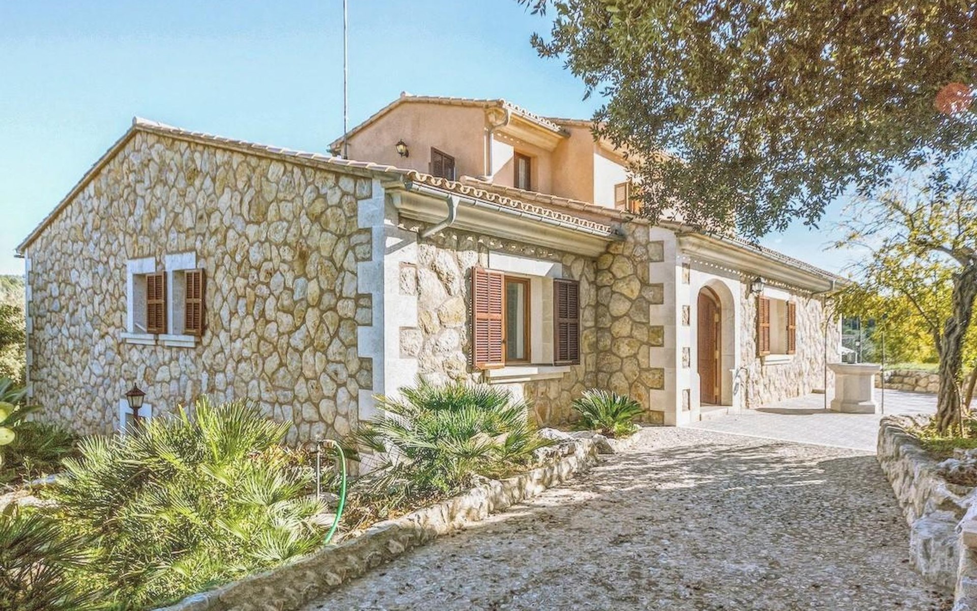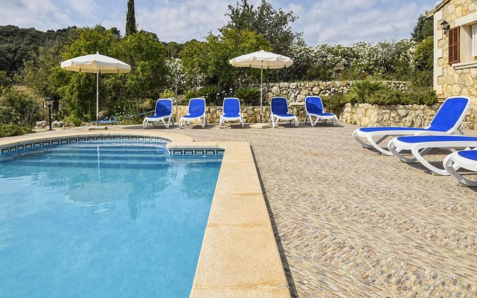 Campanet: Grosses, rustikales, komfortables Haus "Pla de Ses Rotes", Baujahr 2008, umgeben von Bäumen und Feldern. Im Ort Campanet, ruhige Lage, 18 km vom Meer, im Grünen. Zur Alleinbenutzung: Liegewiese 2'000 m2, wunderschöner Garten zum Entspannen, Schwimmbad eckig (10 x 5 m, saisonale Verfügbarkeit: 01.Mar. - 30.Okt.). Aussendusche, Sitzplatz, Pergola, Gartenmöbel, Grill. Im Hause: Internetzugang, Wireless LAN, Klimaanlage, Waschmaschine. Parkplatz auf dem Grundstück. Einkaufsgeschäft 1.3 km, Lebensmittelgeschäft 1.3 km, Supermarkt 1.3 km, Restaurant 1.3 km, Bushaltestelle 450 m, Sandstrand 18 km. Bitte beachten: Fahrzeug empfohlen. Geeignet für Familien, geeignet für Senioren Babyausstattung auf Anfrage (inkl.). Objekt geeignet für 11 Erwachsene. Der Besitzer akzeptiert keine Jugendgruppen. Be- und Entladen am Ferienhaus möglich. Flugplatz 45 km vom Haus.
