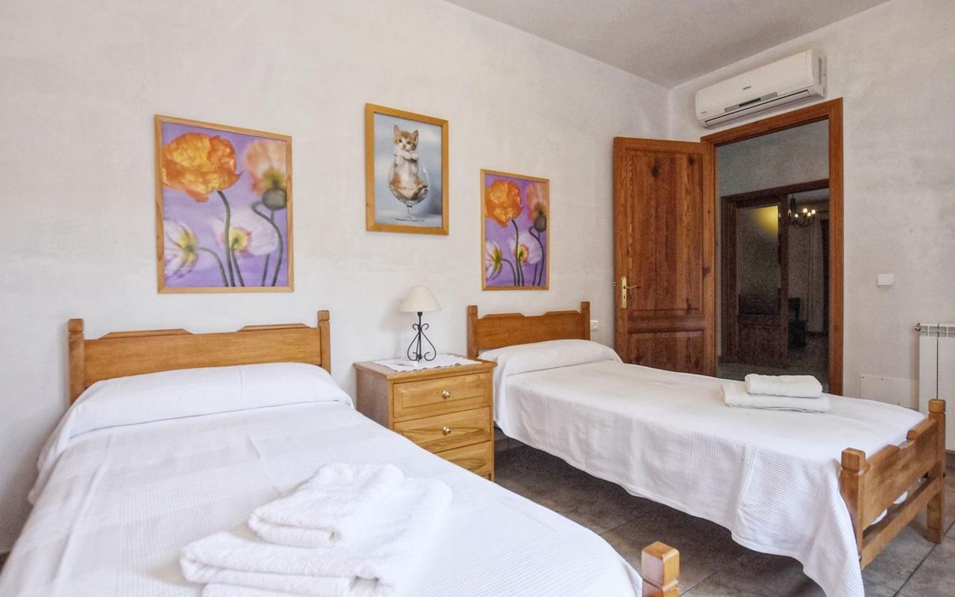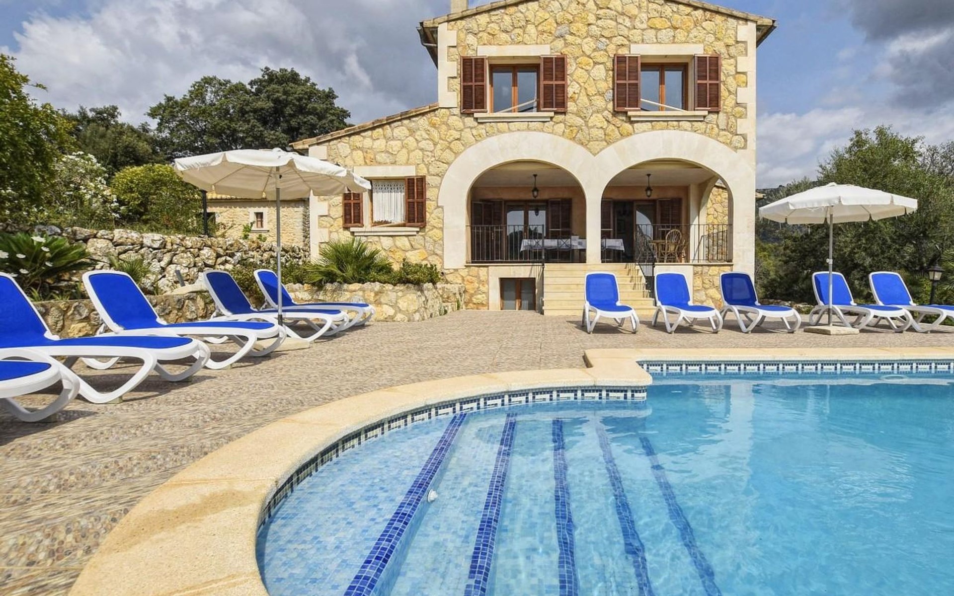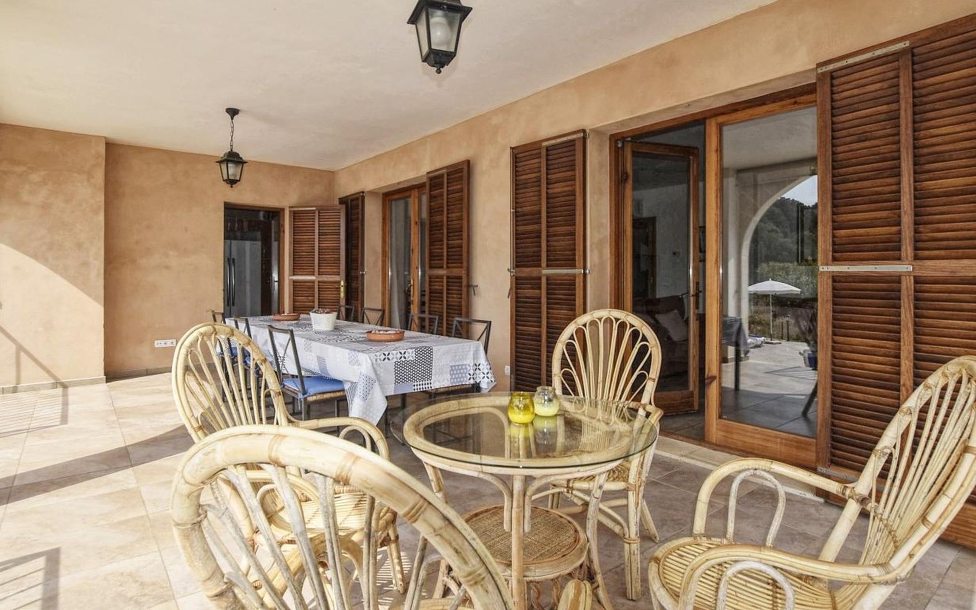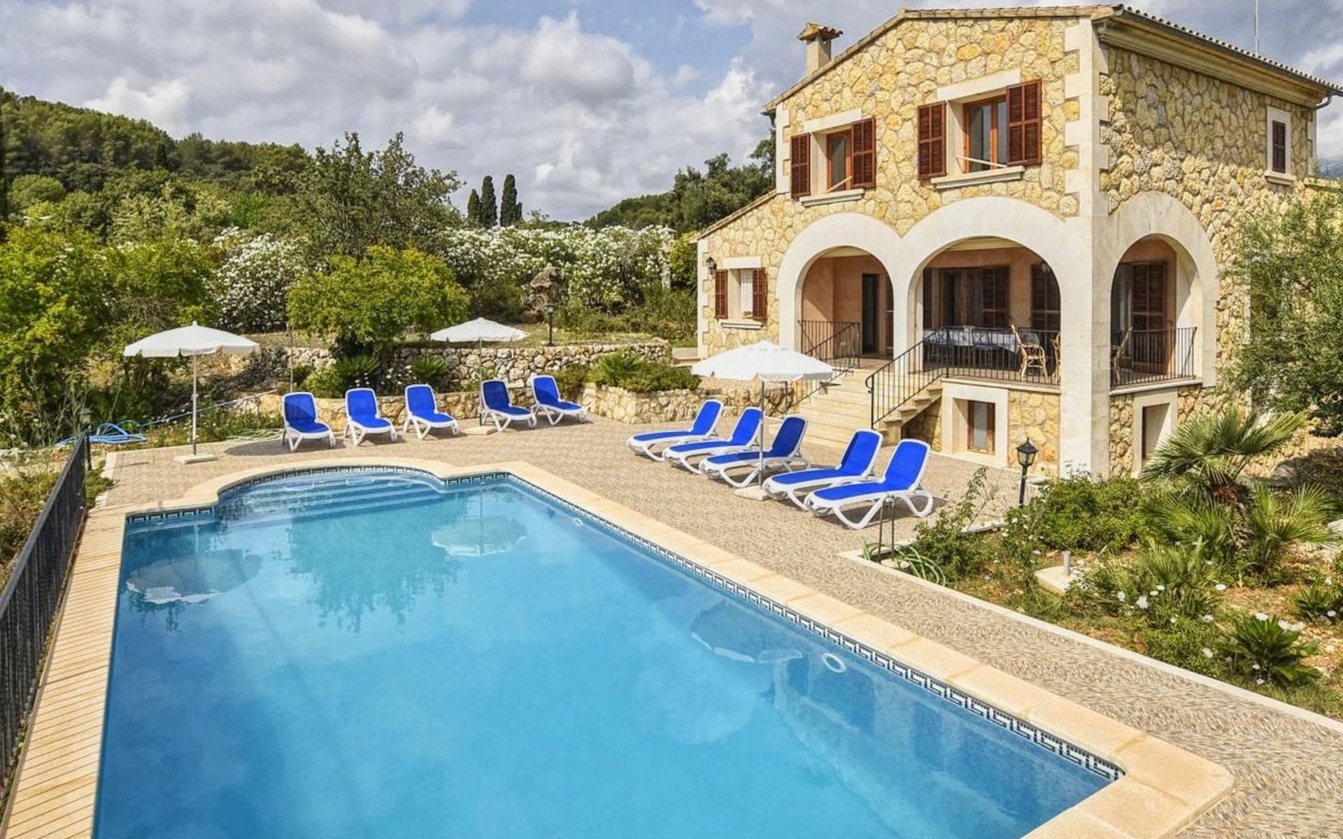 Campanet: Grosses, rustikales, komfortables Haus "Pla de Ses Rotes", Baujahr 2008, umgeben von Bäumen und Feldern. Im Ort Campanet, ruhige Lage, 18 km vom Meer, im Grünen. Zur Alleinbenutzung: Liegewiese 2'000 m2, wunderschöner Garten zum Entspannen, Schwimmbad eckig (10 x 5 m, saisonale Verfügbarkeit: 01.Mar. - 30.Okt.). Aussendusche, Sitzplatz, Pergola, Gartenmöbel, Grill. Im Hause: Internetzugang, Wireless LAN, Klimaanlage, Waschmaschine. Parkplatz auf dem Grundstück. Einkaufsgeschäft 1.3 km, Lebensmittelgeschäft 1.3 km, Supermarkt 1.3 km, Restaurant 1.3 km, Bushaltestelle 450 m, Sandstrand 18 km. Bitte beachten: Fahrzeug empfohlen. Geeignet für Familien, geeignet für Senioren Babyausstattung auf Anfrage (inkl.). Objekt geeignet für 11 Erwachsene. Der Besitzer akzeptiert keine Jugendgruppen. Be- und Entladen am Ferienhaus möglich. Flugplatz 45 km vom Haus.