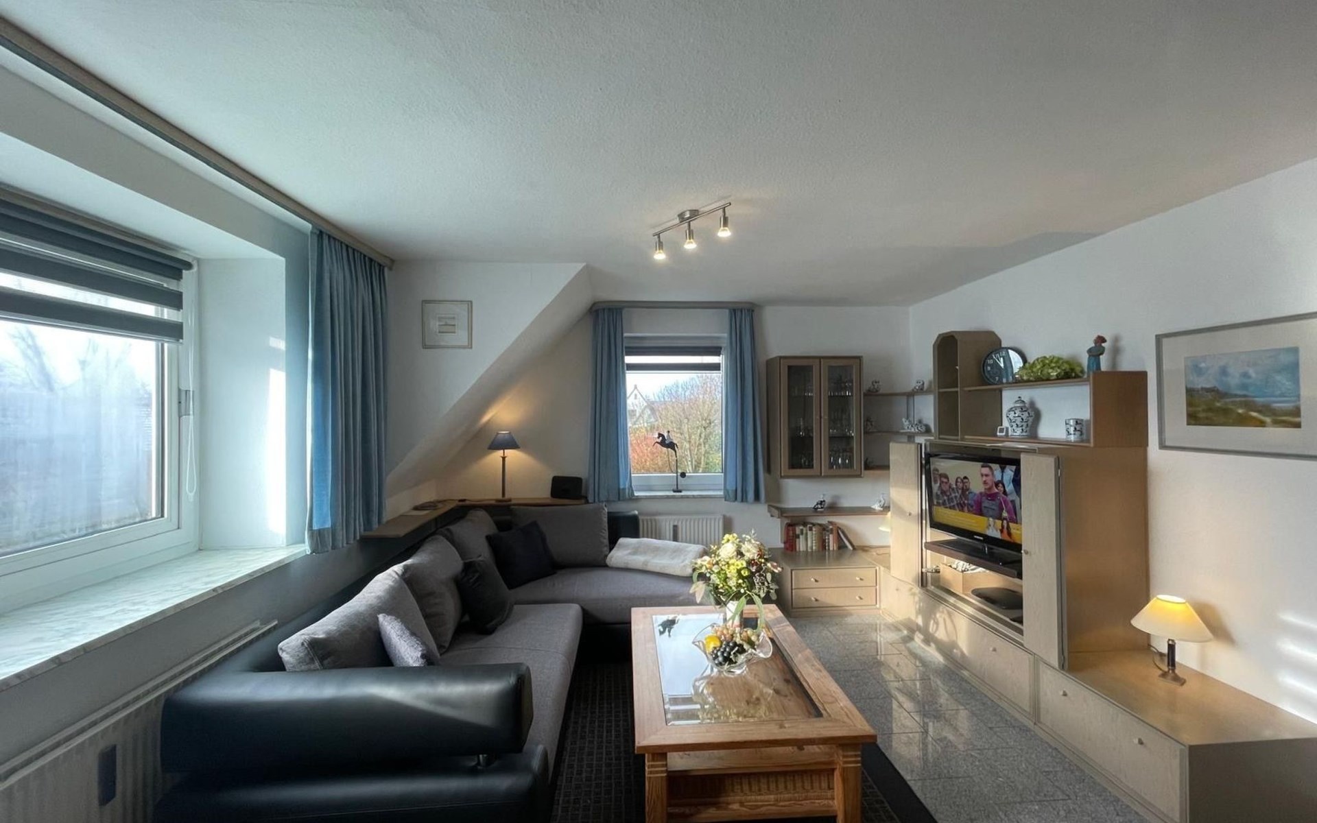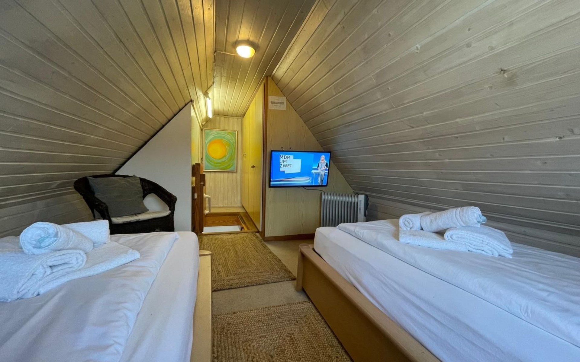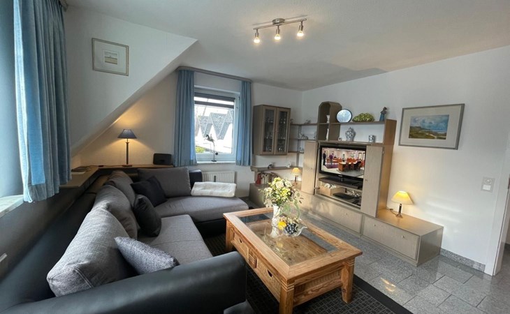 Innen lädt die Wohnung mit ihrem modern ausgestatteten Wohnzimmer ein, das einen amerikanischen Küchenbereich mit Kühlschrank, Herd, Backofen, Spülmaschine, Kaffeemaschine, Wasserkocher, Toaster und vielem mehr umfasst. Hier finden Sie alles, was auch Ihre Küche zu Hause bietet. Außerdem gibt es ein ausziehbares Schlafsofa für zwei Gäste. Ein separates Schlafzimmer bieten zwei neue Einzel Bockspringbetten, Fernseher & Fenster, während das zweite Schlafzimmer im ausgebauten Dachgeschoss mit zwei Einzelbetten und einem Fernseher aufwartet.