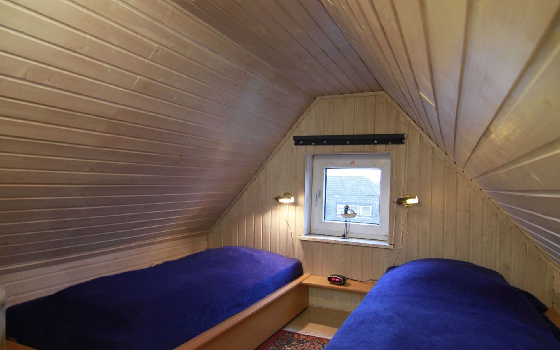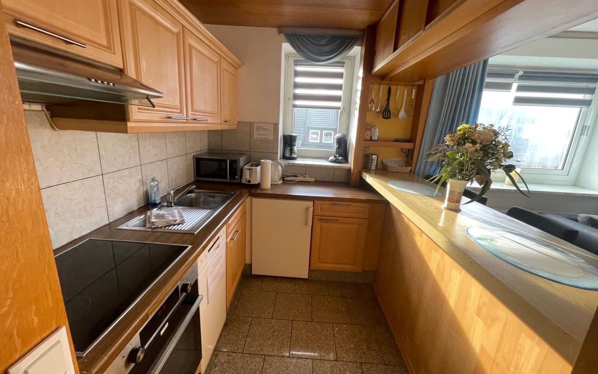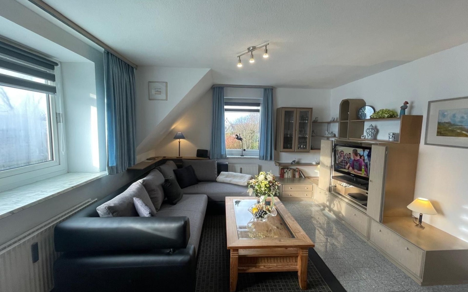 Innen lädt die Wohnung mit ihrem modern ausgestatteten Wohnzimmer ein, das einen amerikanischen Küchenbereich mit Kühlschrank, Herd, Backofen, Spülmaschine, Kaffeemaschine, Wasserkocher, Toaster und vielem mehr umfasst. Hier finden Sie alles, was auch Ihre Küche zu Hause bietet. Außerdem gibt es ein ausziehbares Schlafsofa für zwei Gäste. Ein separates Schlafzimmer bieten zwei neue Einzel Bockspringbetten, Fernseher & Fenster, während das zweite Schlafzimmer im ausgebauten Dachgeschoss mit zwei Einzelbetten und einem Fernseher aufwartet.