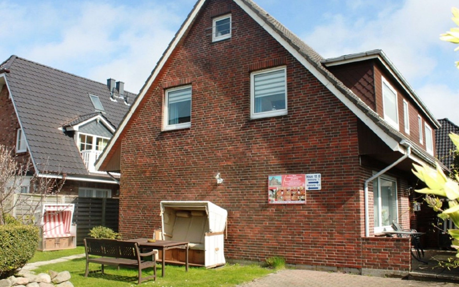 Der Außenbereich überzeugt mit einer Rasenfläche direkt vor und hinter dem Haus, ausgestattet mit einem Strandkorb und Gartenmöbeln. Dank der Südlage der Wohnung können Sie hier herrliche Morgenstunden beim Frühstück im Freien genießen oder abendliche Grillfeste mit Freunden veranstalten. Zudem gehört zu jeder der vier Ferienwohnungen ein fest reservierter Parkplatz.