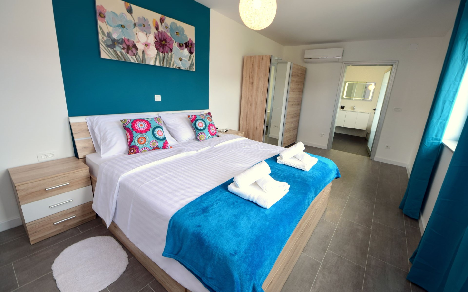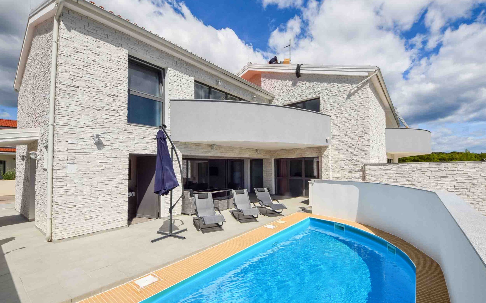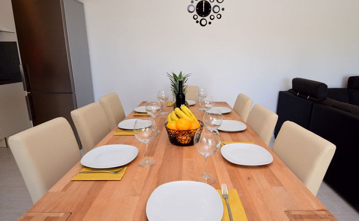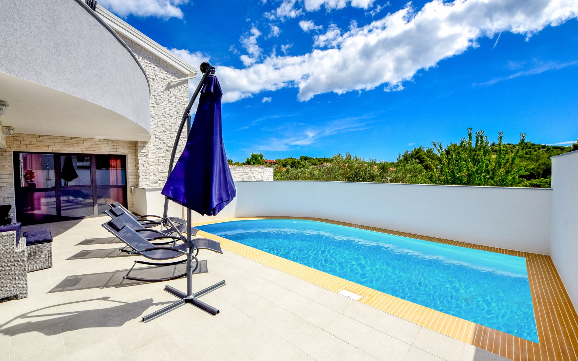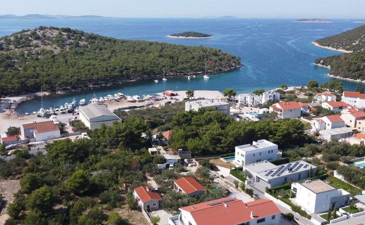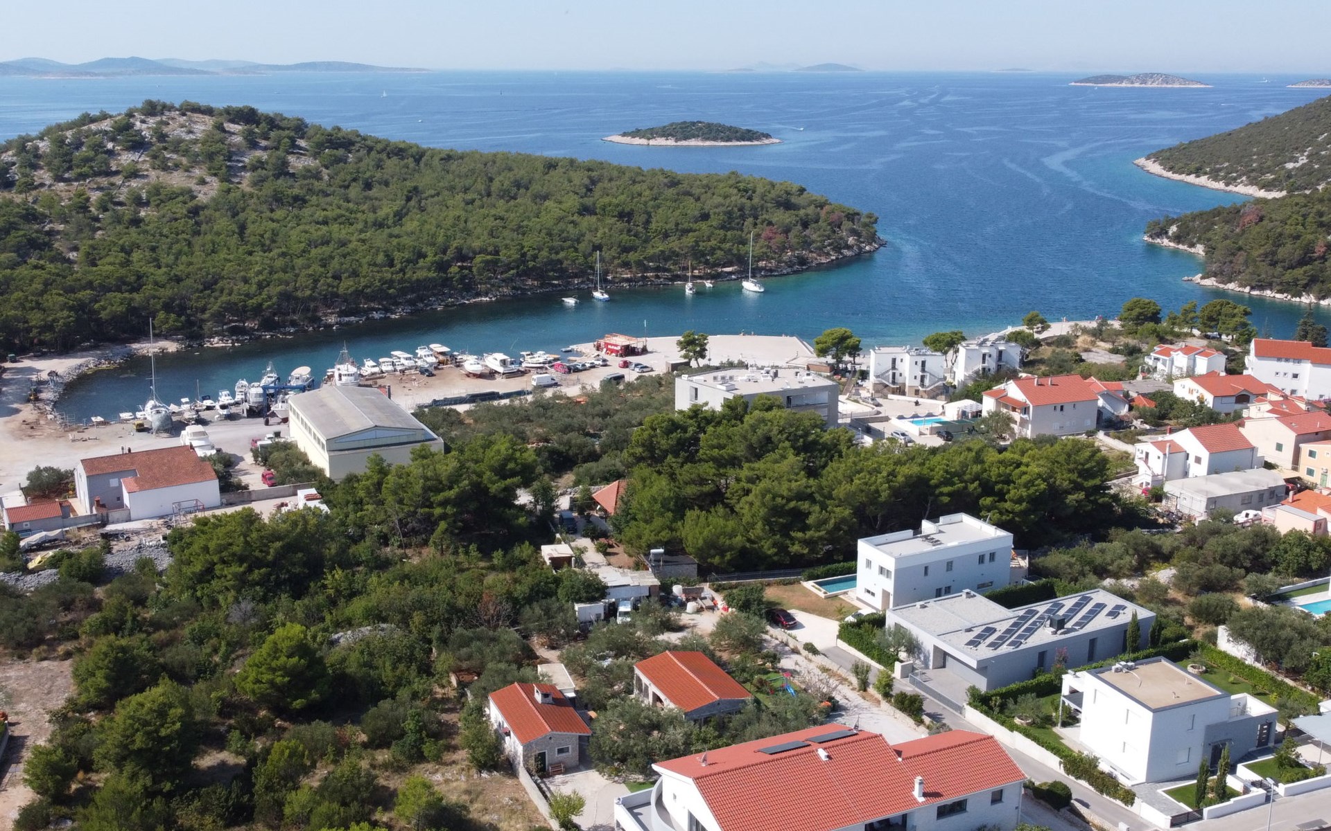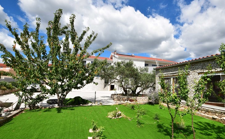 Tribunj 5 km von Vodice: Doppelhaus "West", auf 2 Stockwerken, Baujahr 2018. Im Weiler Sovlje, 1.5 km vom Zentrum von Tribunj, ruhige, sonnige Lage, 250 m vom Meer, 450 m vom Strand. Zur Mitbenutzung: Grundstück 400 m2. Gartenmöbel, Grill, Kinderspielplatz (Rutschbahn, Schaukel). Zur Alleinbenutzung: Schwimmbad beheizt (20 m2, 150 cm tief, saisonale Verfügbarkeit: 01.Mai. - 31.Okt.) mit Innentreppe. Ungleichmässige Schwimmbadform, WC im Poolbereich, Aussendusche. Im Hause: Internetzugang, Waschmaschine, Wäschetrockner. Koch möglich (extra). Parkplatz (für 3 Autos) beim Haus auf dem Grundstück. Einkaufsgeschäft 1 km, Restaurant 200 m, Bushaltestelle 5.2 km, Kieselstrand, betonierter Strand 450 m.