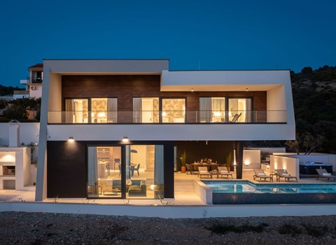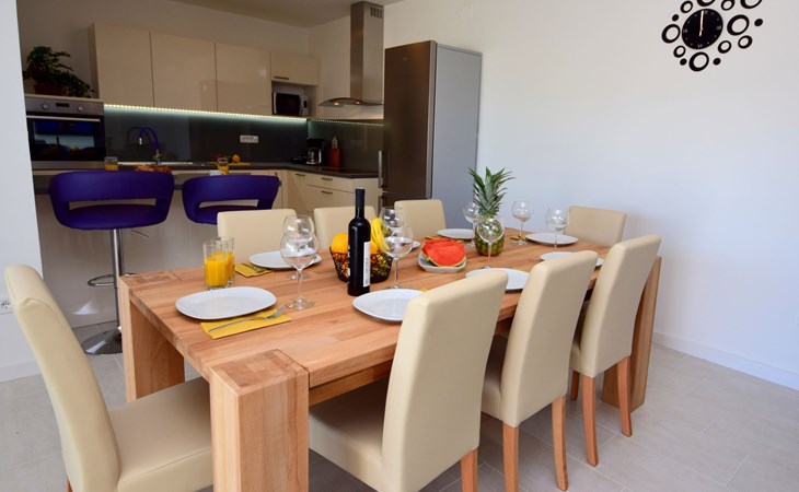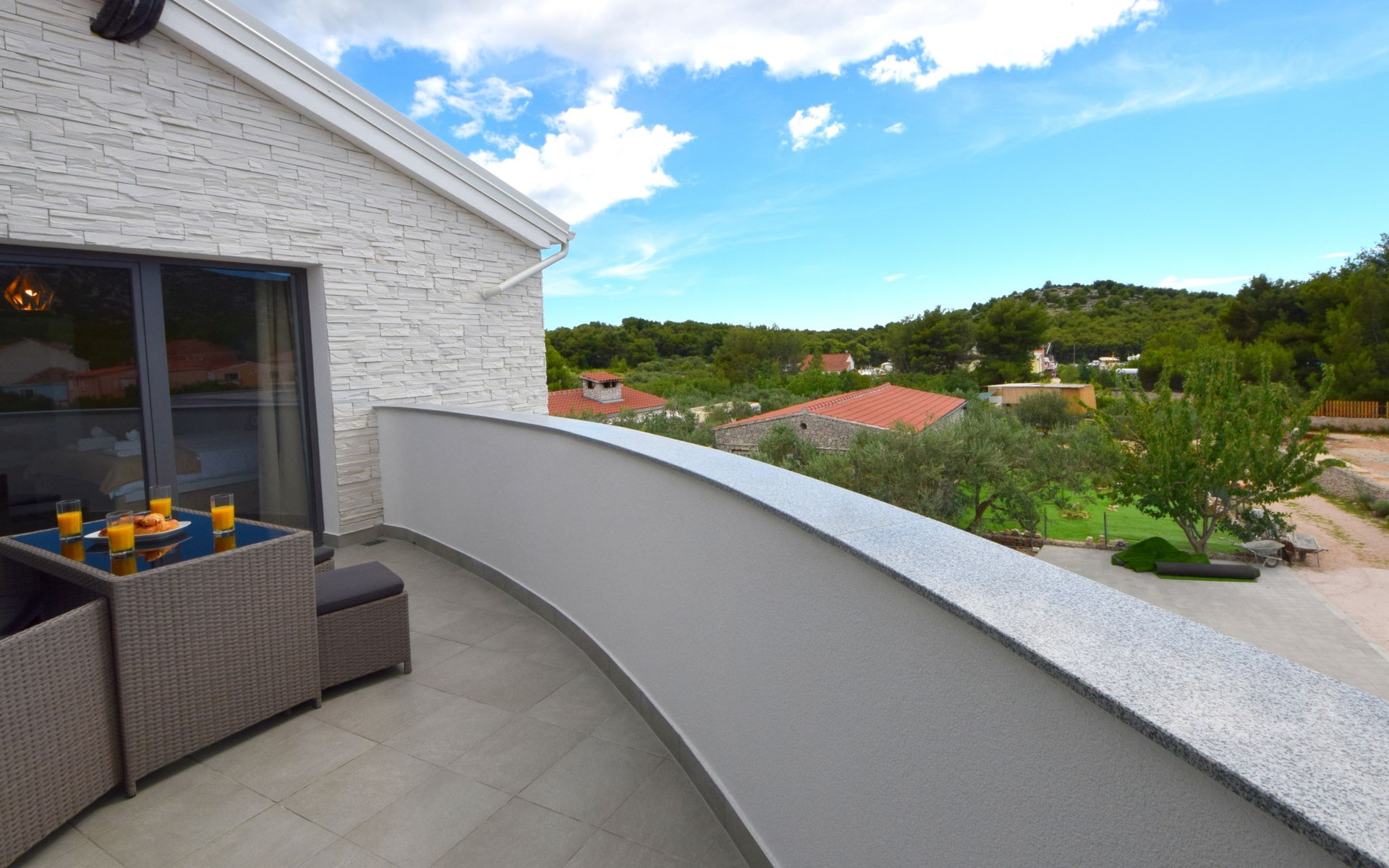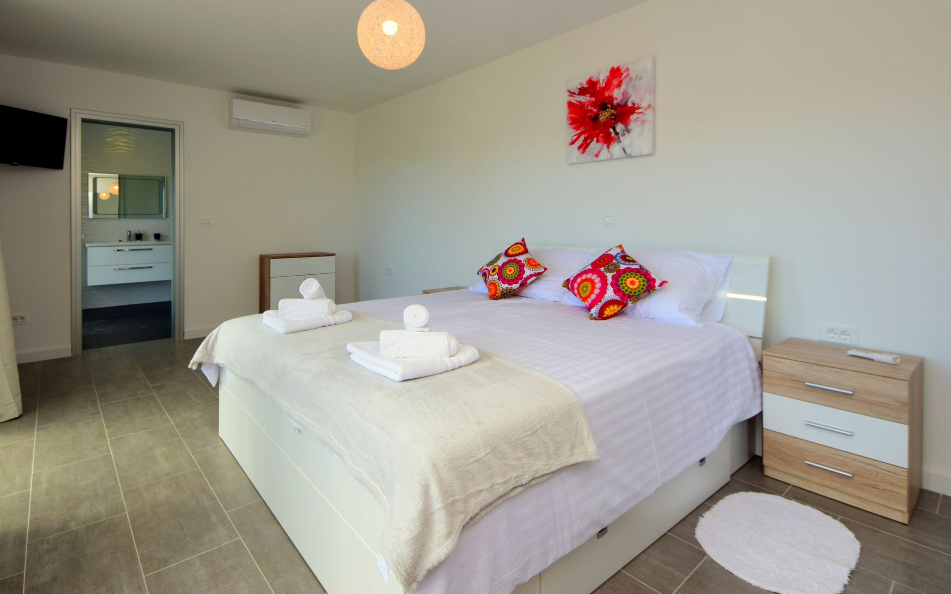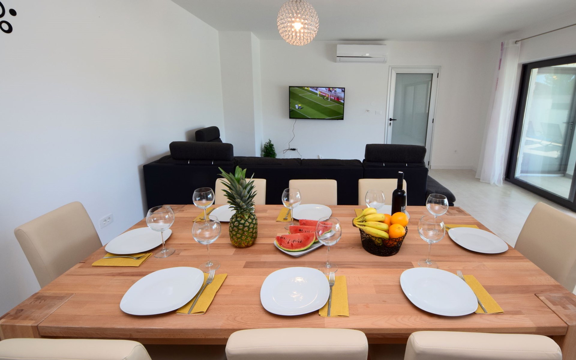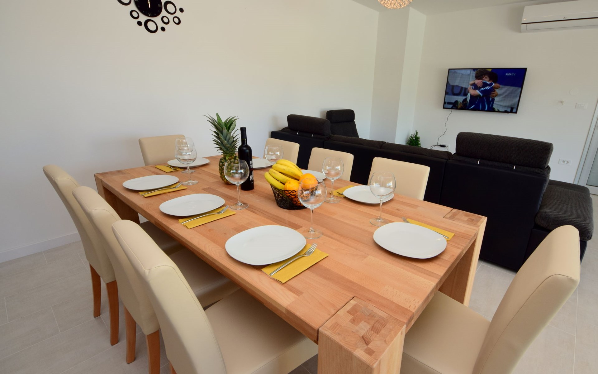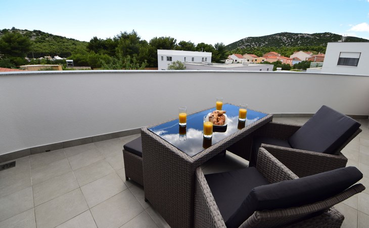 Tribunj 5 km von Vodice: Doppelhaus "West", auf 2 Stockwerken, Baujahr 2018. Im Weiler Sovlje, 1.5 km vom Zentrum von Tribunj, ruhige, sonnige Lage, 250 m vom Meer, 450 m vom Strand. Zur Mitbenutzung: Grundstück 400 m2. Gartenmöbel, Grill, Kinderspielplatz (Rutschbahn, Schaukel). Zur Alleinbenutzung: Schwimmbad beheizt (20 m2, 150 cm tief, saisonale Verfügbarkeit: 01.Mai. - 31.Okt.) mit Innentreppe. Ungleichmässige Schwimmbadform, WC im Poolbereich, Aussendusche. Im Hause: Internetzugang, Waschmaschine, Wäschetrockner. Koch möglich (extra). Parkplatz (für 3 Autos) beim Haus auf dem Grundstück. Einkaufsgeschäft 1 km, Restaurant 200 m, Bushaltestelle 5.2 km, Kieselstrand, betonierter Strand 450 m.