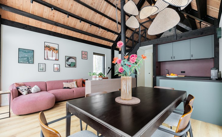 Am Esstisch für sechs Personen genießen Sie lange Abendessen, Spieleabende und den Blick ins Grüne. Die Sitzecke lädt zum Entspannen ein mit Smart-TV, Soundbar und einem stimmungsvollen Jacobus-Holzofen. Außerdem steht ein Bluetooth-Lautsprecher für Ihre Lieblingsmusik zur Verfügung.