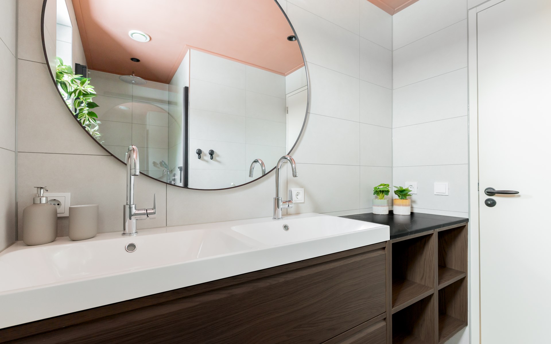 Das luxuriöse Badezimmer verfügt über ein Doppelwaschbecken mit viel Stauraum, Fußbodenheizung und eine moderne Regendusche. Zusätzlich gibt es eine separate Toilette.