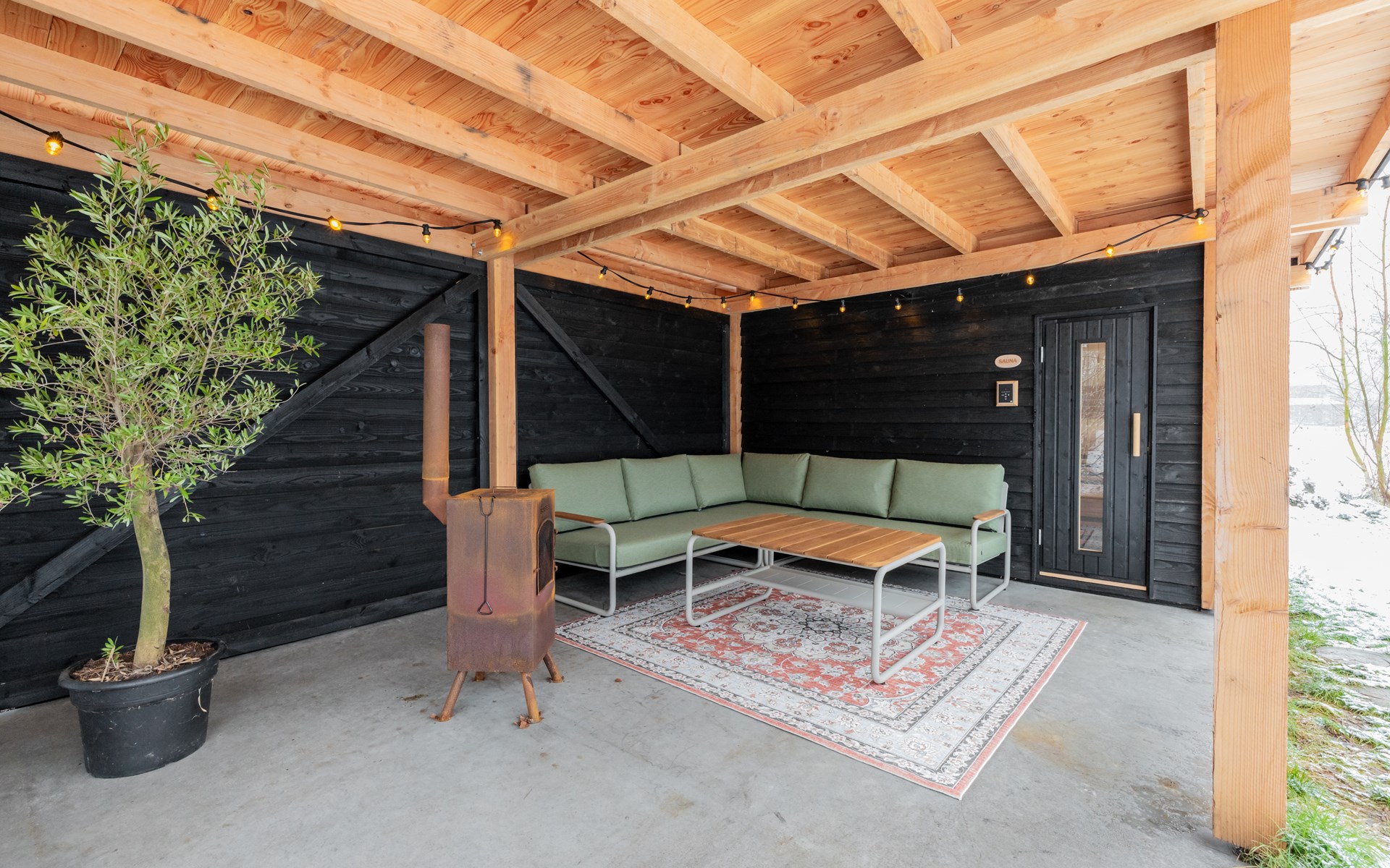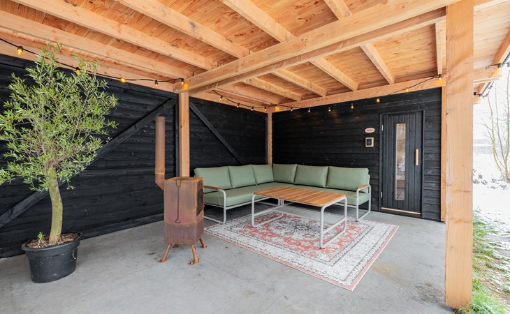 Durch die Flügeltüren gelangen Sie direkt in den Garten. Hier befindet sich eine großzügige Überdachung mit einer luxuriösen Loungegarnitur, unter der Sie geschützt sitzen und den ganzen Tag die Sonne genießen können. An warmen Sommertagen sorgen die schattigen Plätze im Garten für angenehme Abkühlung. Ein Außen-Holzofen ist ebenfalls vorhanden und kann auch als Grill genutzt werden.