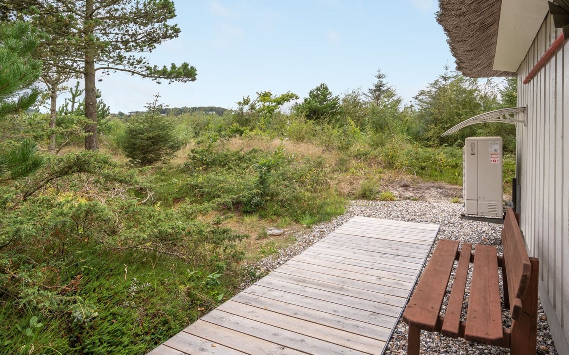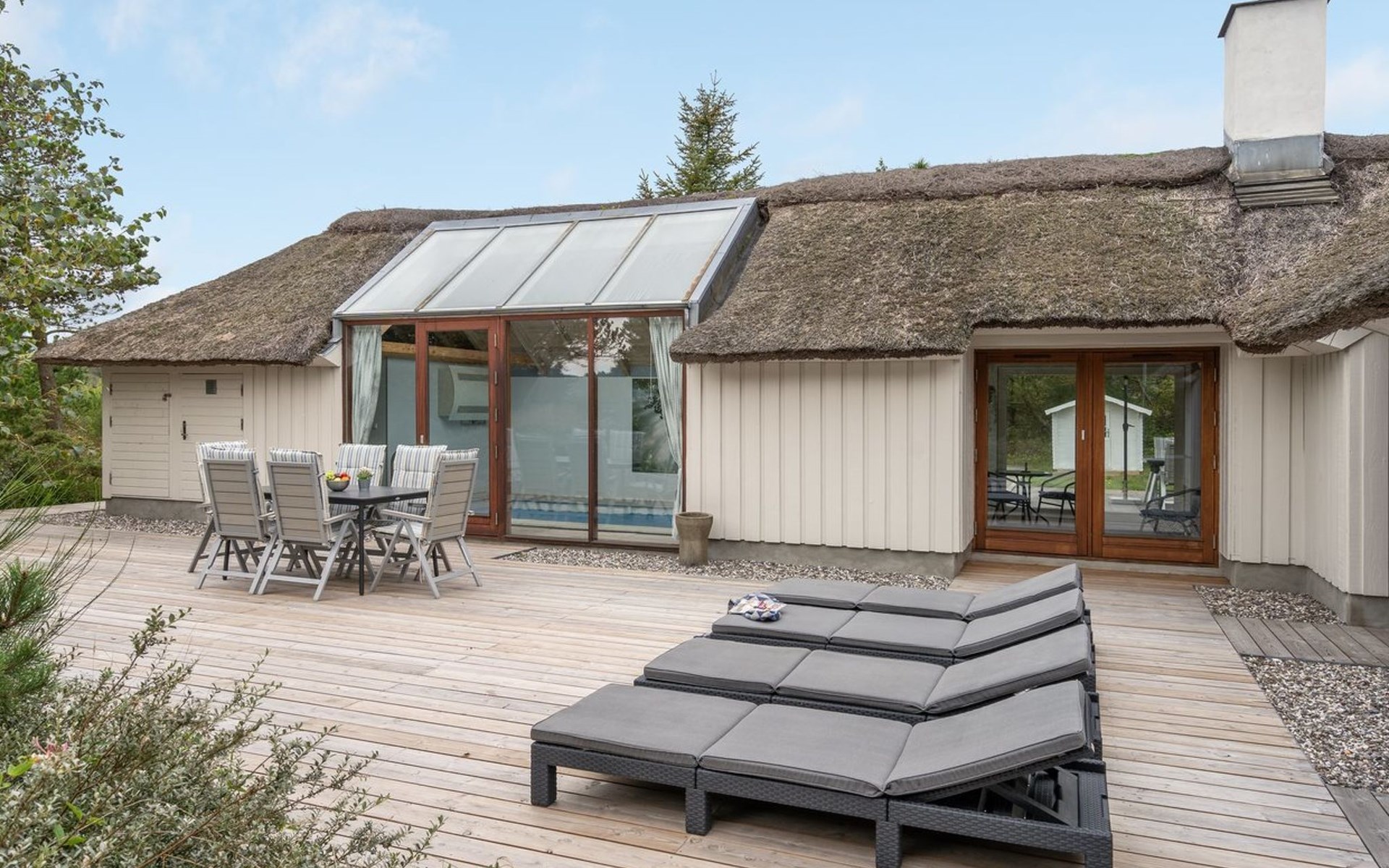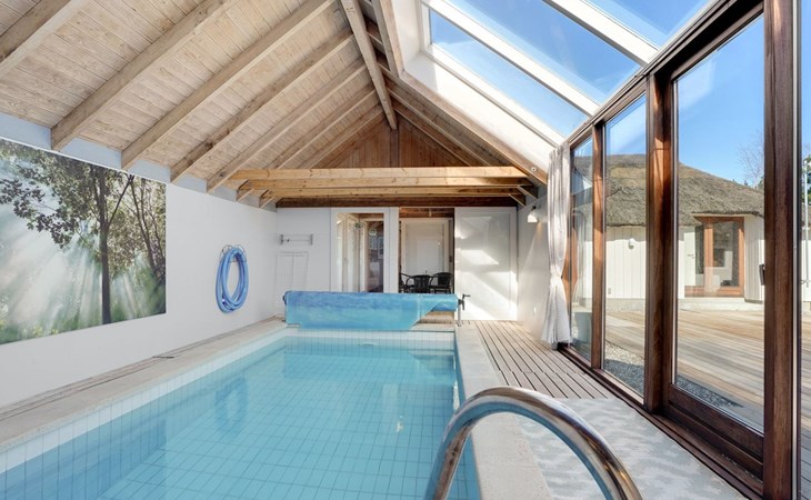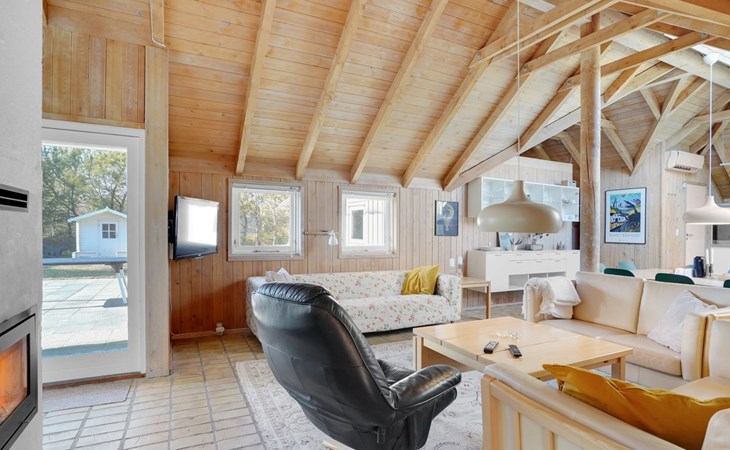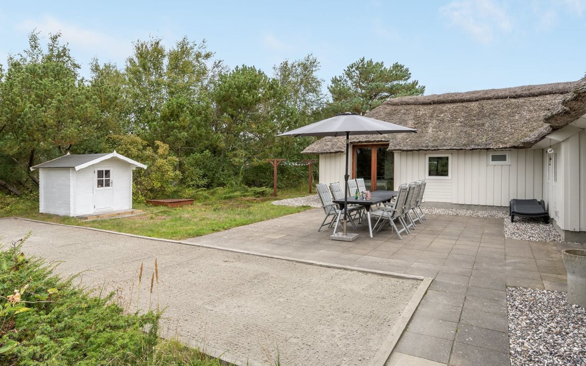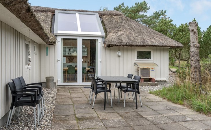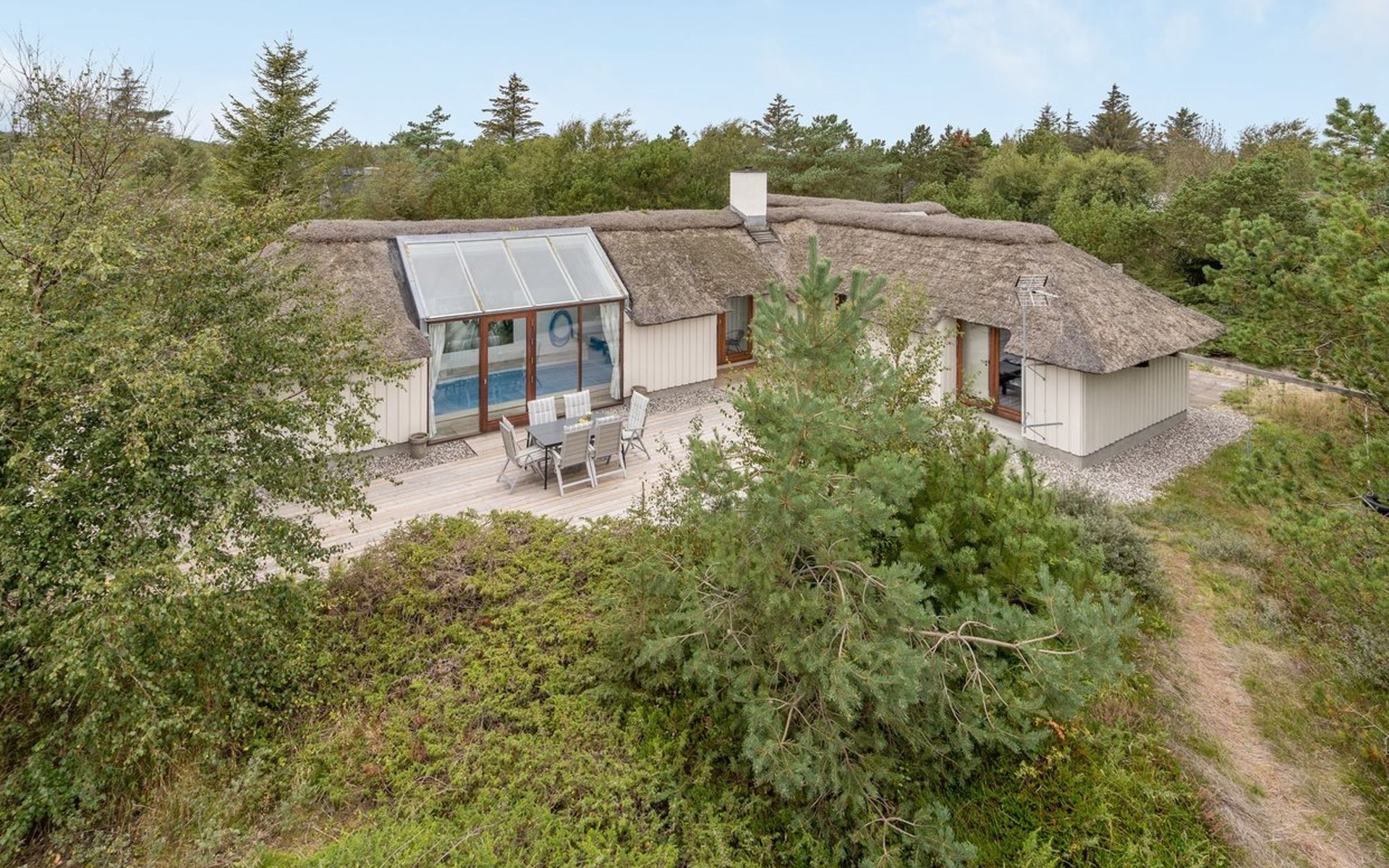 Einfamilienhaus, Baujahr 1988. 900 m vom Meer. Zur Alleinbenutzung: naturbelassenes Grundstück 2'000 m2, Hallenbad (3 x 6 m, 18 m2, 140 - 140 cm tief). Terrasse (100 m2), Grill, Kinderspielplatz (Schaukel). Im Hause: Sauna, Waschmaschine, Wäschetrockner. Parkplatz beim Haus. E-Ladestation. Lebensmittelgeschäft 2.5 km. Golfplatz 13 km. Der Besitzer akzeptiert keine Jugendgruppen.