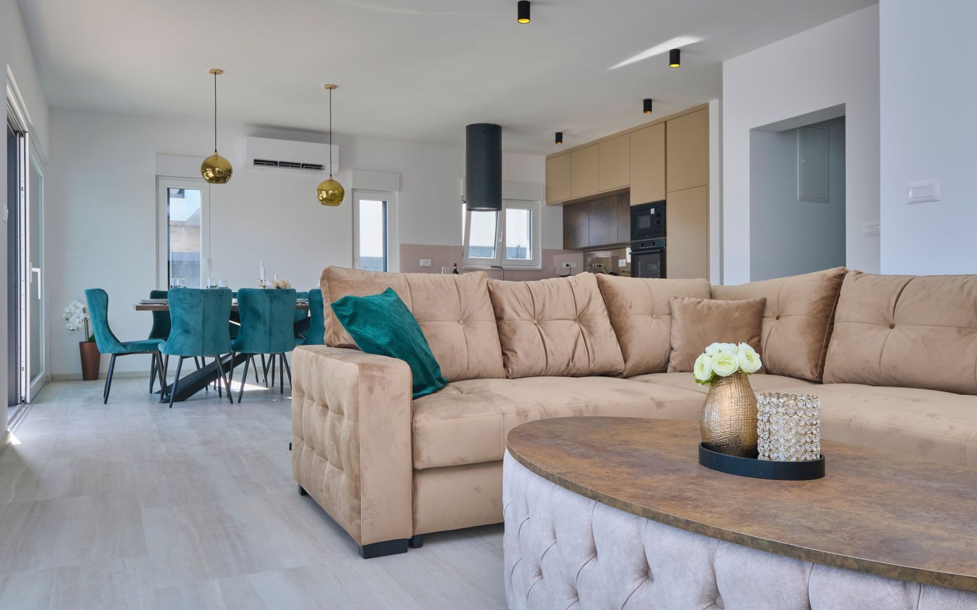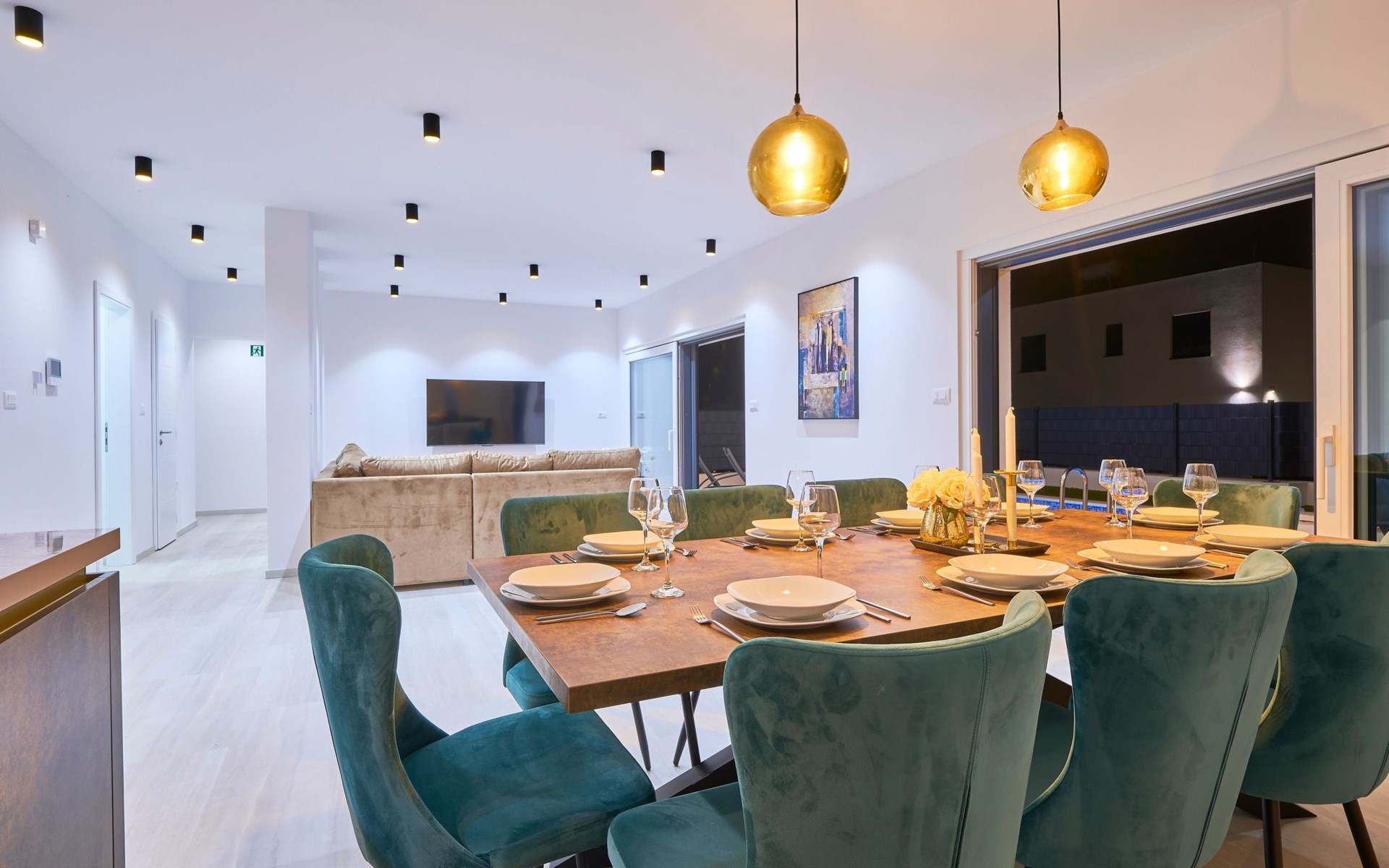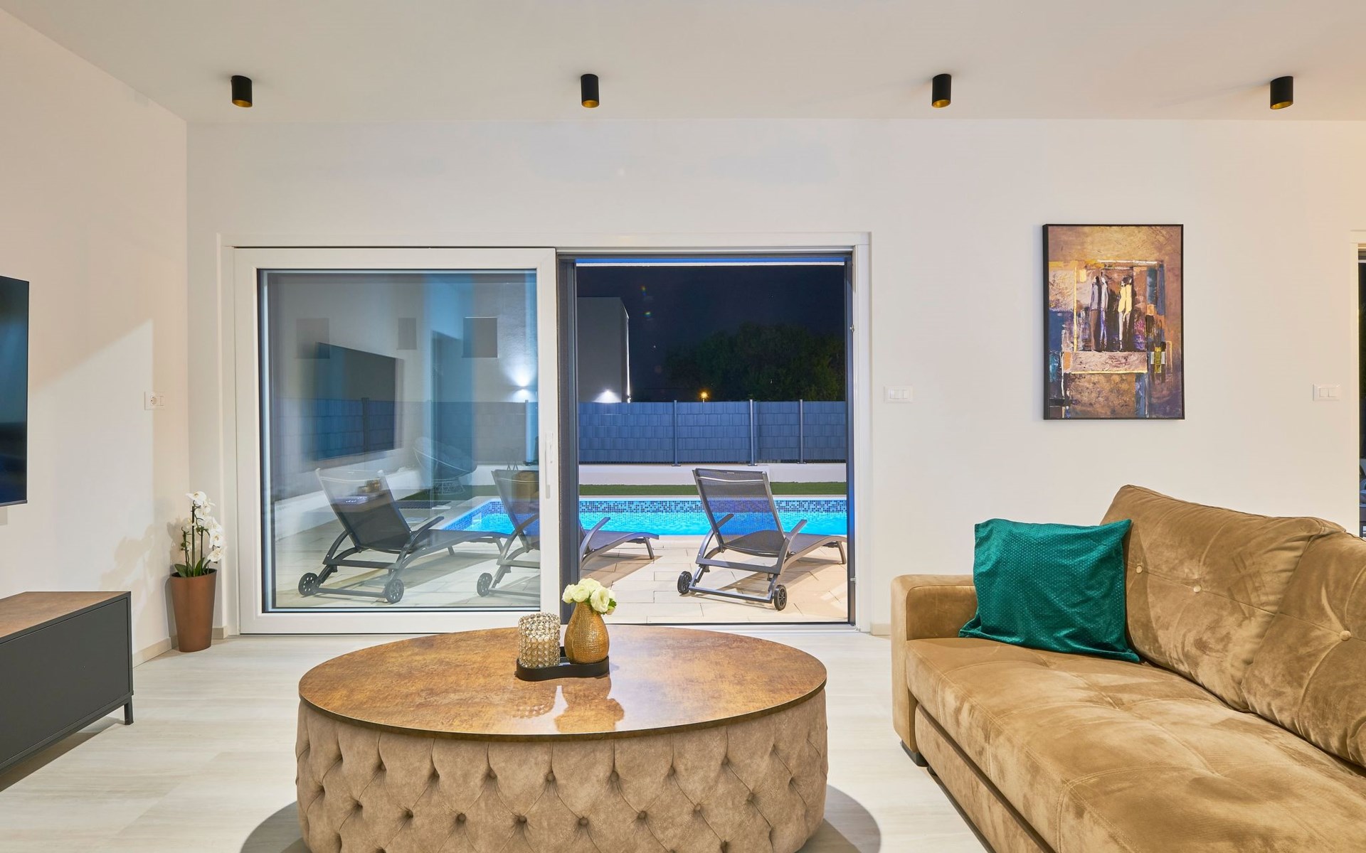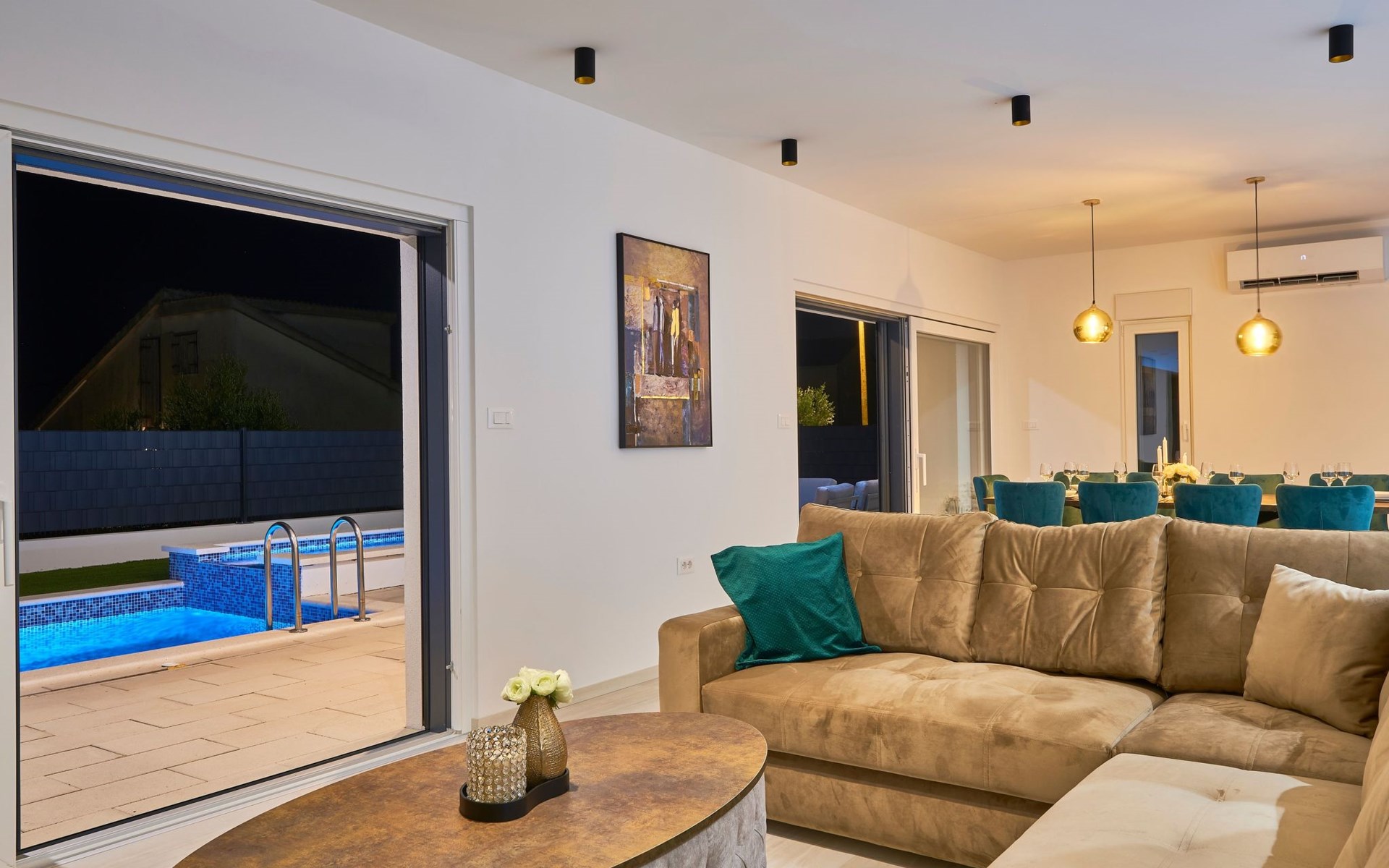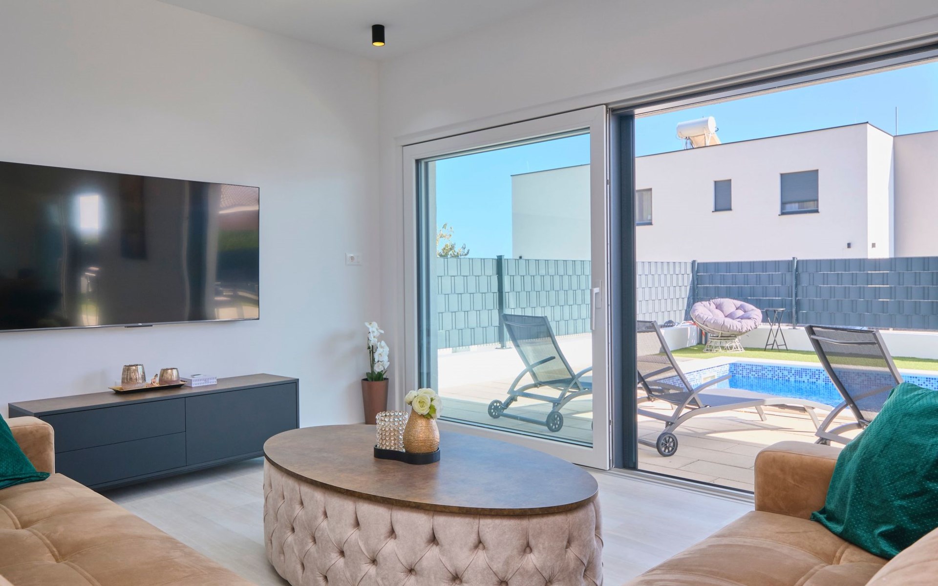 Im Erdgeschoss befindet sich ein geräumiges und komfortables Wohnzimmer mit einem Smart-TV und einem Ausgang zum Poolbereich. Ein offener Raum führt zum Esszimmer und zur Küche mit einem Abstellraum. Außerdem gibt es ein Schlafzimmer mit eigenem Bad und ein Gäste-WC.