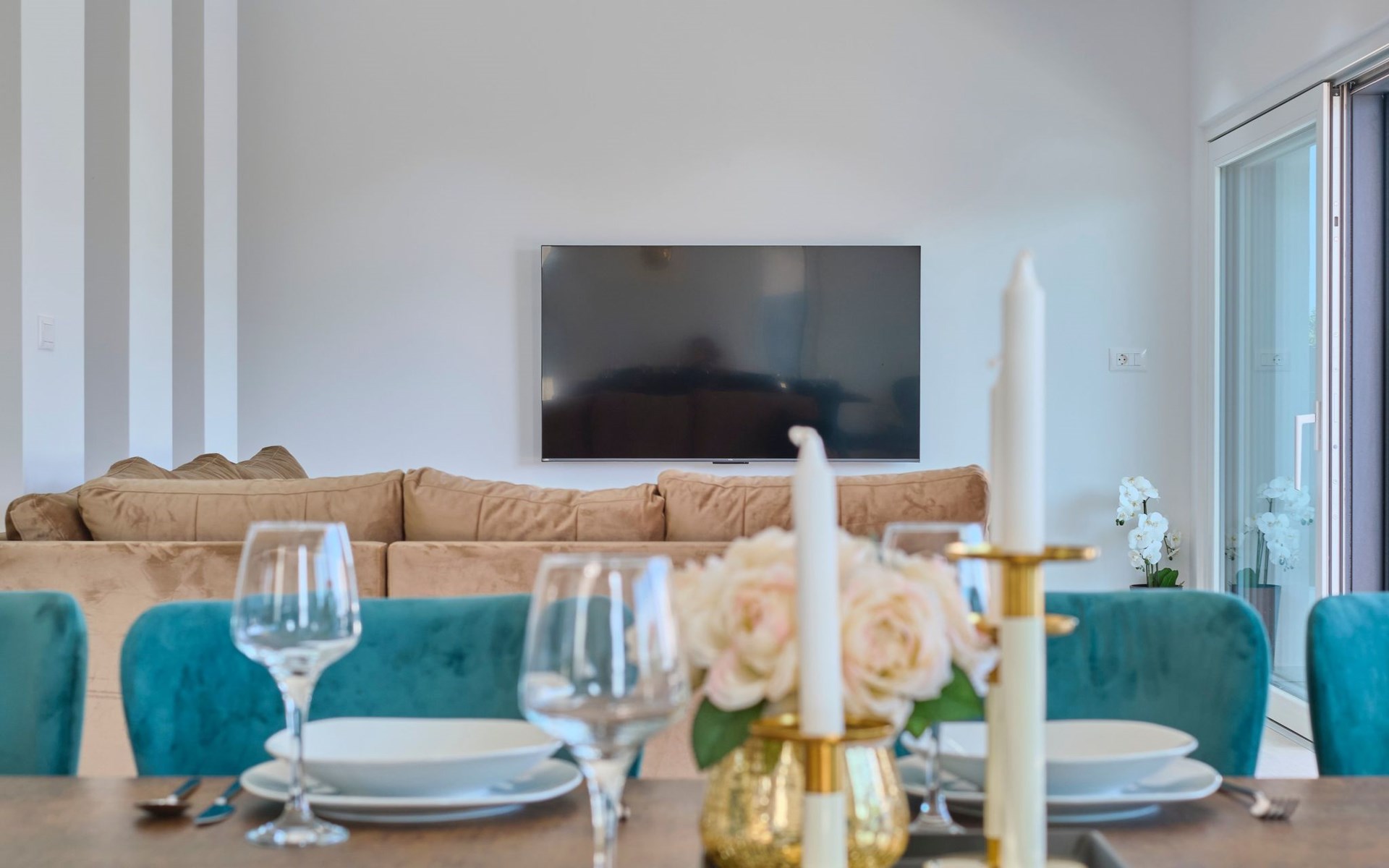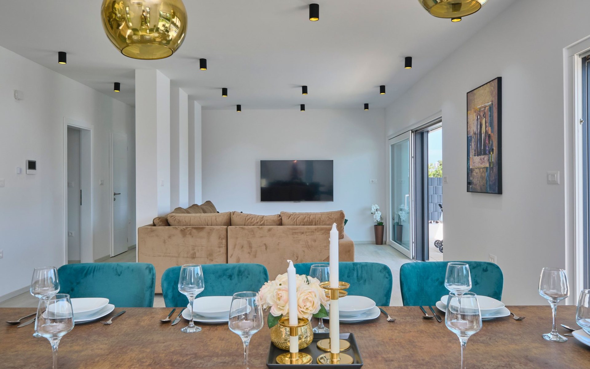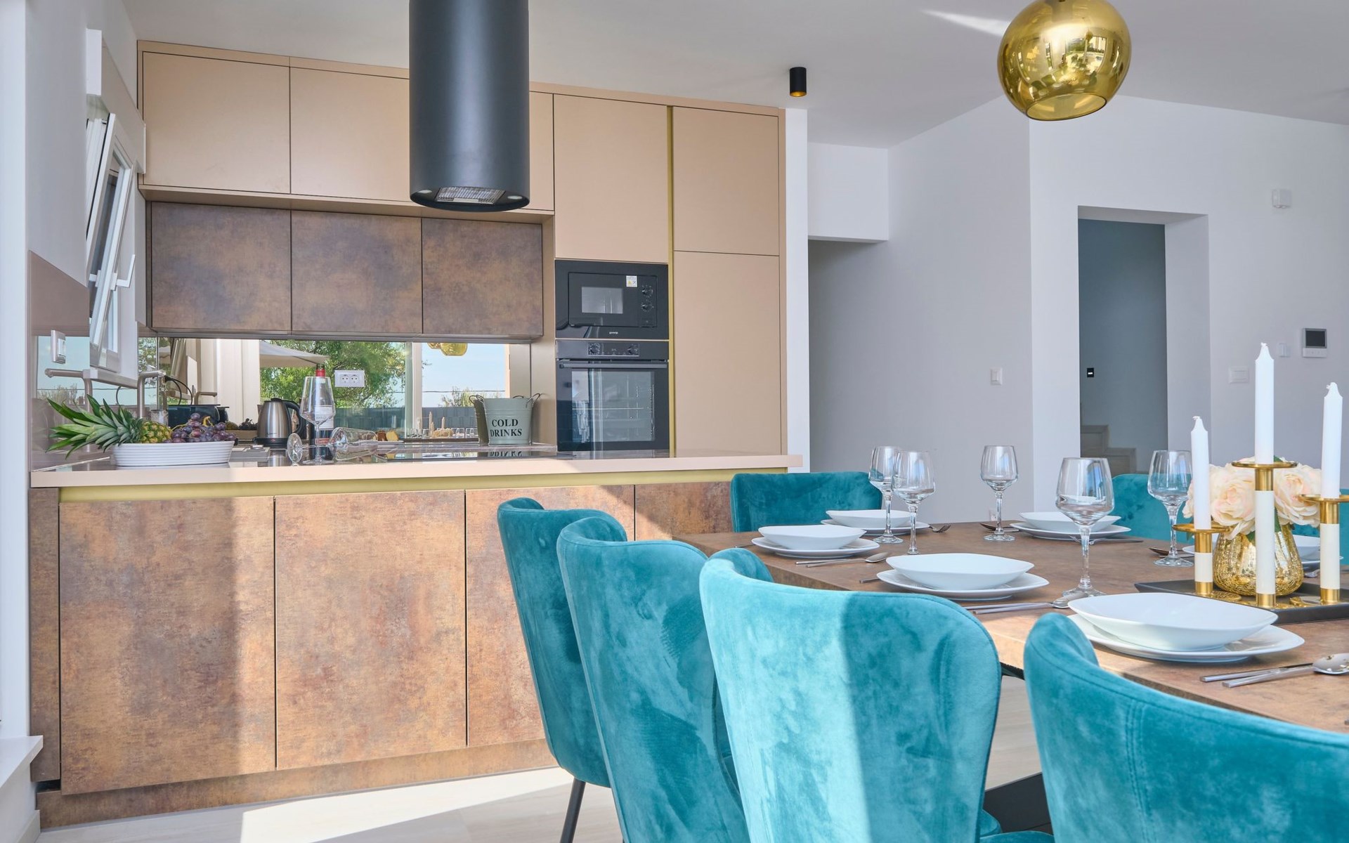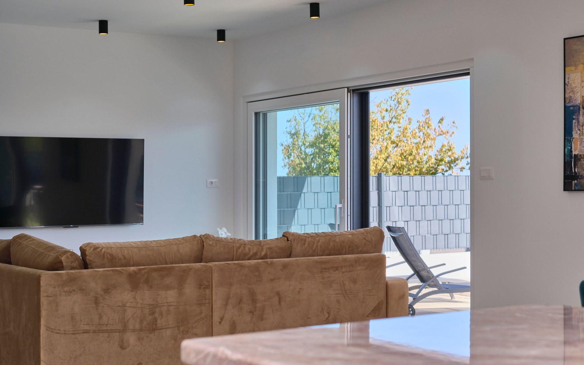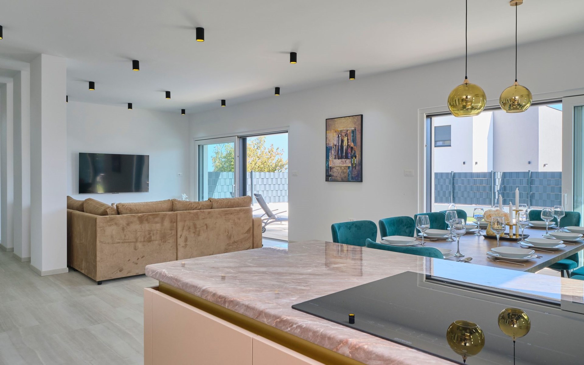 Im Erdgeschoss befindet sich ein geräumiges und komfortables Wohnzimmer mit einem Smart-TV und einem Ausgang zum Poolbereich. Ein offener Raum führt zum Esszimmer und zur Küche mit einem Abstellraum. Außerdem gibt es ein Schlafzimmer mit eigenem Bad und ein Gäste-WC.