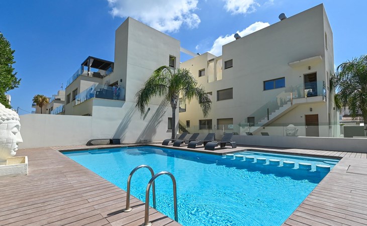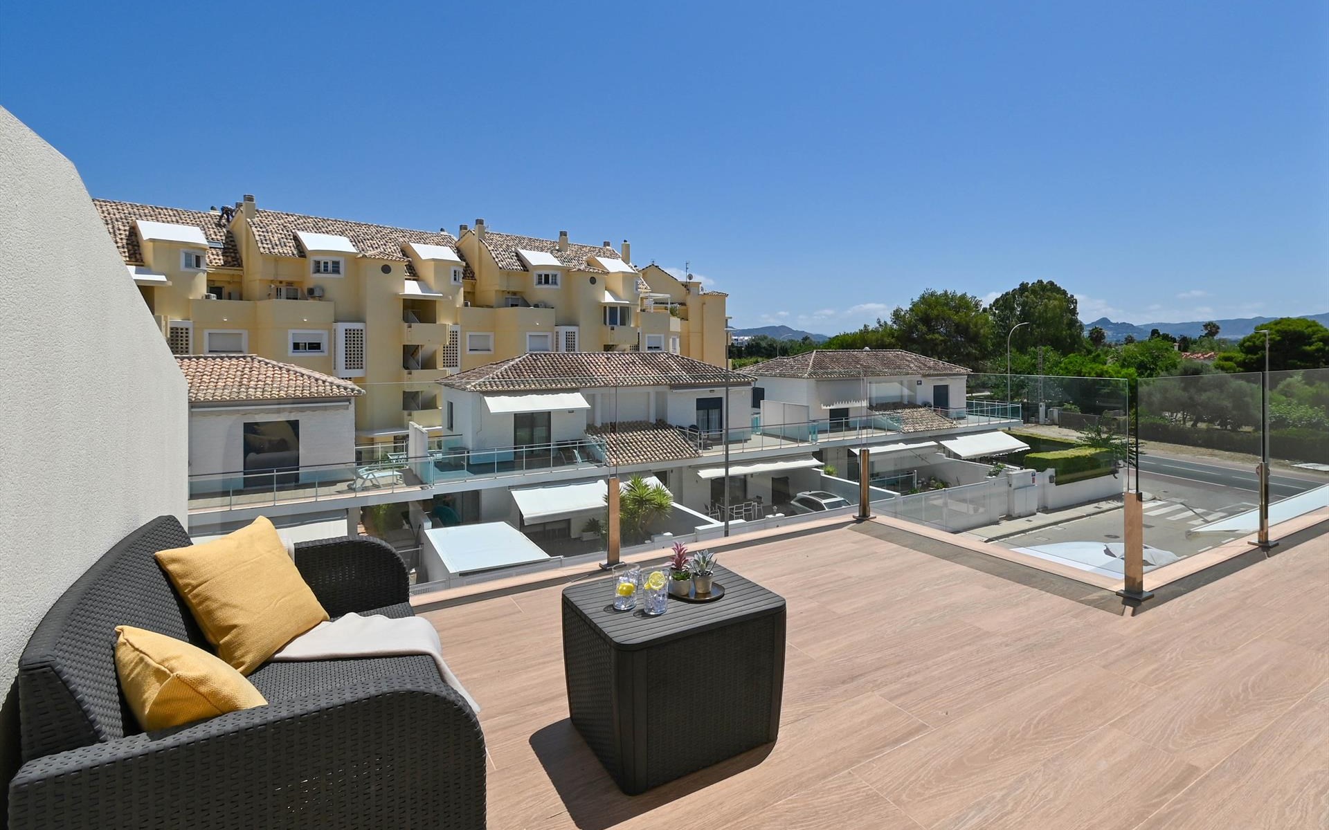 Schöne und komfortable Wohnung mit Gemeinschaftspool in Denia, Costa Blanca, Spanien für 6 Personen. Die Wohnung befindet sich in einem Wohngebiet am Strand, in der Nähe von Supermärkten, 25 m vom Playa de L'Estanyo Strand, 4 km von El Vergel und 0,025 km vom Mittelmeer entfernt.