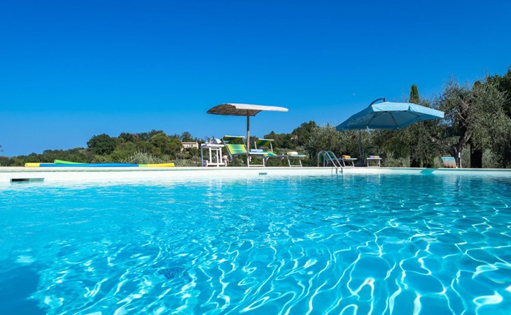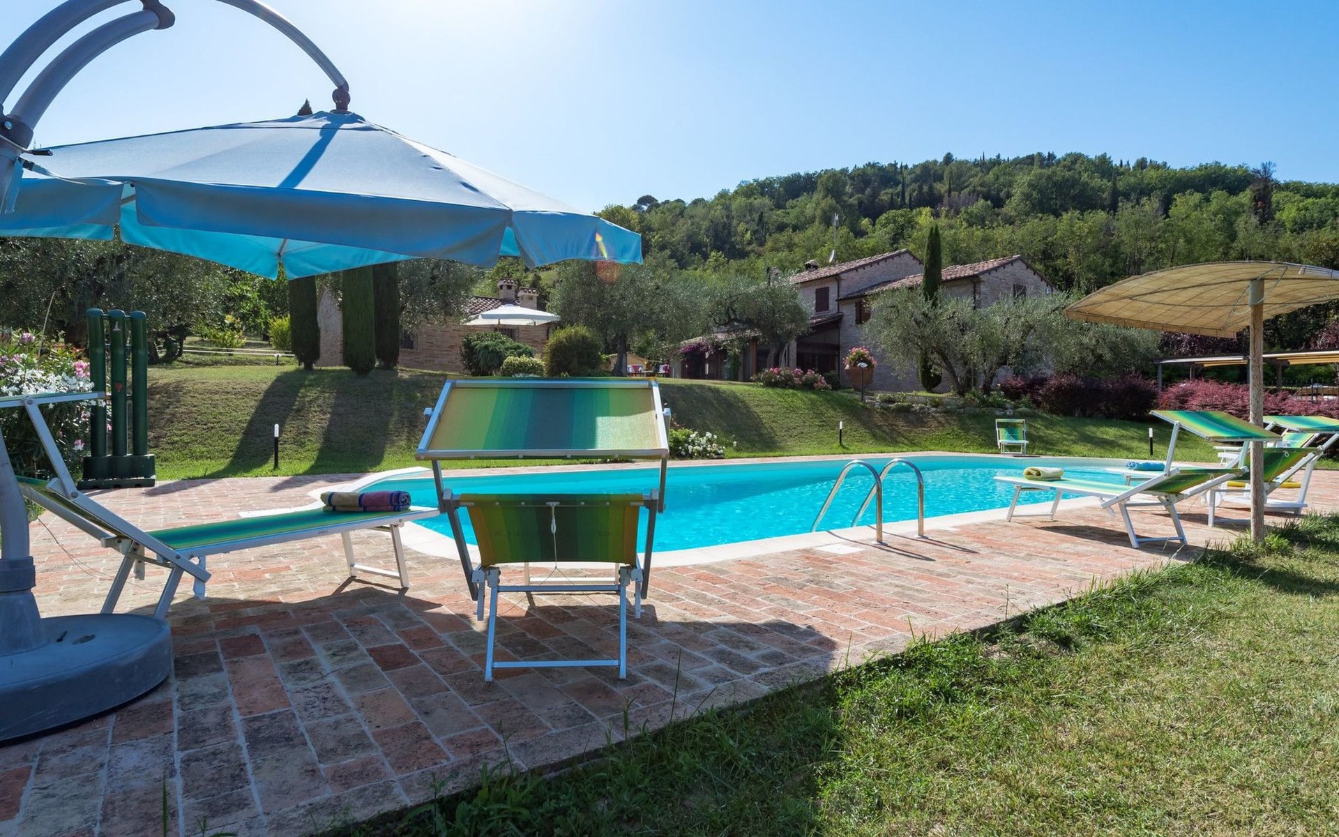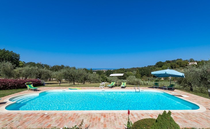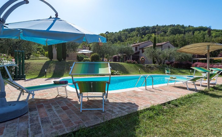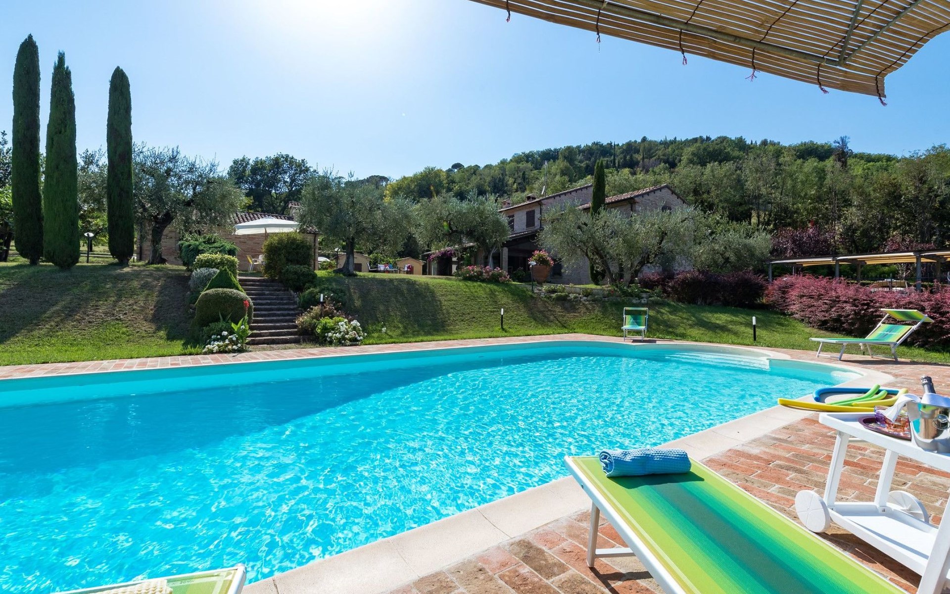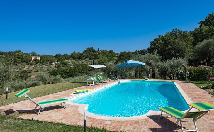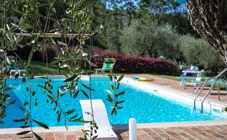 Das Schwimmbad, das von verschiedenen Stellen des Gartens aus zugänglich ist, bietet einen Panoramablick auf die umliegenden Hügel.