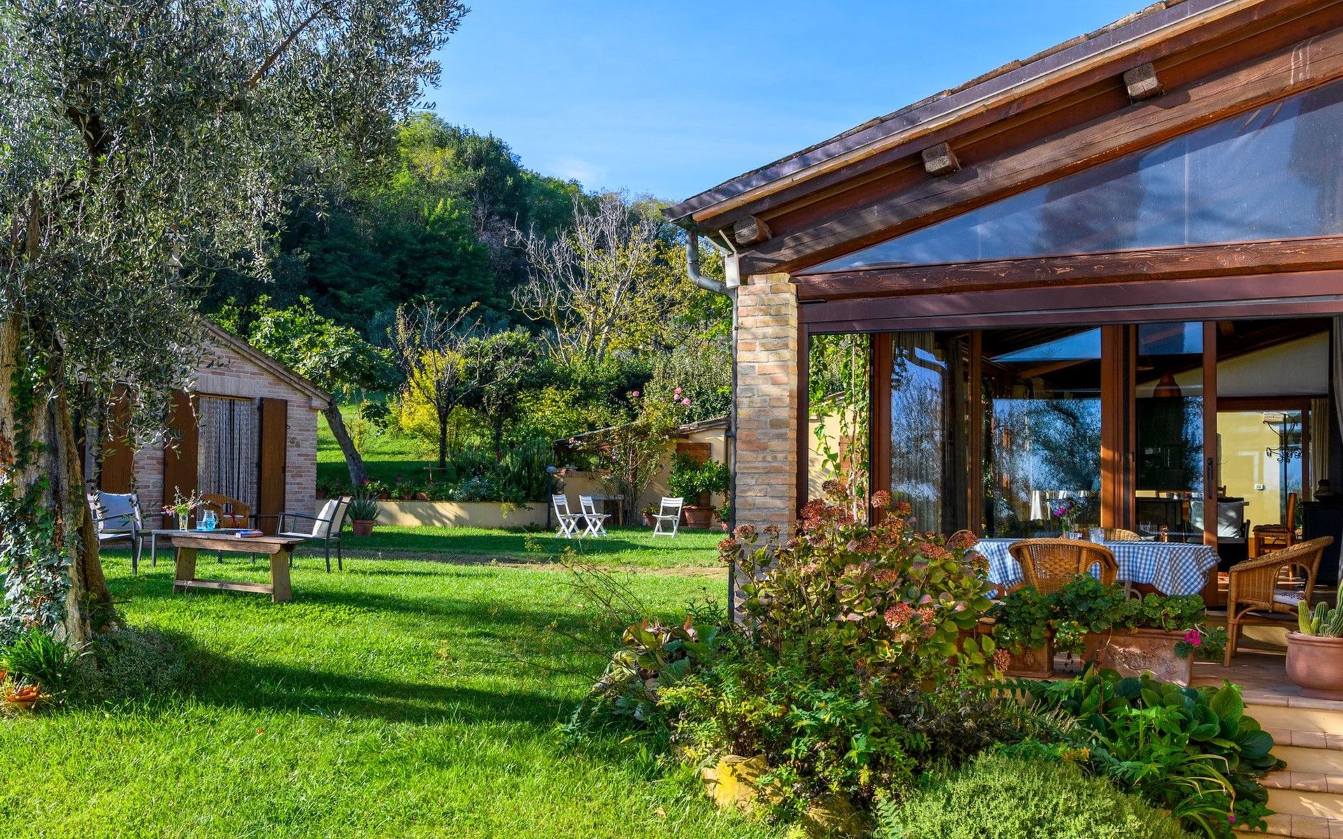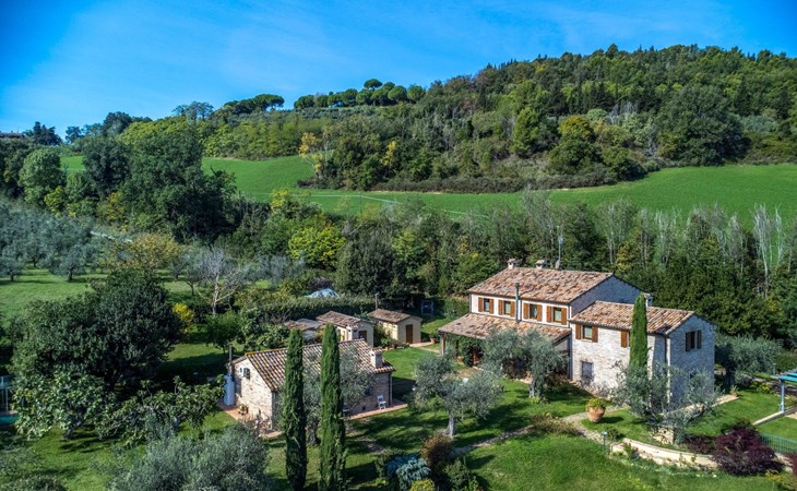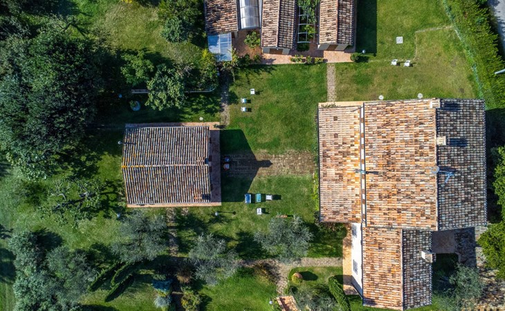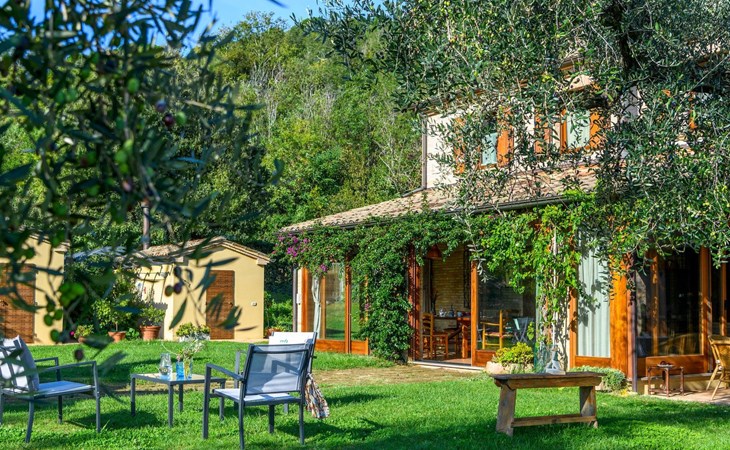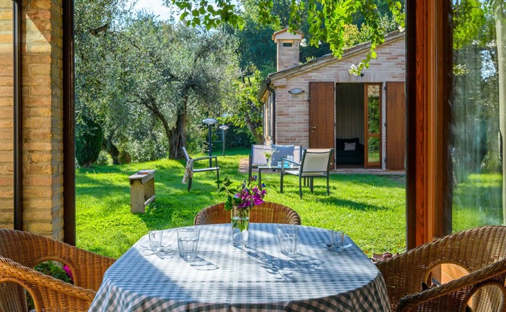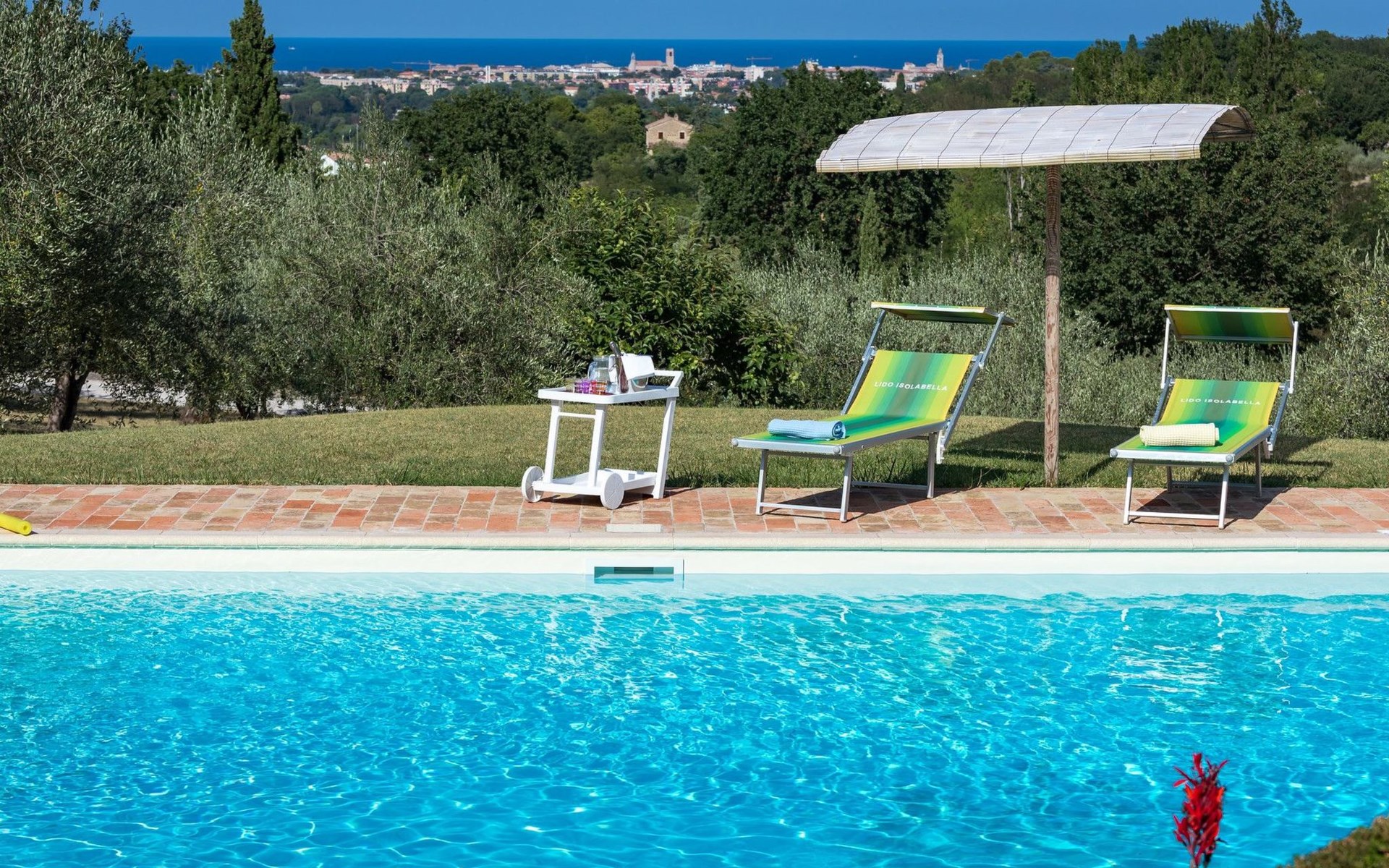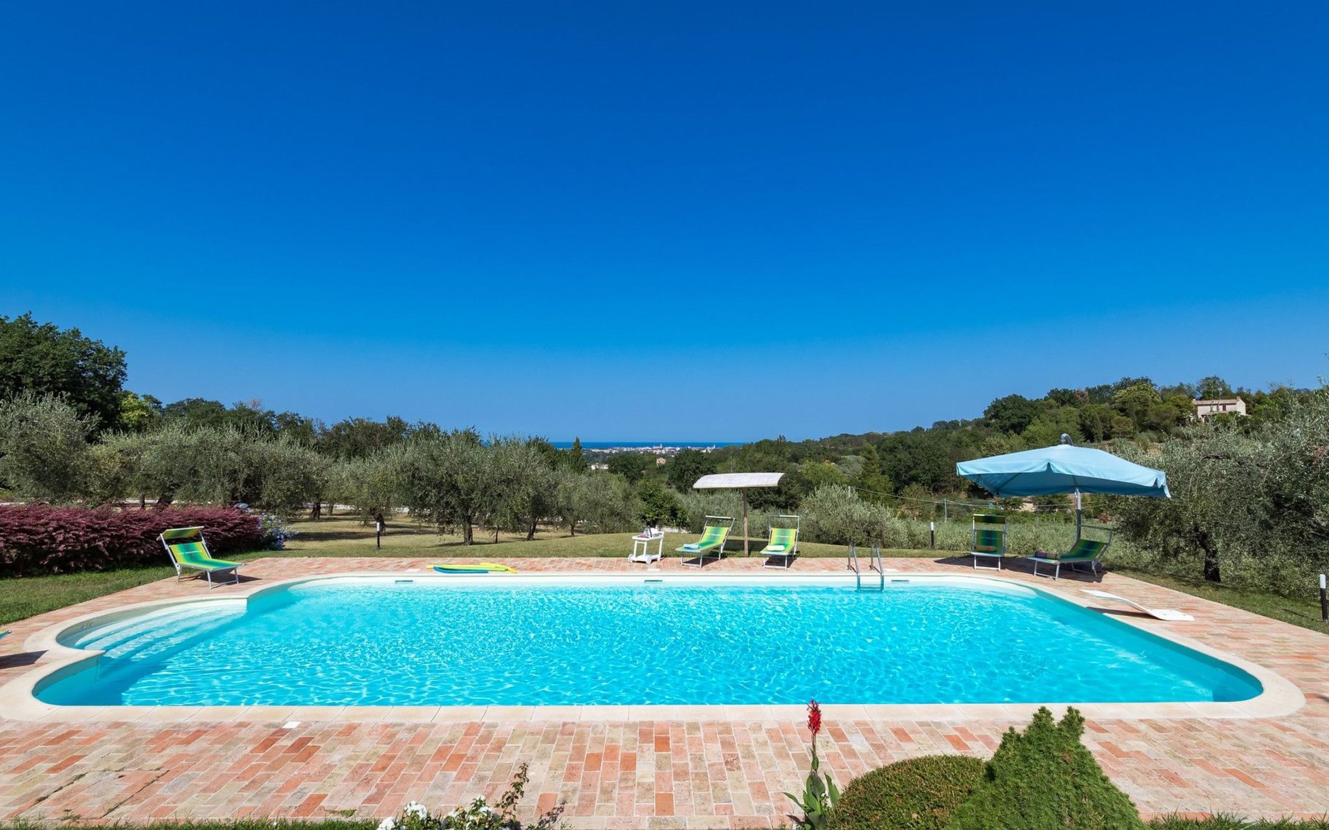Das Schwimmbad, das von verschiedenen Stellen des Gartens aus zugänglich ist, bietet einen Panoramablick auf die umliegenden Hügel.