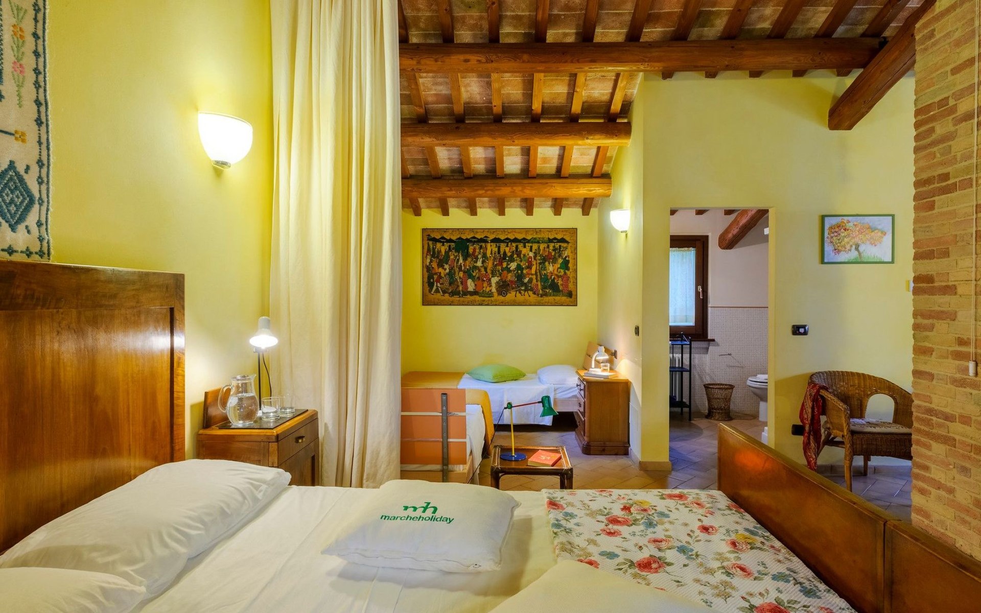 Depandance: Wohnküche, Doppelbett, zwei Einzelbetten und ein Badezimmer mit Dusche. Die Wohnküche und der Schlafbereich sind durch Schiebegardinen getrennt.