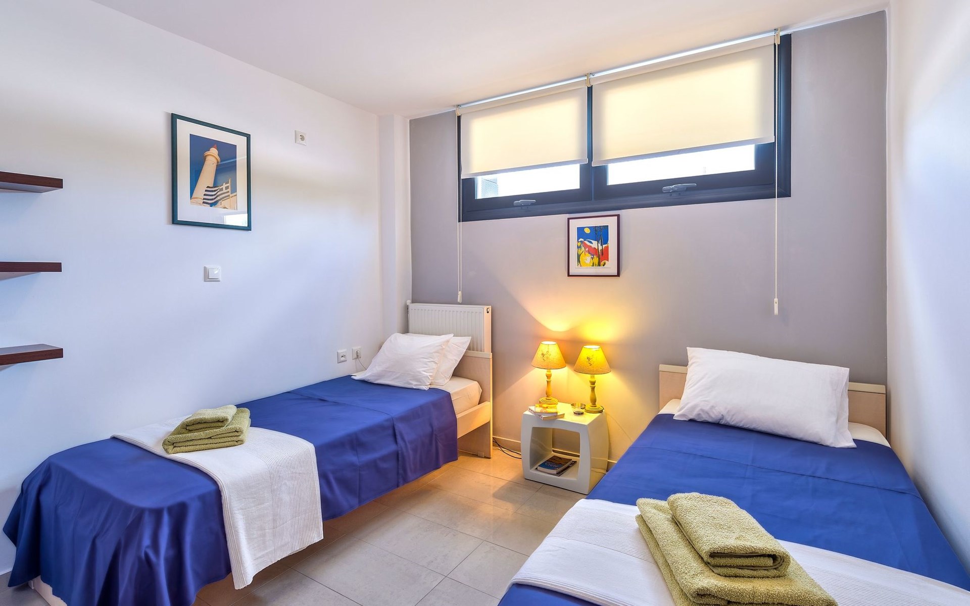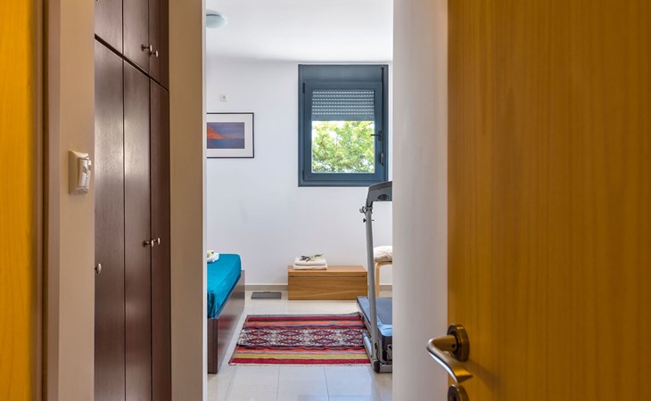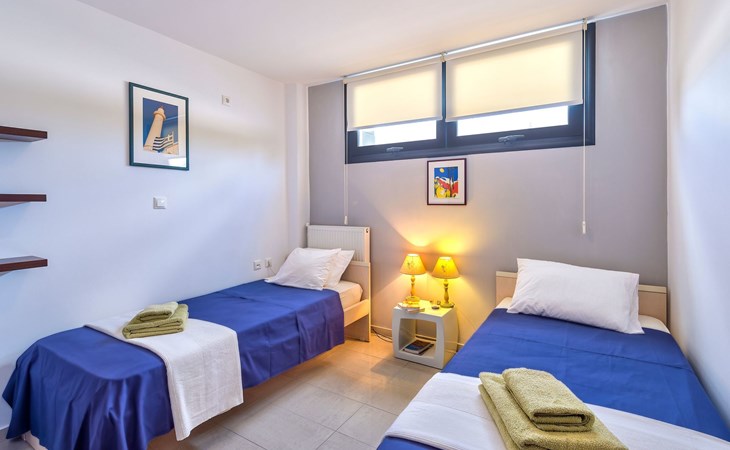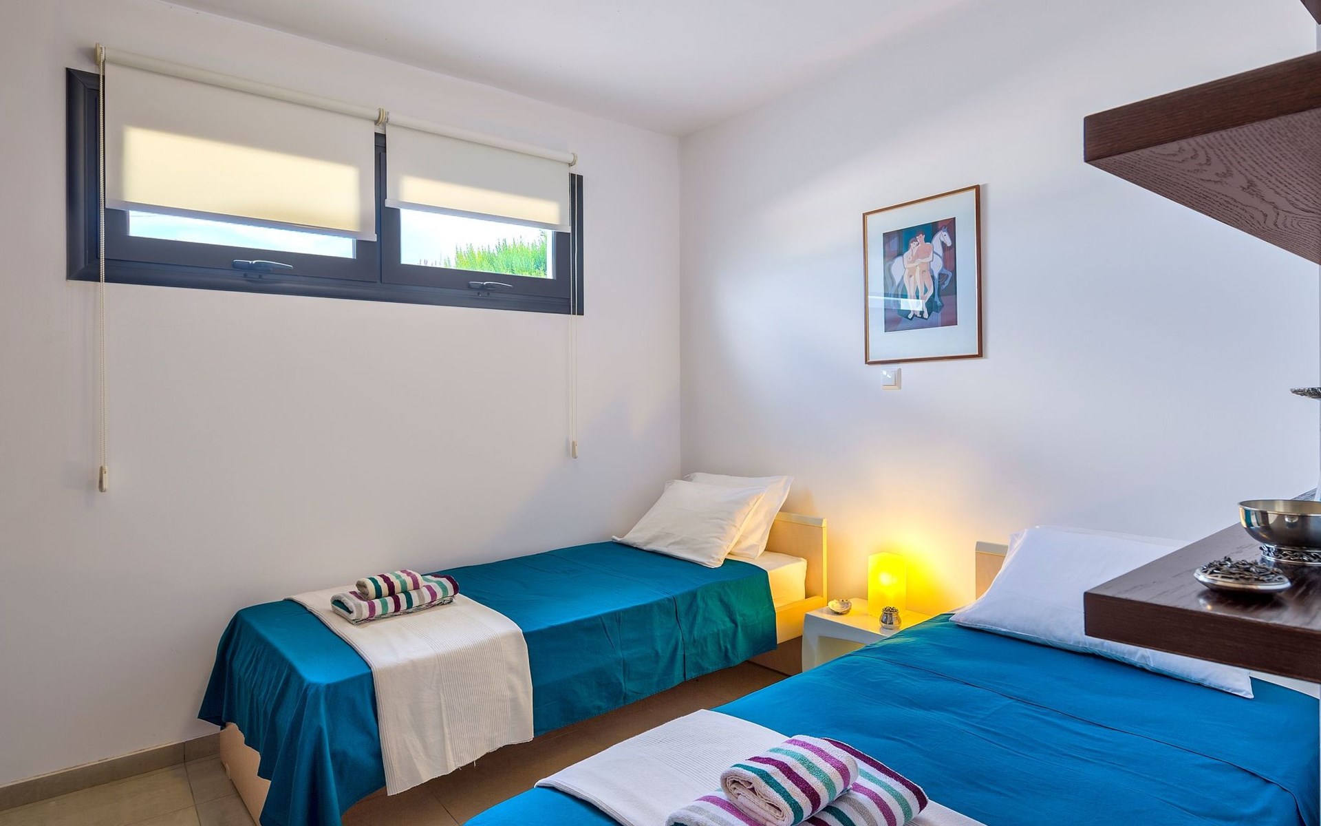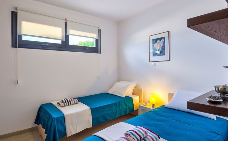 Die Villa ist ein modernes Design-Haus auf drei Etagen. Es ist luftig, lichtdurchflutet und bietet einen atemberaubenden Ausblick. Es gibt zwei große Hauptschlafzimmer mit eigenem Bad/WC. Eines befindet sich im obersten Stockwerk mit einer kleinen Lounge und einem Lesebereich. Das andere befindet sich im unteren Erdgeschoss. Im unteren Erdgeschoss befinden sich zwei weitere Schlafzimmer mit je 2 Einzelbetten. Eines davon hat ebenfalls eine eigene Dusche/WC und das andere hat eine eigene Dusche und Toilette. Es gibt ein 5. Badezimmer/WC im Haus. Wir können Kinder und Familien jeden Alters in der Villa unterbringen. Alle Schlafbereiche sind klimatisiert.