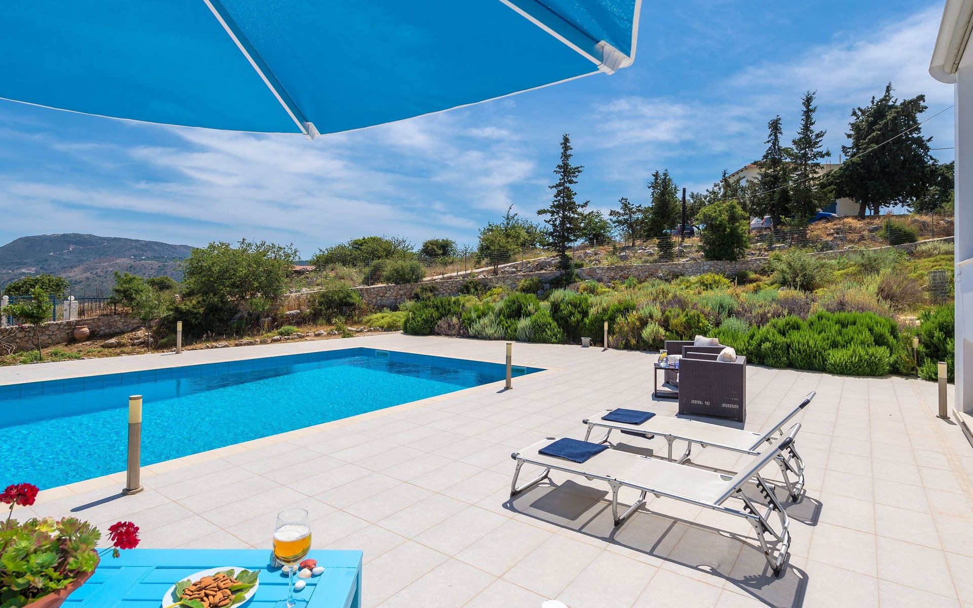 Der Pool ist sehr groß und hat eine Fläche von 45 Quadratmetern mit einem großen gefliesten Bereich mit Blick auf das Meer. Der Poolbereich ist mit einer Dusche, Liegestühlen, Poolstühlen und Möbeln ausgestattet. Sonnenschirme. Poolhandtücher sind ebenfalls vorhanden. Der Rest des Grundstücks wurde größtenteils in seinem natürlichen Zustand belassen und ist voll von natürlich wachsenden Kräutern und Pflanzen.