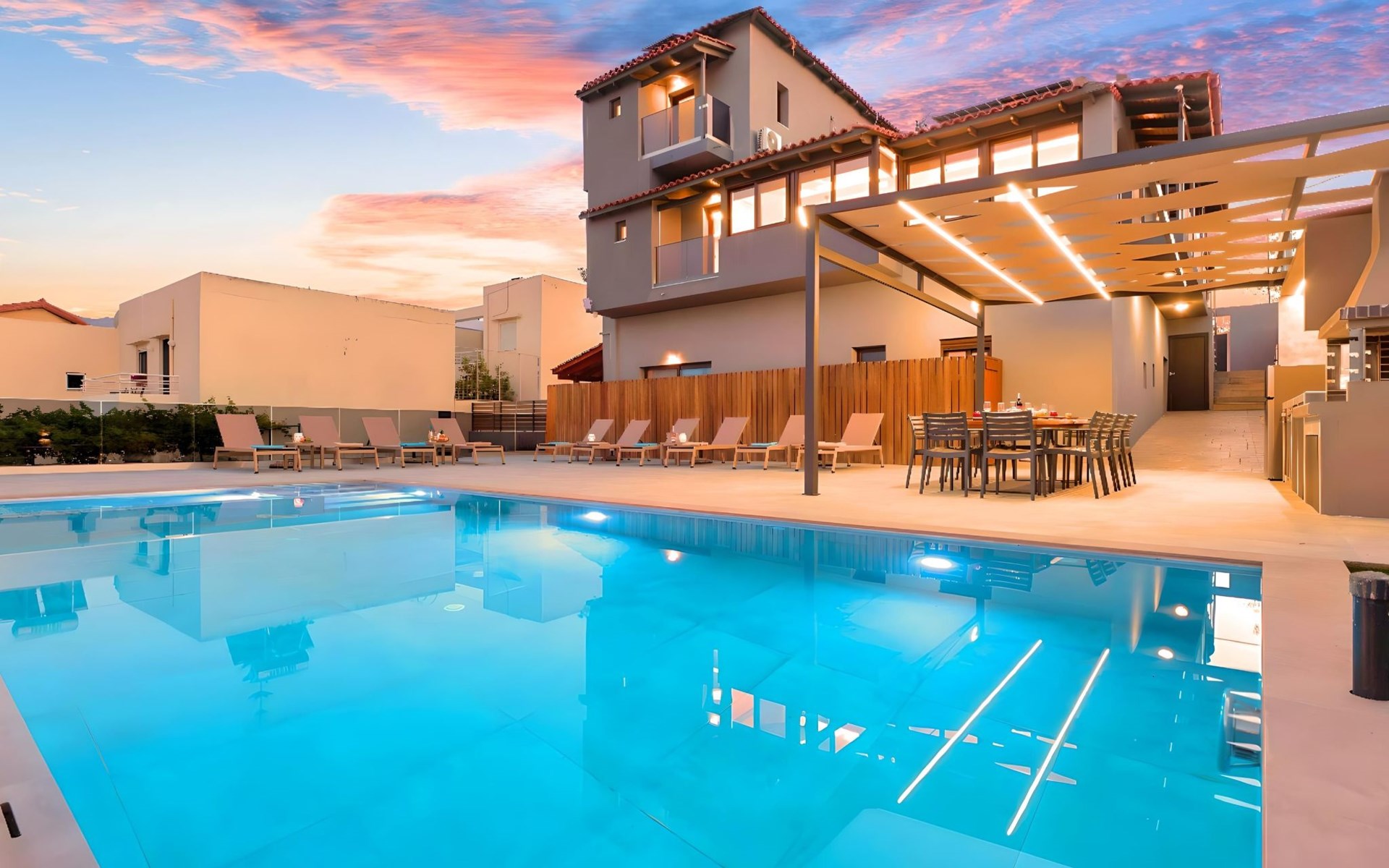 Im Inneren ist die Residenz komplett ausgestattet, um all Ihre Bedürfnisse zu erfüllen. Mit fünf Schlafzimmern und vier Badezimmern ist sichergestellt, dass Privatsphäre und Komfort nie zu kurz kommen. Jedes Zimmer ist mit einer Klimaanlage ausgestattet, so dass Ihr Aufenthalt unabhängig von der Jahreszeit angenehm ist. Für Unterhaltung sorgt ein Smart-TV, perfekt für entspannte Abende nach einem Tag voller Entdeckungen. Eine Waschmaschine zur alleinigen Nutzung sorgt dafür, dass Sie sich wie zu Hause fühlen und Ihren Aufenthalt stressfrei gestalten können. Darüber hinaus ist die Küche mit einer Kaffeemaschine für Kapseln/Pods, einem Geschirrspüler und einem Wasserkocher ausgestattet, so dass Sie Ihre Mahlzeiten problemlos zubereiten können.