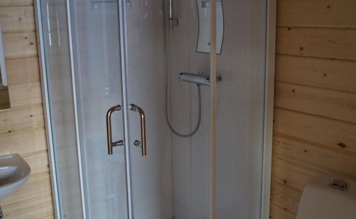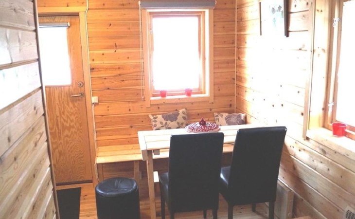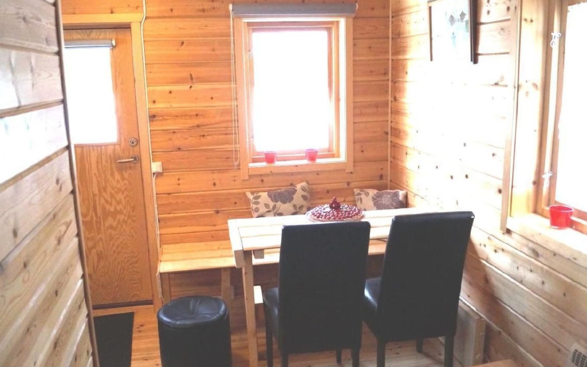 Im Inneren des Hauses finden Sie alle notwendigen Annehmlichkeiten für einen komfortablen Aufenthalt. Das separate Schlafzimmer ist mit zwei Einzelbetten ausgestattet, die nach einem erlebnisreichen Tag in der Natur für eine ruhige Nachtruhe sorgen. Eine praktisch eingerichtete Trinettküche mit Spüle, zwei Kochplatten und Kühlschrank ermöglicht die Selbstverpflegung während Ihres Aufenthalts. Auch eine Dusche und WC sind vorhanden, um Ihren Komfort zu gewährleisten.
