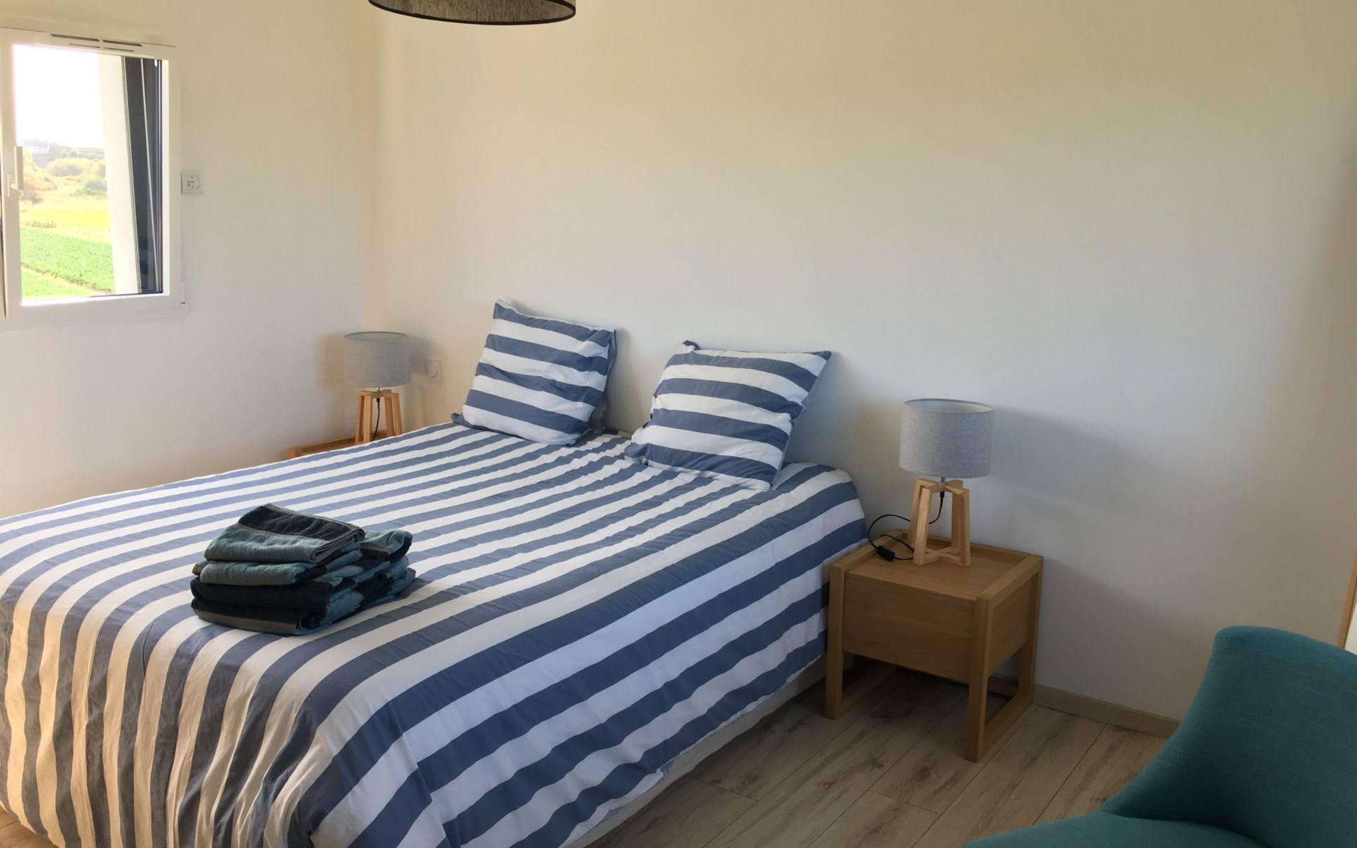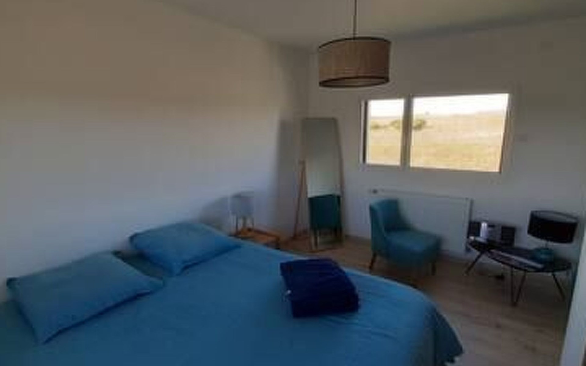 Ein Zimmer mit großem Bett und Blick auf die Felder