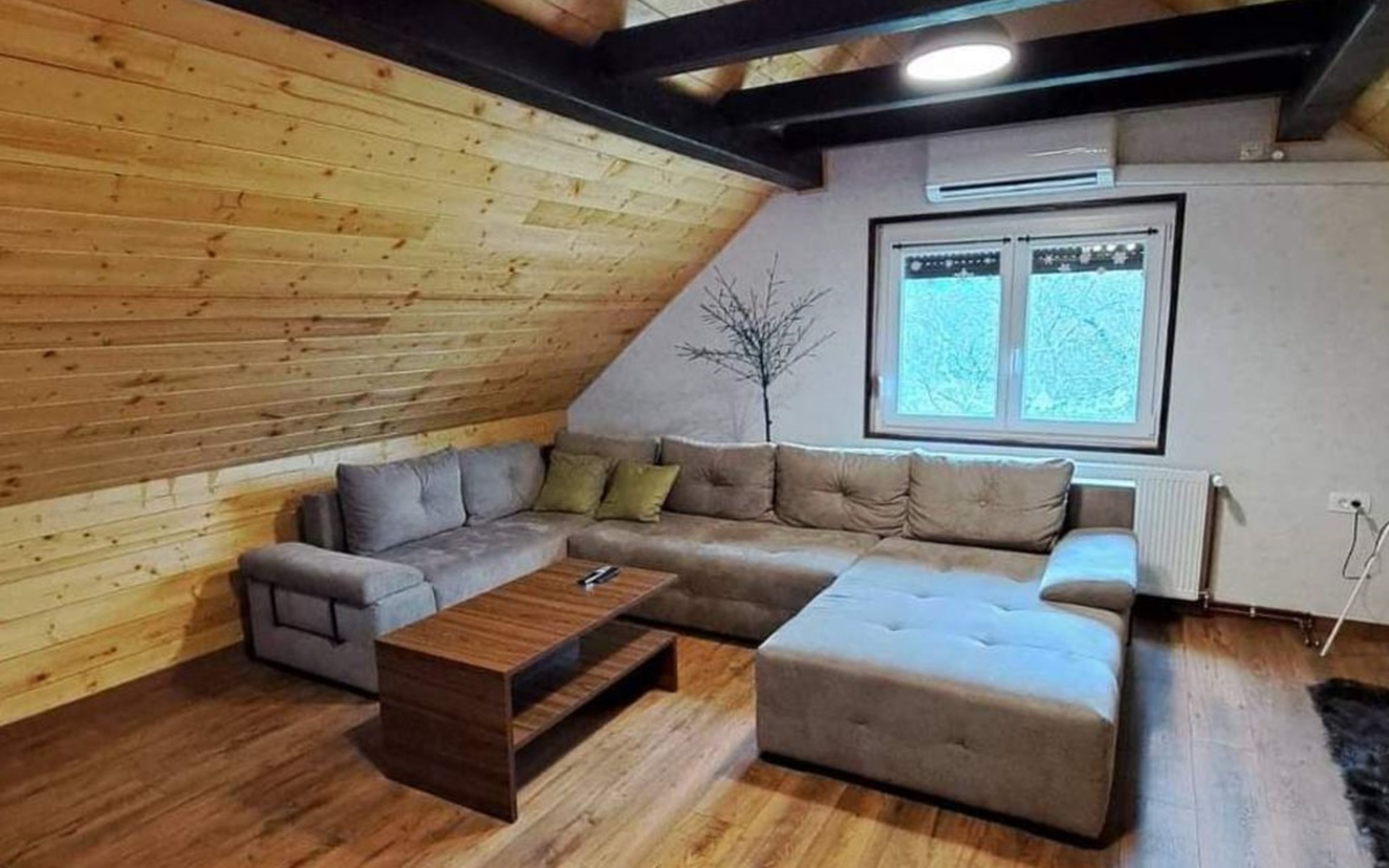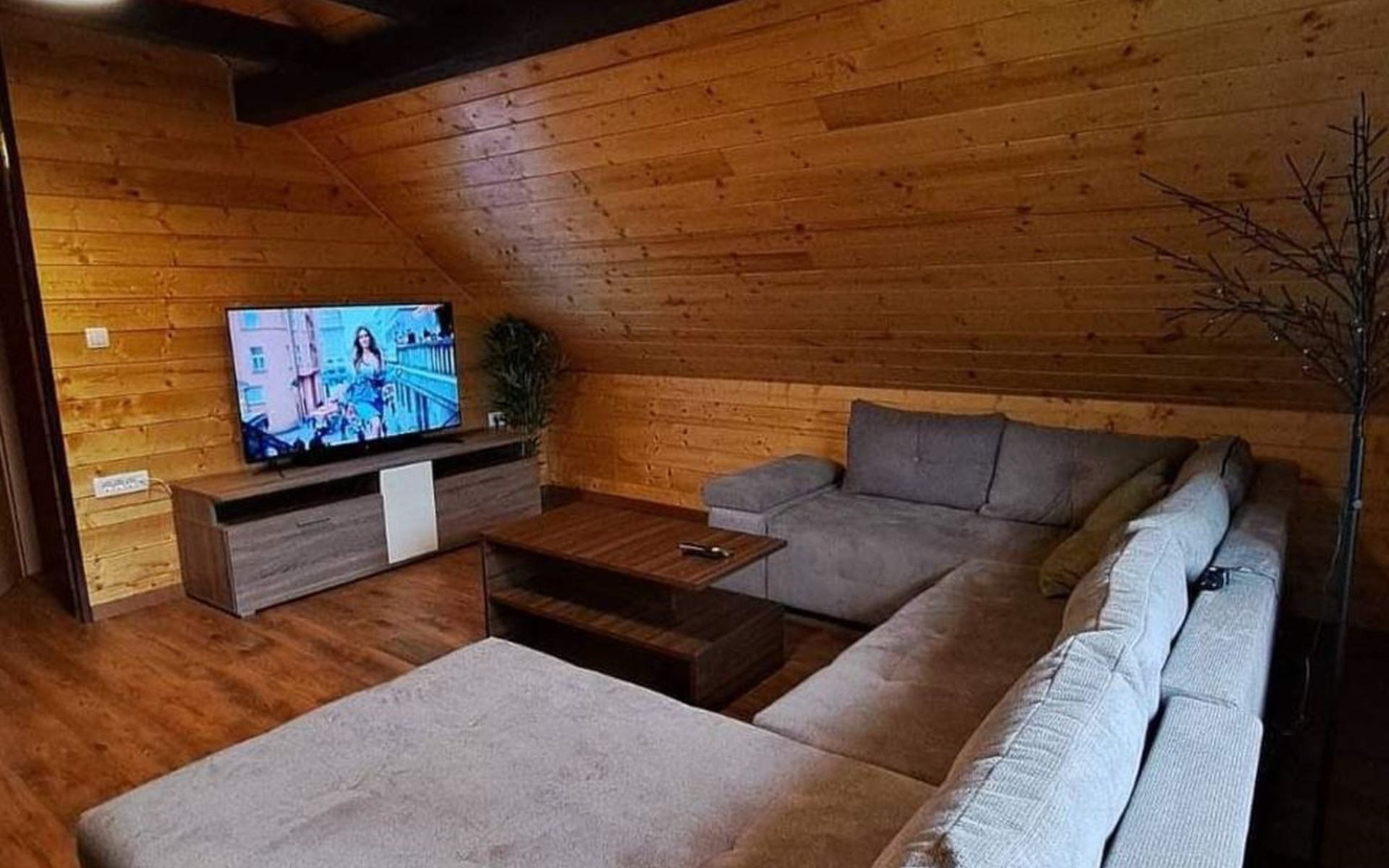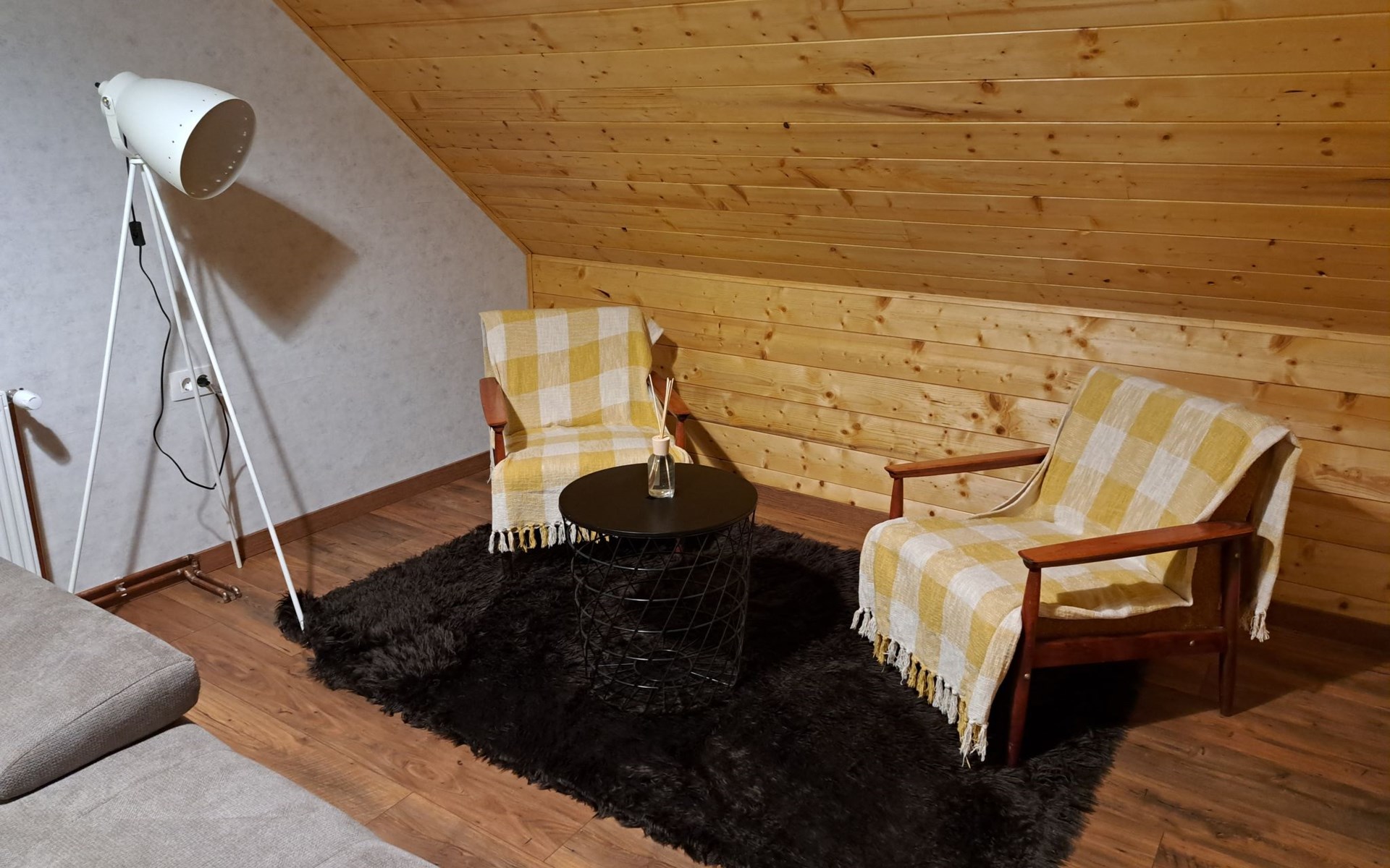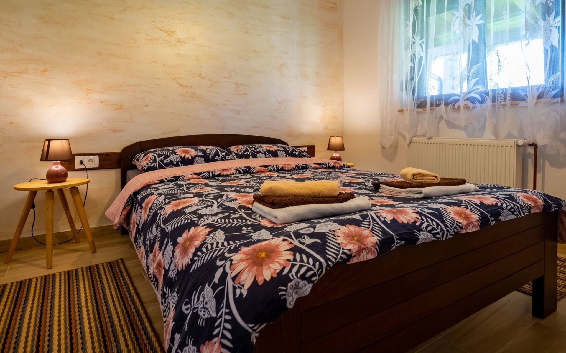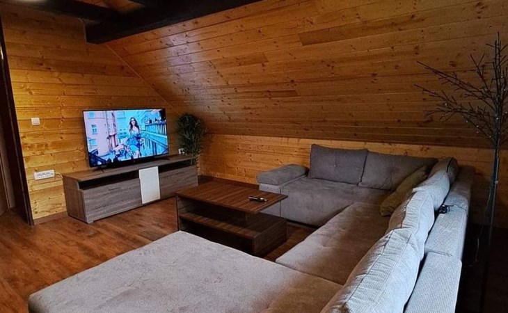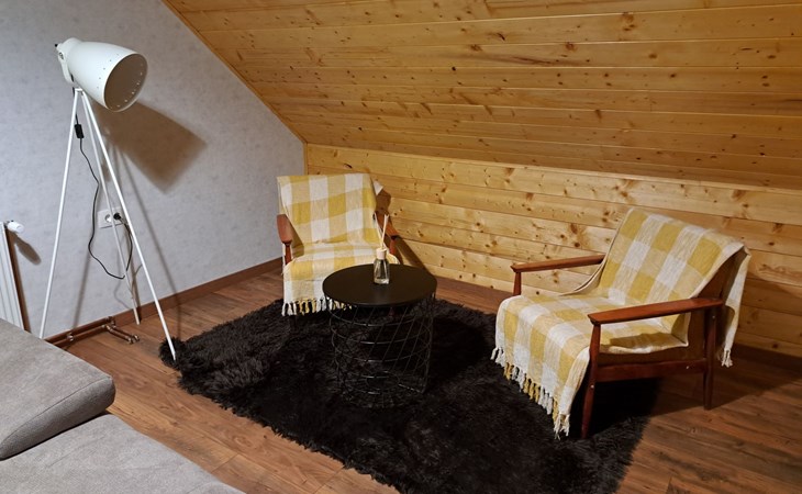 Im 1. Stock gibt es ein großes Wohnzimmer (OLED TV 55'' mit Netflix und Soundbar), eine kleine Ecke zum Lesen von Büchern, zwei Schlafzimmer mit Doppelbetten, ein Badezimmer mit Badewanne und ein WC.