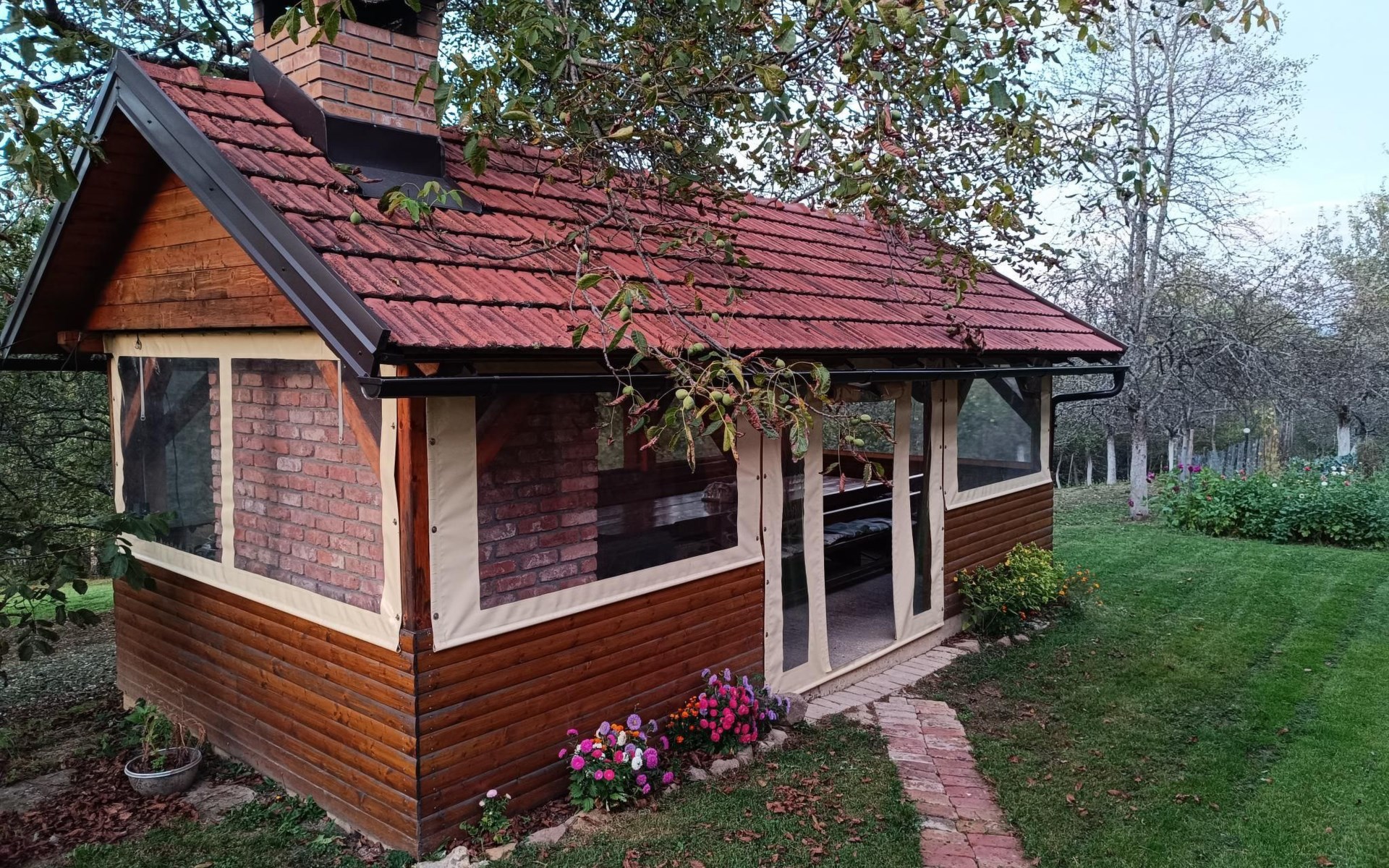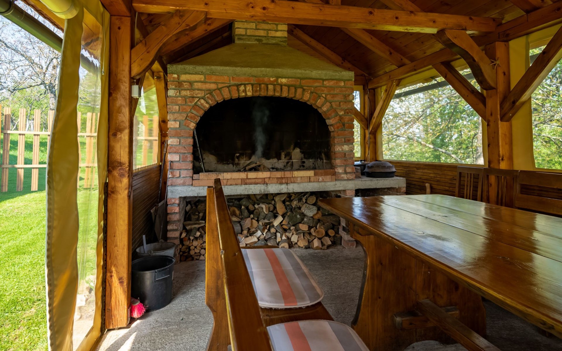 Neben dem Haus gibt es eine Gartenlaube mit einer großen Feuerstelle und einem Picknickplatz. Es gibt Grill, Ofen, Spieß, genügend Brennholz und Grillzubehör.