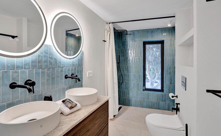 - Badezimmer mit Doppelwaschbecken, Dusche und Toilette