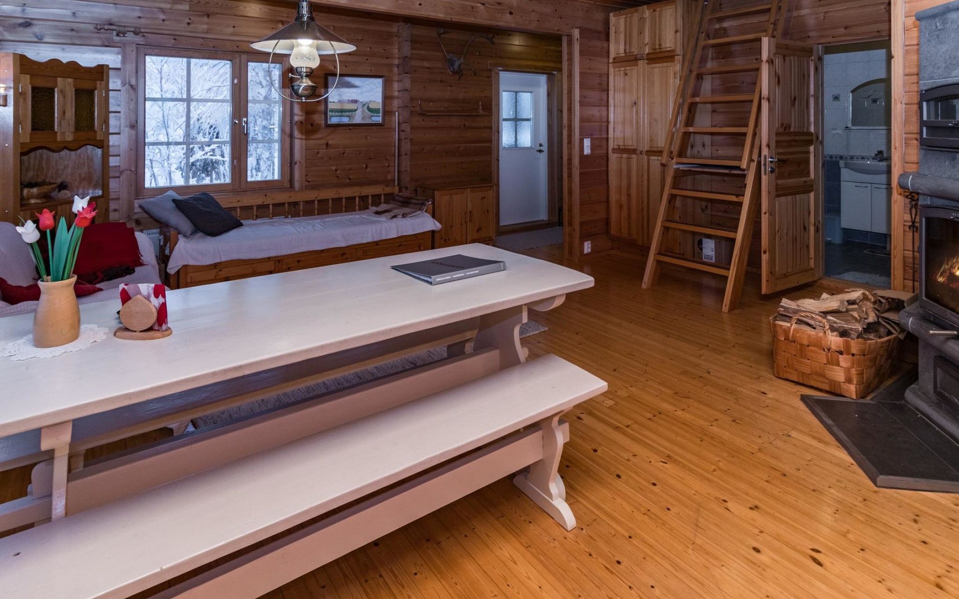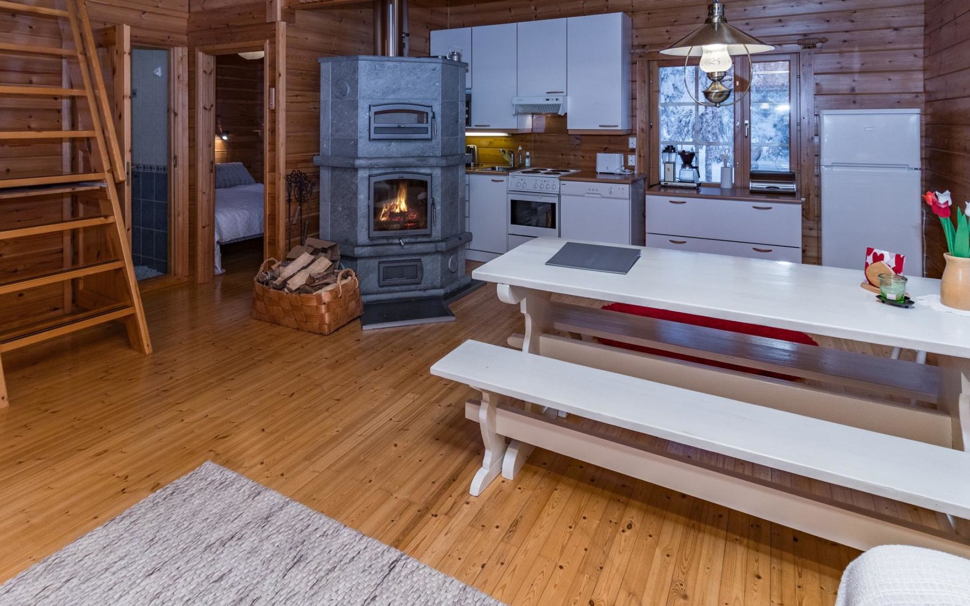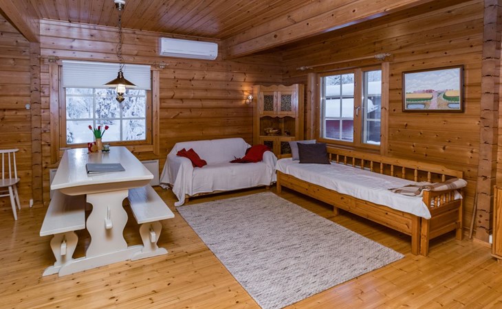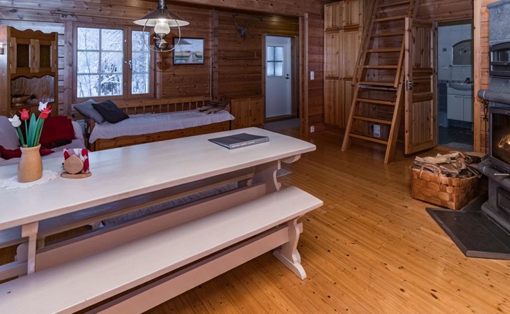 The living room/kitchen provide everything needed for cooking and enjoying meals. The surroundings of the cabin offer opportunities for outdoor activities and relaxation amid nature.