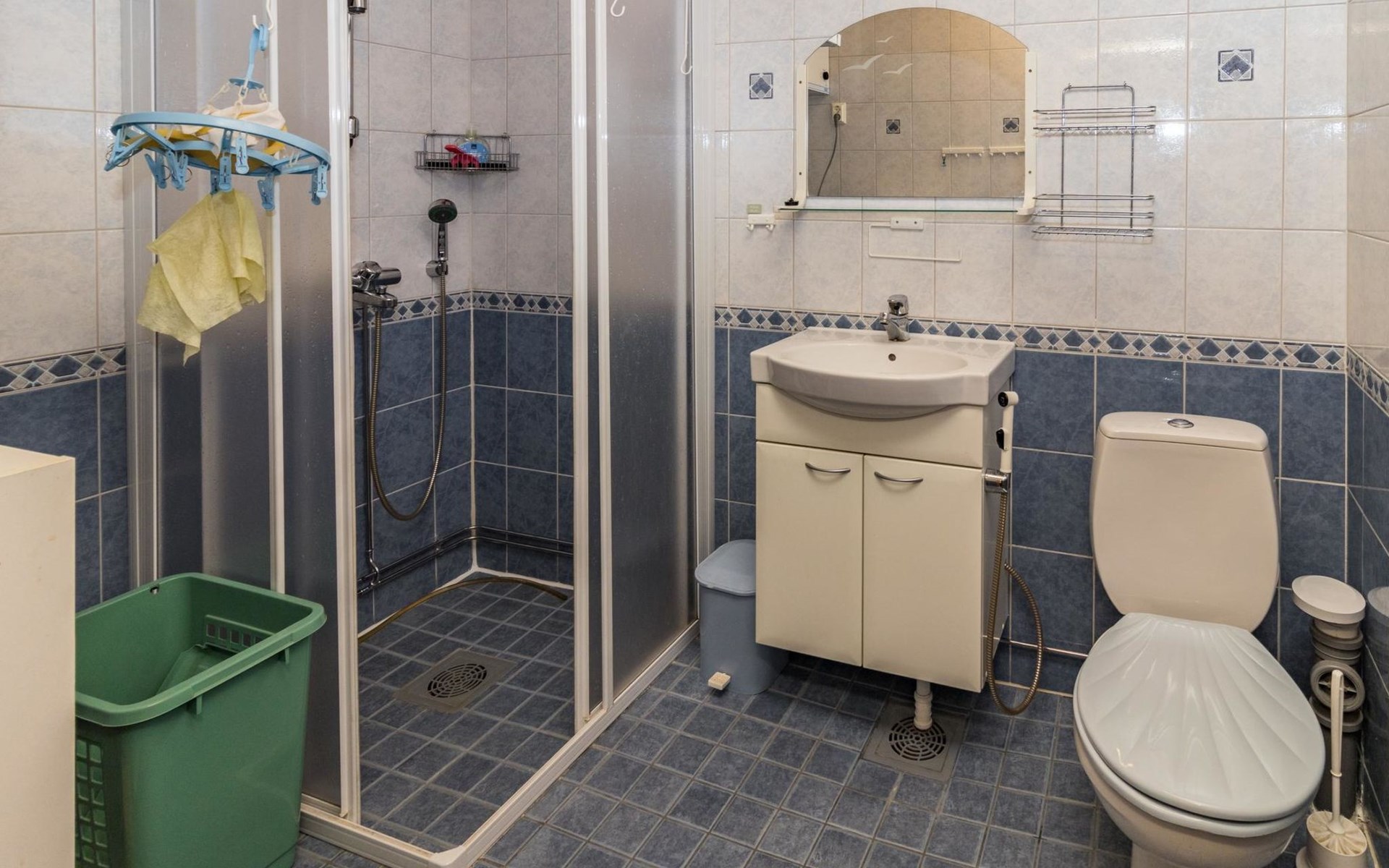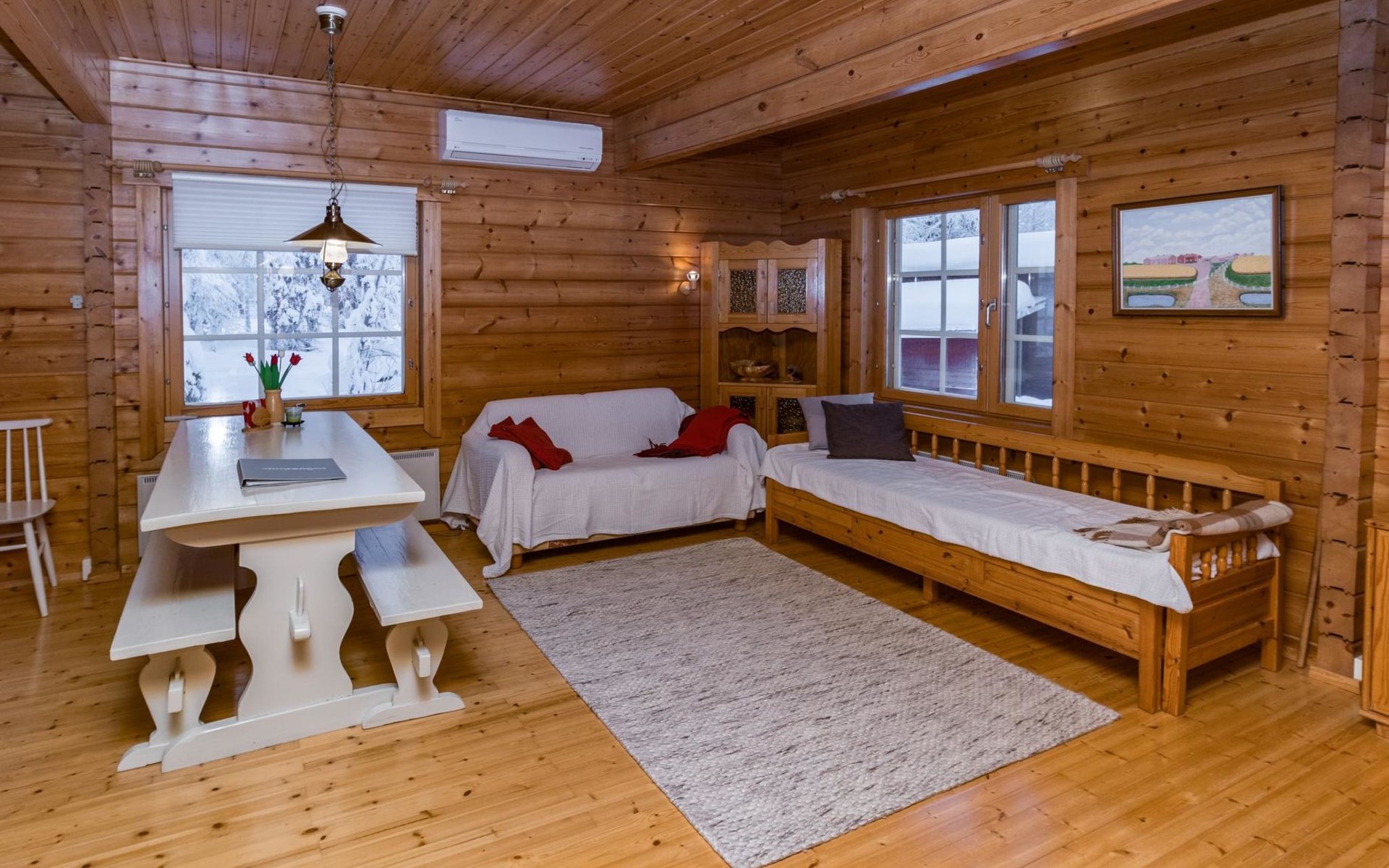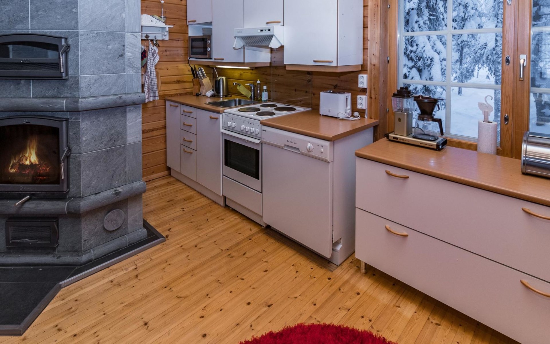 The living room/kitchen provide everything needed for cooking and enjoying meals. The surroundings of the cabin offer opportunities for outdoor activities and relaxation amid nature.