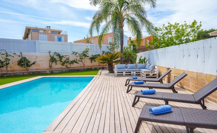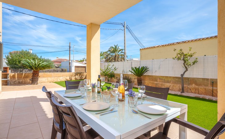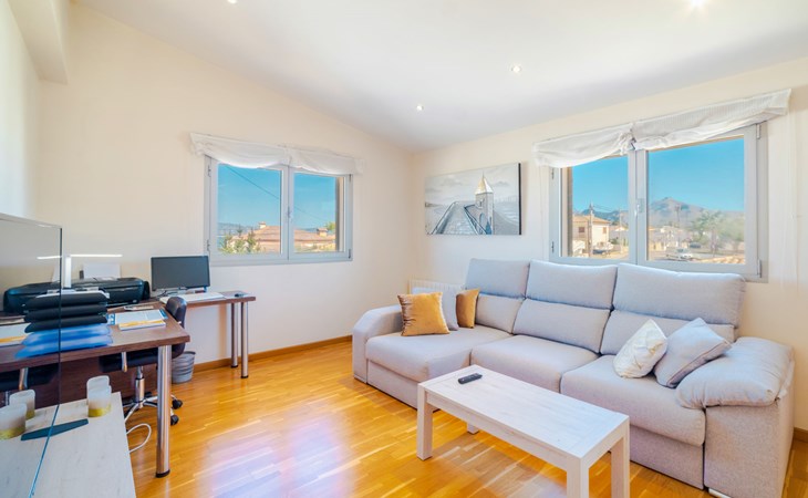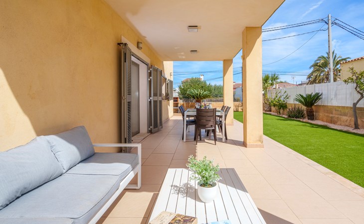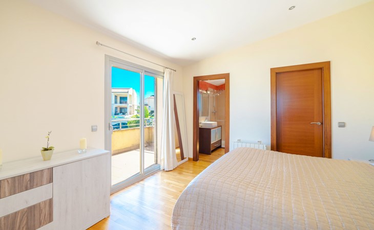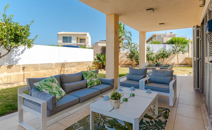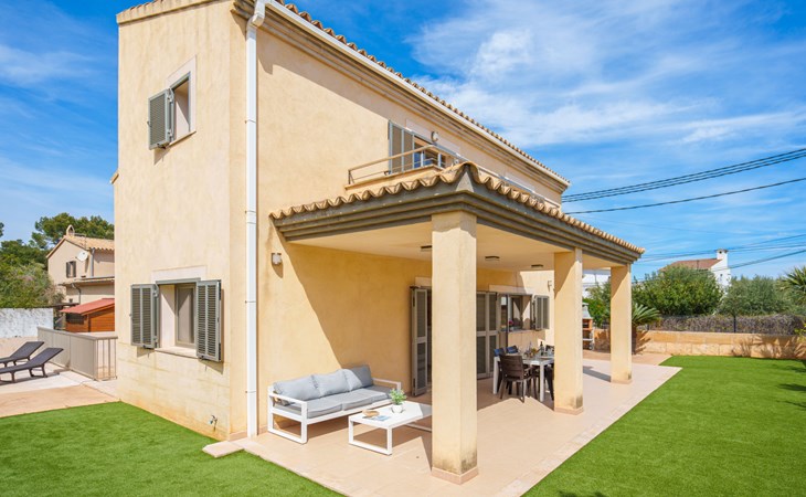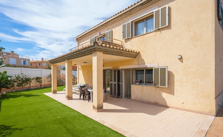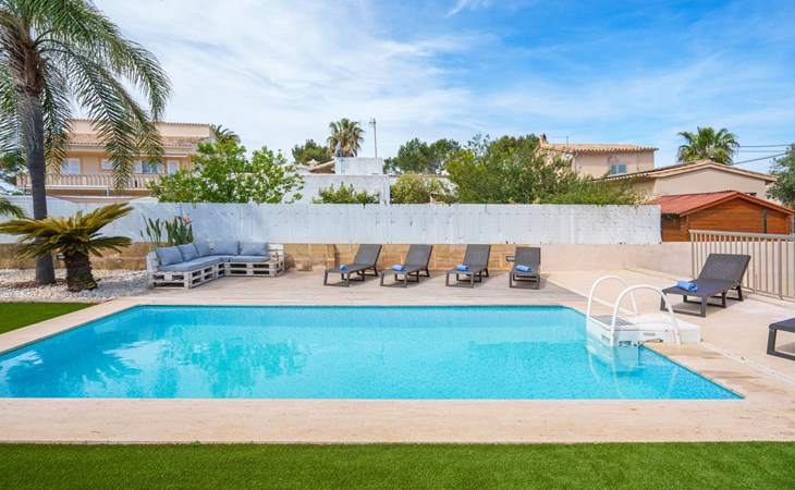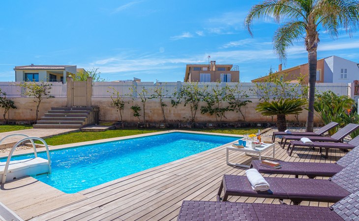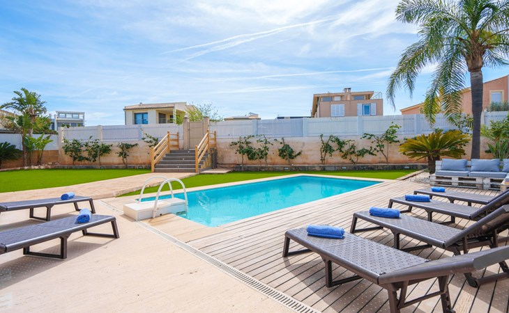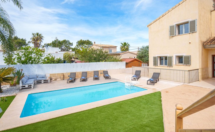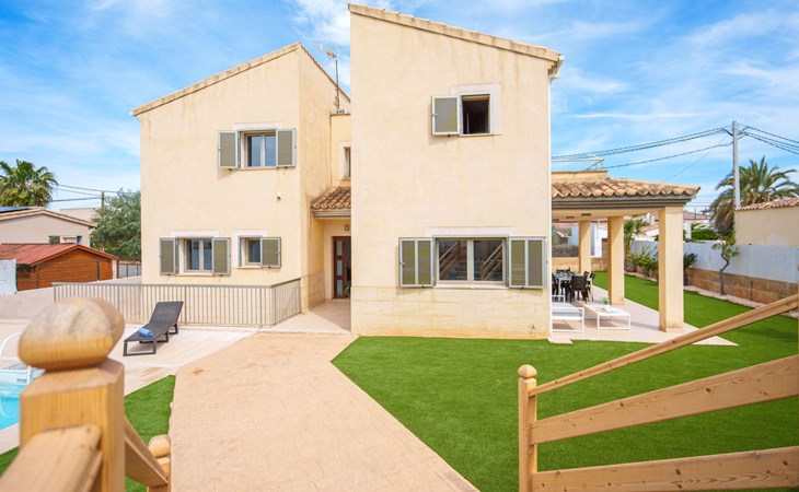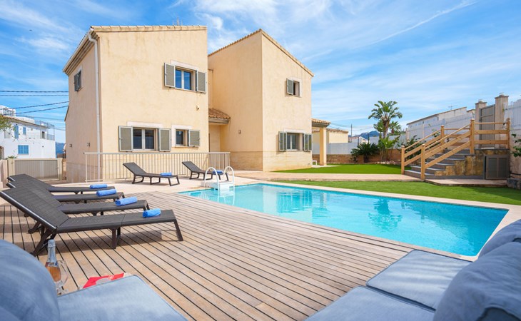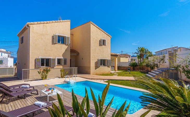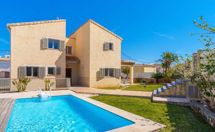 Barcarés 1 km von Alcúdia: Sehr grosse, sehr moderne, freistehende Villa "Son Jil", auf 2 Stockwerken, Baujahr 2005. Ruhige, sonnige Lage im Villenviertel, 2 km vom Waldrand, 60 m vom Meer, Strasse zu überqueren. Zur Alleinbenutzung: grosser, gepflegter Garten mit Rasen und Pflanzen, Schwimmbad eckig (8 x 4 m, 150 - 150 cm tief, saisonale Verfügbarkeit: 01.Jan. - 31.Dez.) mit Salzelektrolyse-Reinigungssystem. Aussendusche, Sitzplatz, Laube, Pergola, Gartenmöbel, Grill. Im Hause: Internetzugang, Wireless LAN, Zentralheizung, Klimaanlage, Waschmaschine. Öffentliches Parkhaus, öffentliche Parkplätze auf der Strasse. Einkaufsgeschäft 1 km, Supermarkt 1.2 km, Einkaufszentrum 45 km, Restaurant 160 m, Bar, Fußgängerzone 50 m, Zentrum zu Fuss in 15 Minuten erreichbar, Bushaltestelle 1.5 km, Fähre 3 km, Sandstrand "Platja Es Morer Vermell" 550 m, Felsstrand "Platja Es Barcarés" 60 m. Sporthafen 250 m, Jacht-Hafen 3 km, Golfplatz (18 Loch) 6 km, Tennis 2.5 km, Reitstall 2.5 km, Sportzentrum 2.5 km, Wanderwege ab Haus 1 km, Radweg 700 m, Kinderspielplatz 500 m. Nahe gelegene Sehenswürdigkeiten: Ermita de la Victoria, Barcarés, Manresa, Sa Marina, Es Malpas. Ciutat Romana de Pollentia, Alcudia. Port d'Alcúdia, Port de Pollença - Pollença, North Beaches. Wandergebiete: Sa Talaia, Es Puig de Sant Martí, Serra Tramuntana Pollença. Bitte beachten: geeignet für Familien, geeignet für Senioren. Objekt geeignet für 8 Erwachsene Jugendgruppen nur auf Anfrage. Flugplatz 60 km vom Haus.