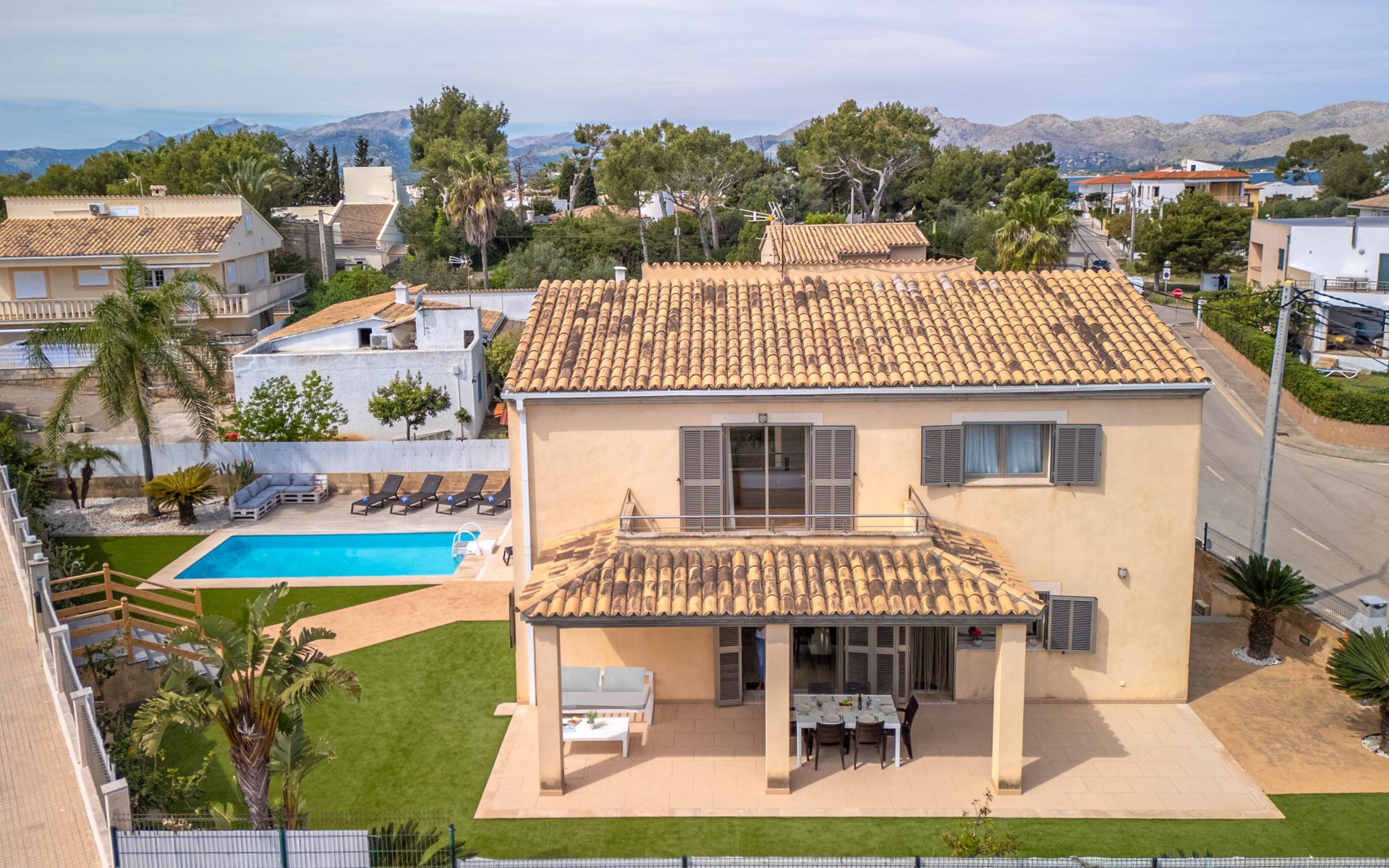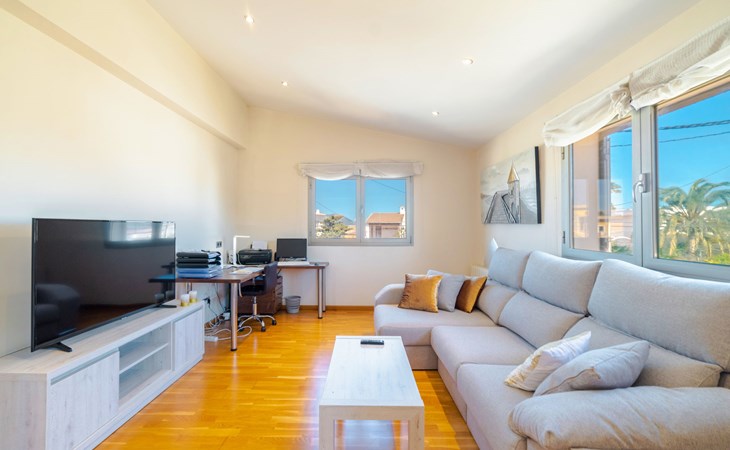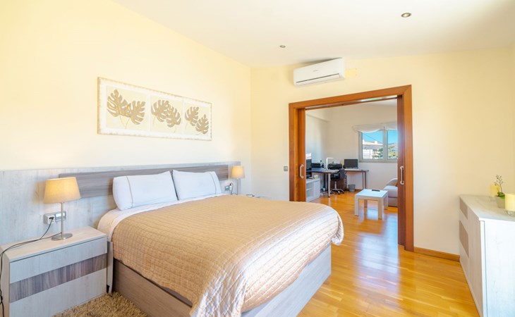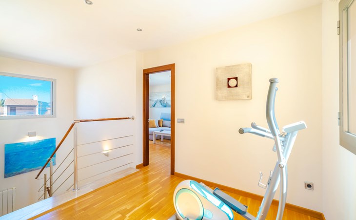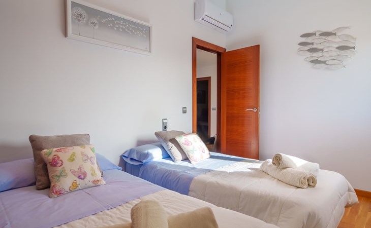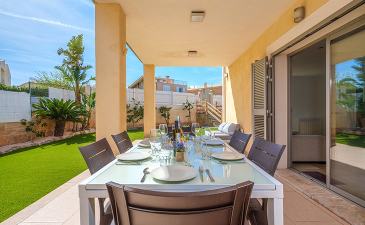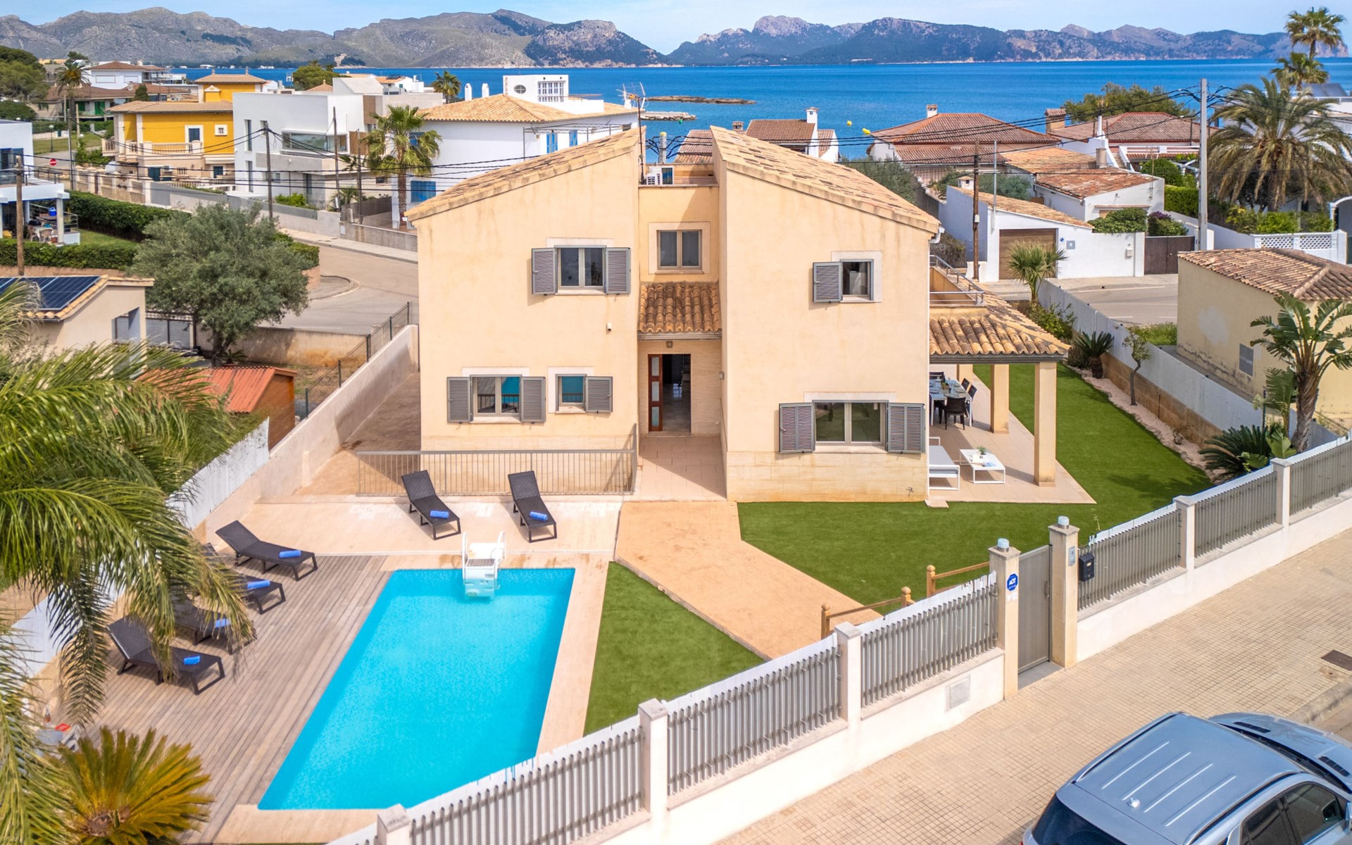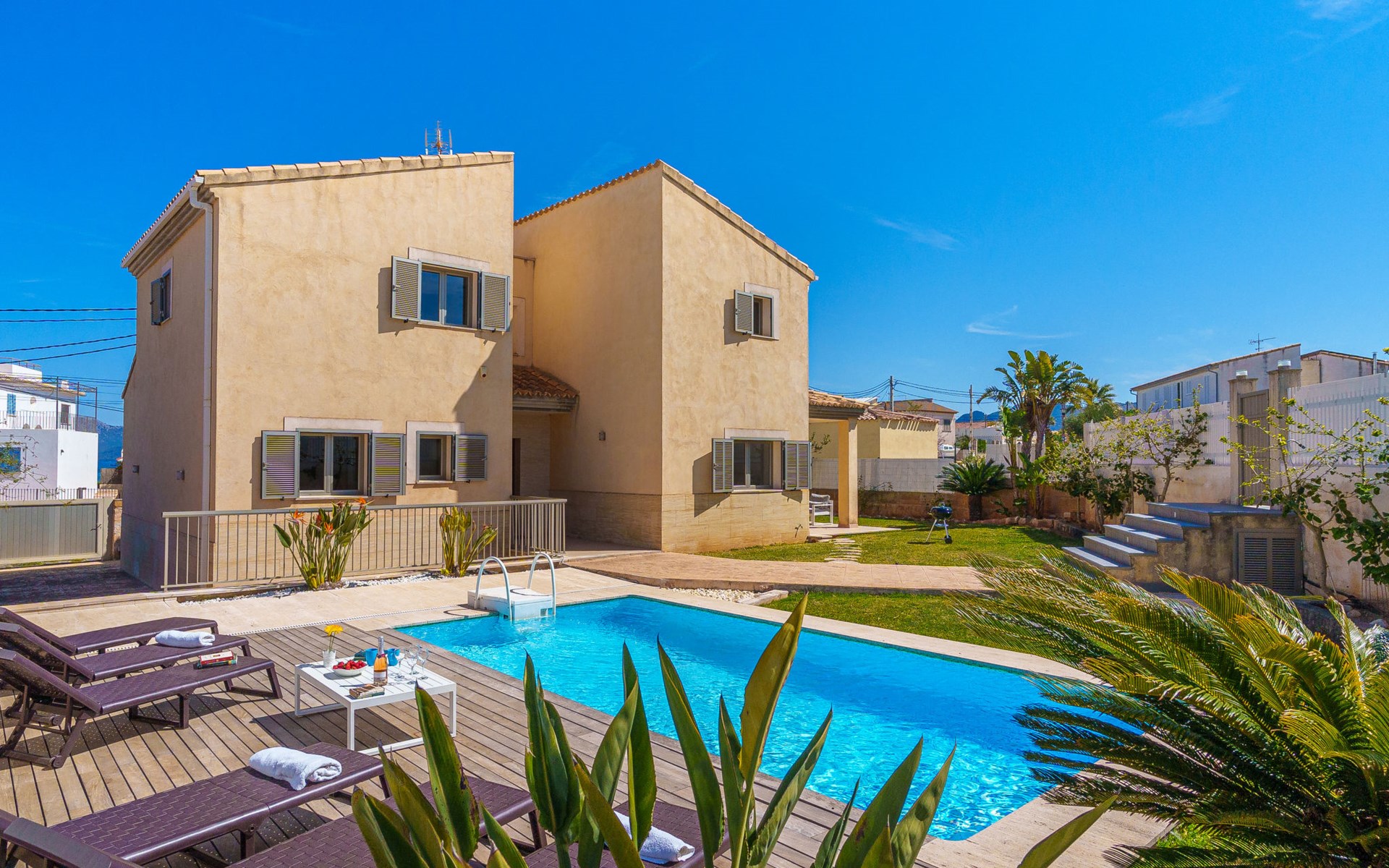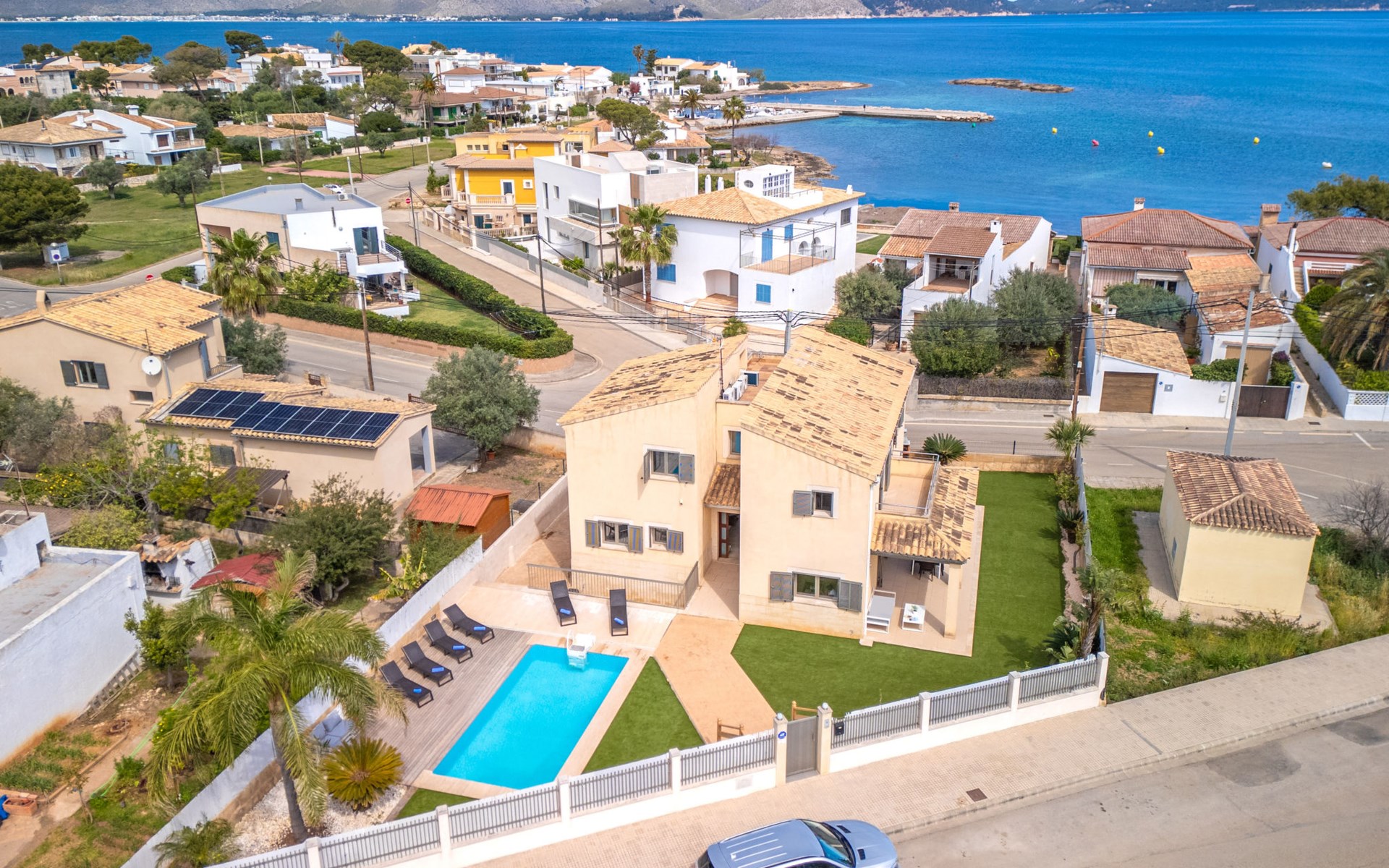 Barcarés 1 km von Alcúdia: Sehr grosse, sehr moderne, freistehende Villa "Son Jil", auf 2 Stockwerken, Baujahr 2005. Ruhige, sonnige Lage im Villenviertel, 2 km vom Waldrand, 60 m vom Meer, Strasse zu überqueren. Zur Alleinbenutzung: grosser, gepflegter Garten mit Rasen und Pflanzen, Schwimmbad eckig (8 x 4 m, 150 - 150 cm tief, saisonale Verfügbarkeit: 01.Jan. - 31.Dez.) mit Salzelektrolyse-Reinigungssystem. Aussendusche, Sitzplatz, Laube, Pergola, Gartenmöbel, Grill. Im Hause: Internetzugang, Wireless LAN, Zentralheizung, Klimaanlage, Waschmaschine. Öffentliches Parkhaus, öffentliche Parkplätze auf der Strasse. Einkaufsgeschäft 1 km, Supermarkt 1.2 km, Einkaufszentrum 45 km, Restaurant 160 m, Bar, Fußgängerzone 50 m, Zentrum zu Fuss in 15 Minuten erreichbar, Bushaltestelle 1.5 km, Fähre 3 km, Sandstrand "Platja Es Morer Vermell" 550 m, Felsstrand "Platja Es Barcarés" 60 m. Sporthafen 250 m, Jacht-Hafen 3 km, Golfplatz (18 Loch) 6 km, Tennis 2.5 km, Reitstall 2.5 km, Sportzentrum 2.5 km, Wanderwege ab Haus 1 km, Radweg 700 m, Kinderspielplatz 500 m. Nahe gelegene Sehenswürdigkeiten: Ermita de la Victoria, Barcarés, Manresa, Sa Marina, Es Malpas. Ciutat Romana de Pollentia, Alcudia. Port d'Alcúdia, Port de Pollença - Pollença, North Beaches. Wandergebiete: Sa Talaia, Es Puig de Sant Martí, Serra Tramuntana Pollença. Bitte beachten: geeignet für Familien, geeignet für Senioren. Objekt geeignet für 8 Erwachsene Jugendgruppen nur auf Anfrage. Flugplatz 60 km vom Haus.