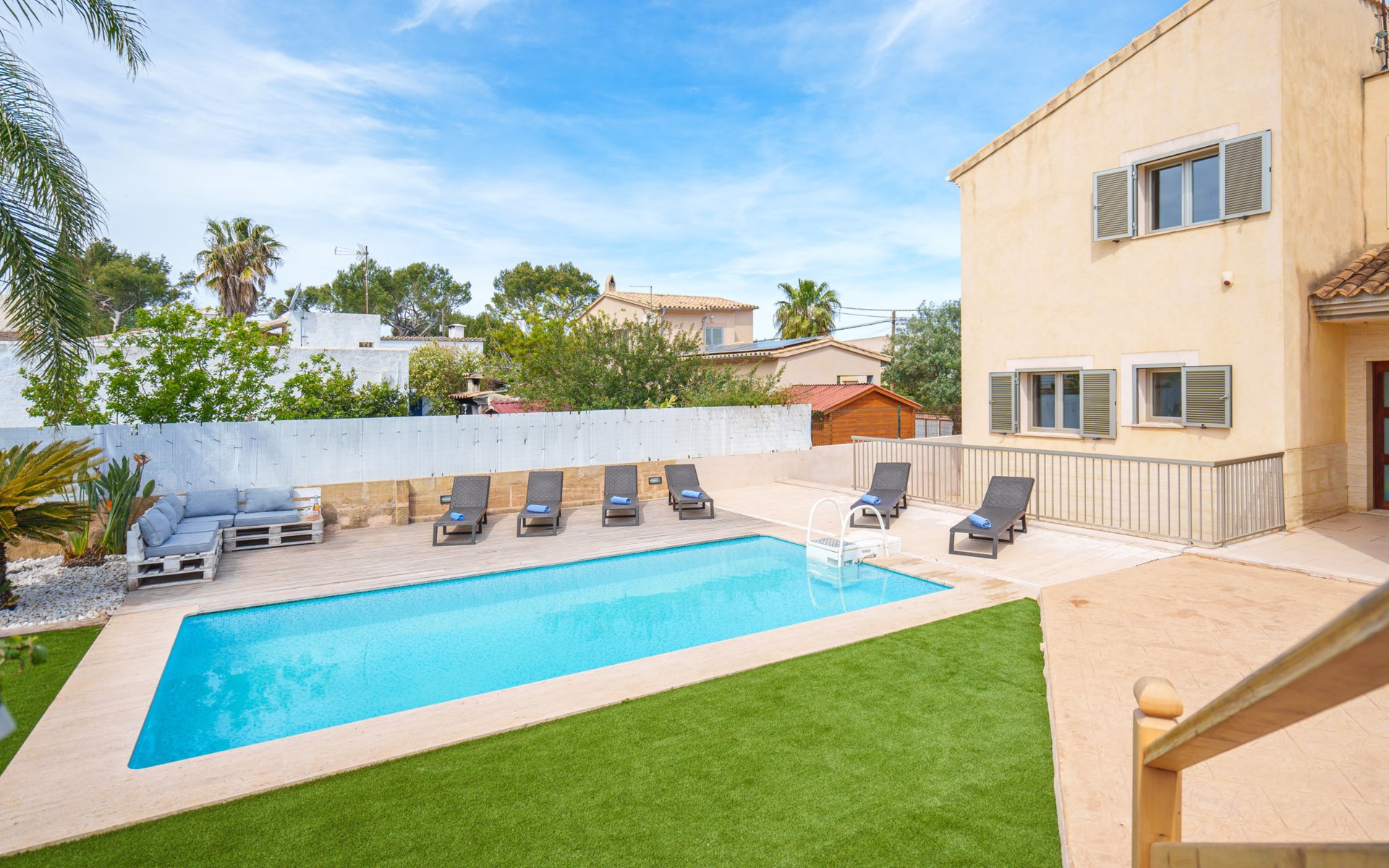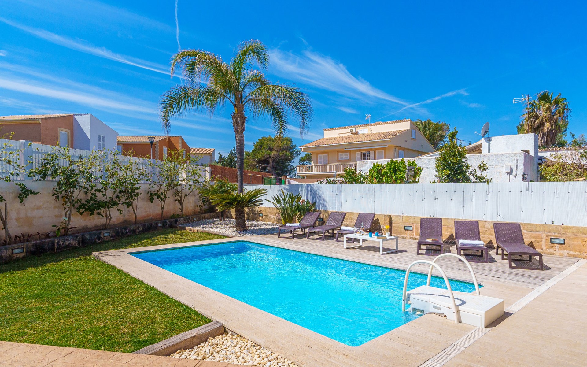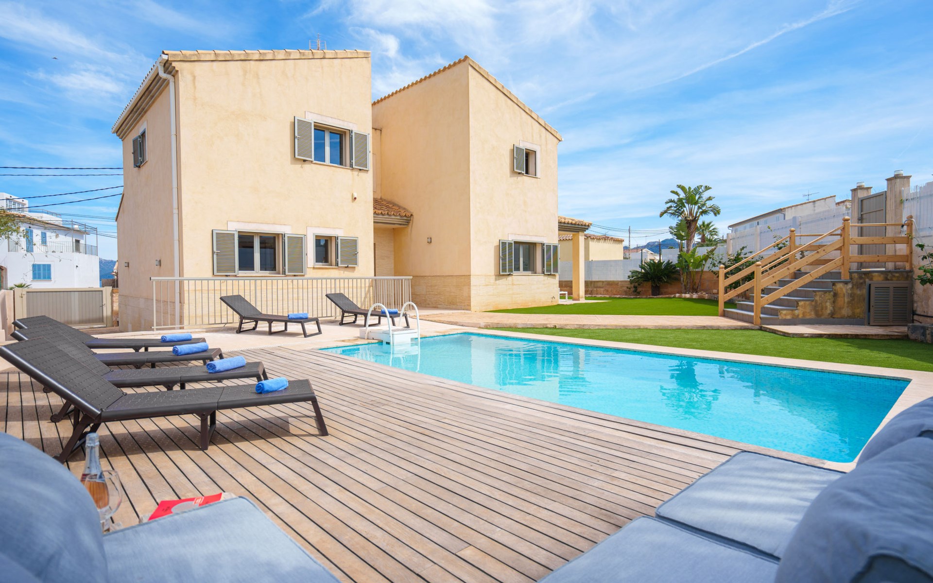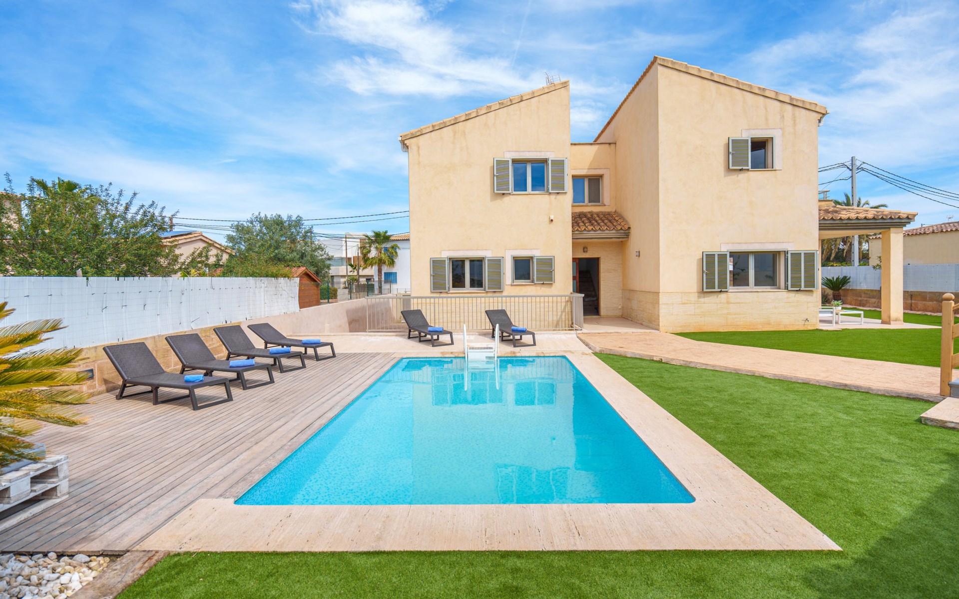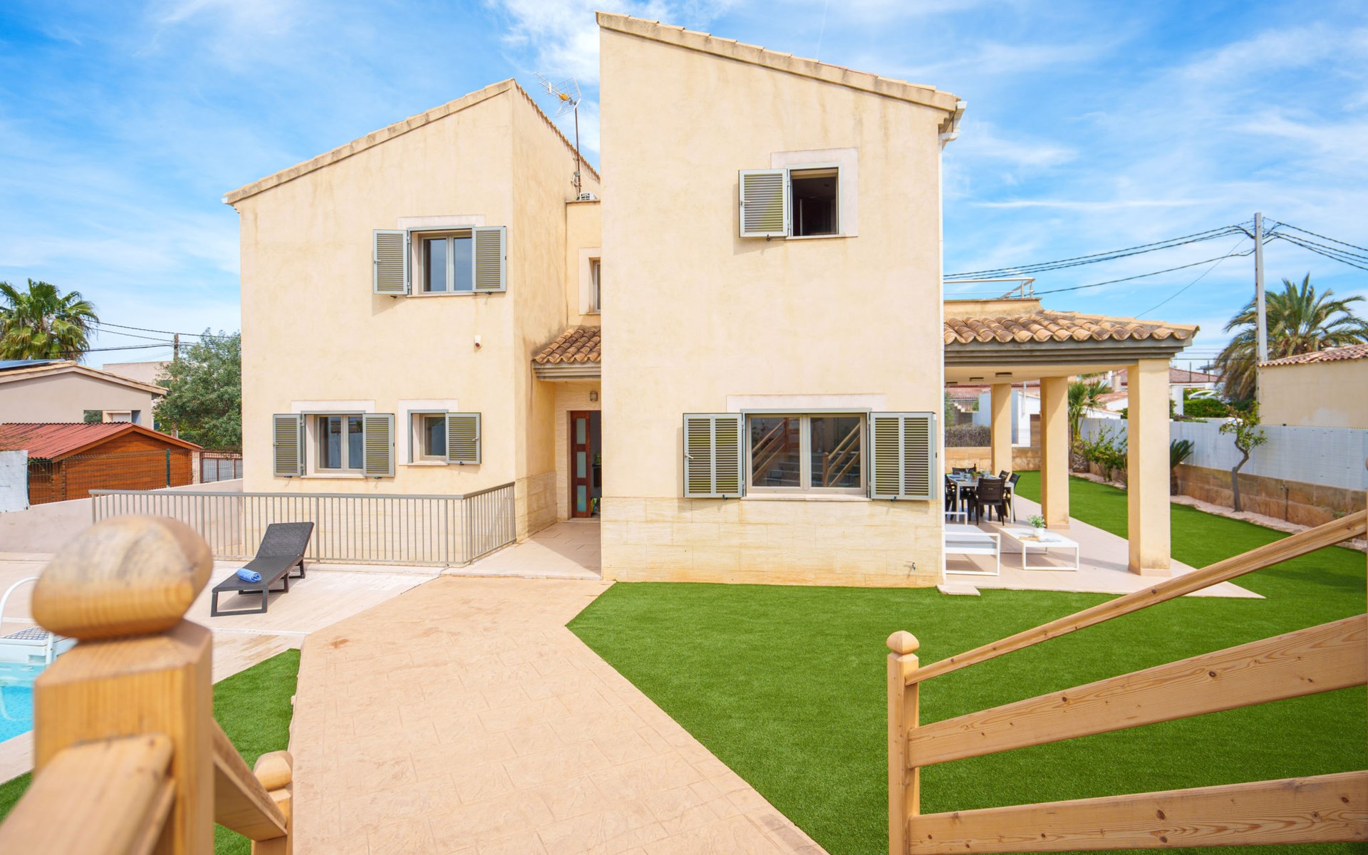 Barcarés 1 km von Alcúdia: Sehr grosse, sehr moderne, freistehende Villa "Son Jil", auf 2 Stockwerken, Baujahr 2005. Ruhige, sonnige Lage im Villenviertel, 2 km vom Waldrand, 60 m vom Meer, Strasse zu überqueren. Zur Alleinbenutzung: grosser, gepflegter Garten mit Rasen und Pflanzen, Schwimmbad eckig (8 x 4 m, 150 - 150 cm tief, saisonale Verfügbarkeit: 01.Jan. - 31.Dez.) mit Salzelektrolyse-Reinigungssystem. Aussendusche, Sitzplatz, Laube, Pergola, Gartenmöbel, Grill. Im Hause: Internetzugang, Wireless LAN, Zentralheizung, Klimaanlage, Waschmaschine. Öffentliches Parkhaus, öffentliche Parkplätze auf der Strasse. Einkaufsgeschäft 1 km, Supermarkt 1.2 km, Einkaufszentrum 45 km, Restaurant 160 m, Bar, Fußgängerzone 50 m, Zentrum zu Fuss in 15 Minuten erreichbar, Bushaltestelle 1.5 km, Fähre 3 km, Sandstrand "Platja Es Morer Vermell" 550 m, Felsstrand "Platja Es Barcarés" 60 m. Sporthafen 250 m, Jacht-Hafen 3 km, Golfplatz (18 Loch) 6 km, Tennis 2.5 km, Reitstall 2.5 km, Sportzentrum 2.5 km, Wanderwege ab Haus 1 km, Radweg 700 m, Kinderspielplatz 500 m. Nahe gelegene Sehenswürdigkeiten: Ermita de la Victoria, Barcarés, Manresa, Sa Marina, Es Malpas. Ciutat Romana de Pollentia, Alcudia. Port d'Alcúdia, Port de Pollença - Pollença, North Beaches. Wandergebiete: Sa Talaia, Es Puig de Sant Martí, Serra Tramuntana Pollença. Bitte beachten: geeignet für Familien, geeignet für Senioren. Objekt geeignet für 8 Erwachsene Jugendgruppen nur auf Anfrage. Flugplatz 60 km vom Haus.